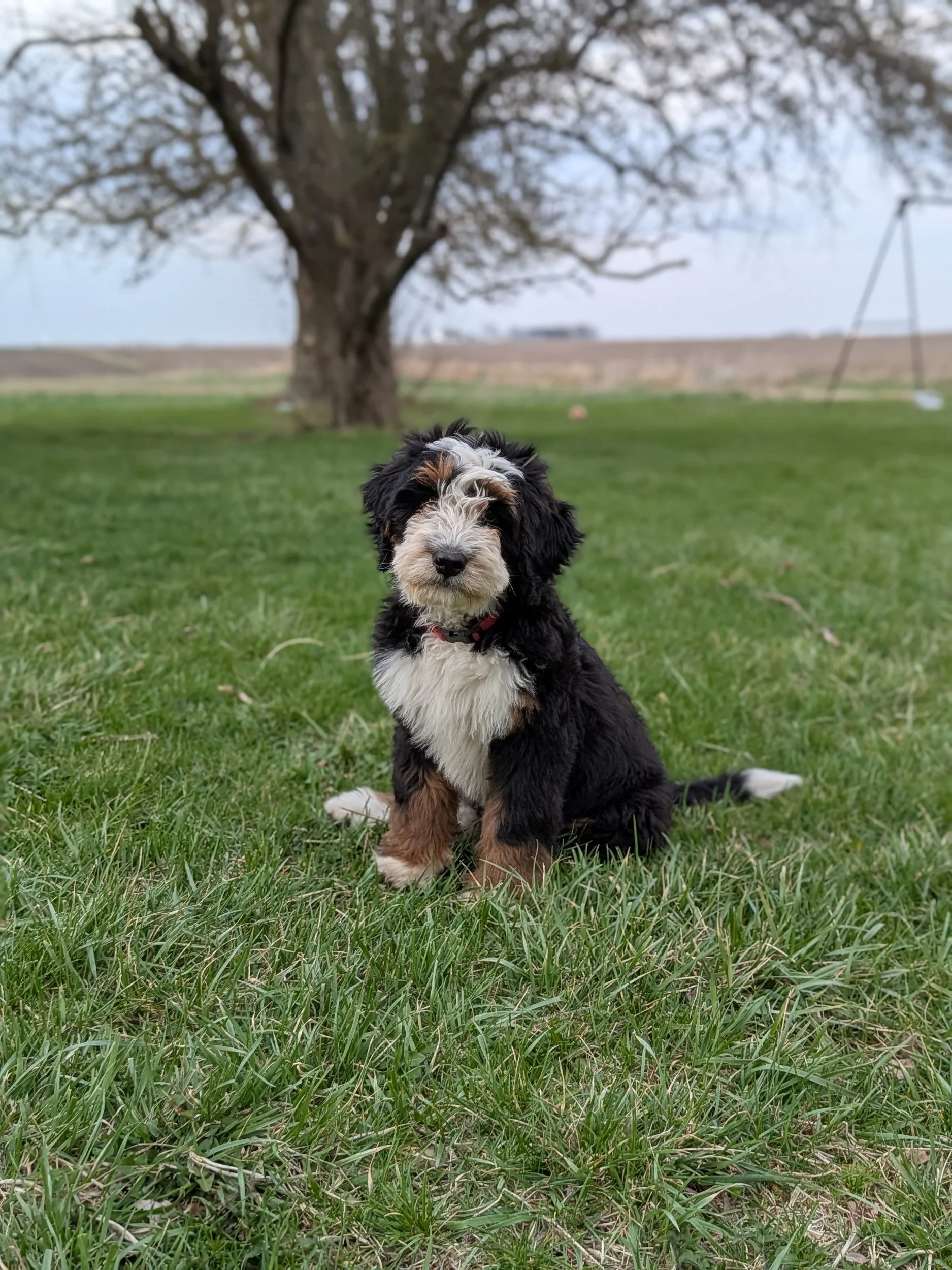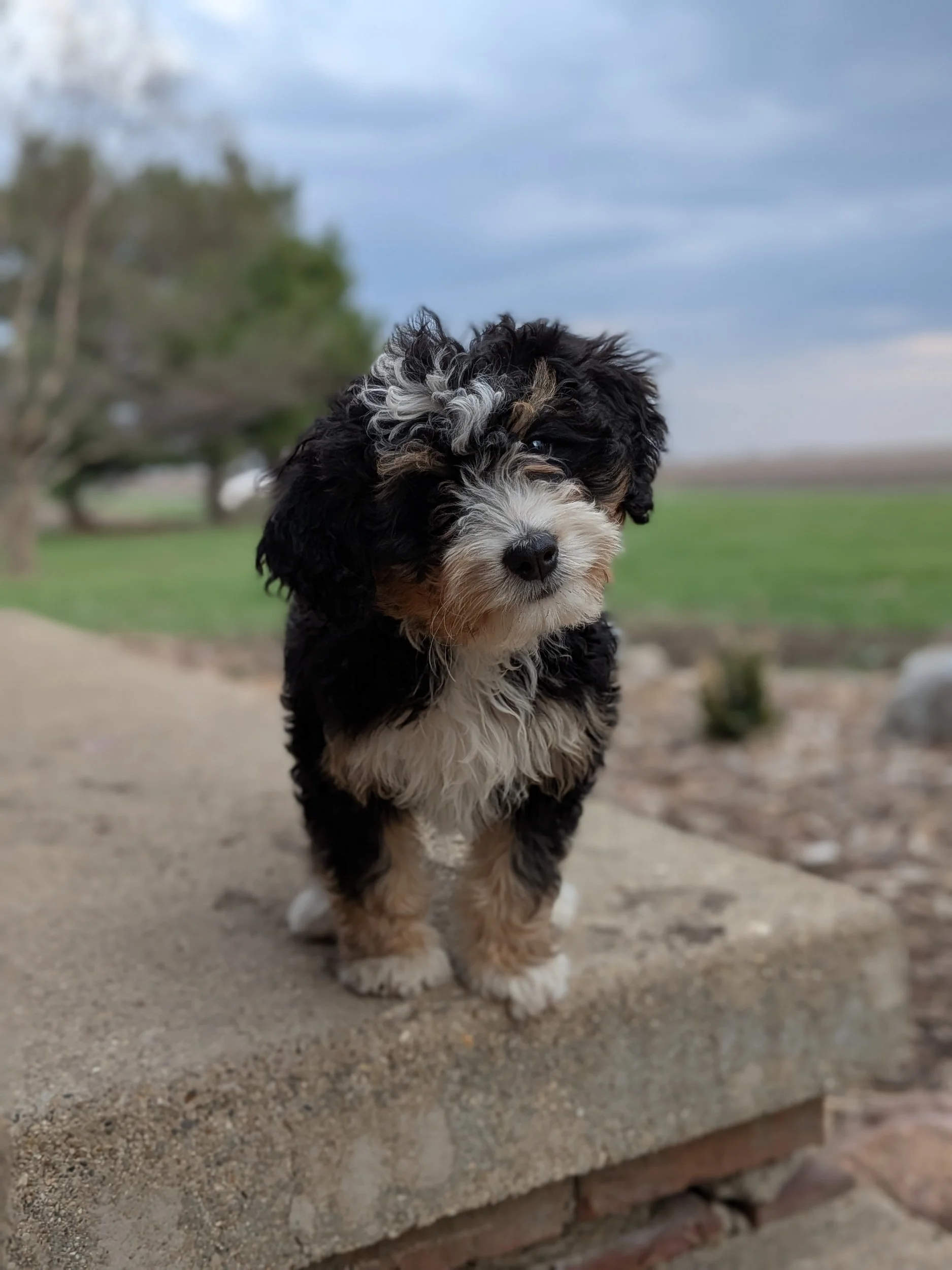 Paris is a sweet/spunky mini Bernedoodle! She isn’t going to be a large dog, which makes her perfect for a family that wants a dog that can sleep in your lap and not take up all the space on the couch. Her curly coat is non-shedding and looks like a teddy bear when it’s brushed.