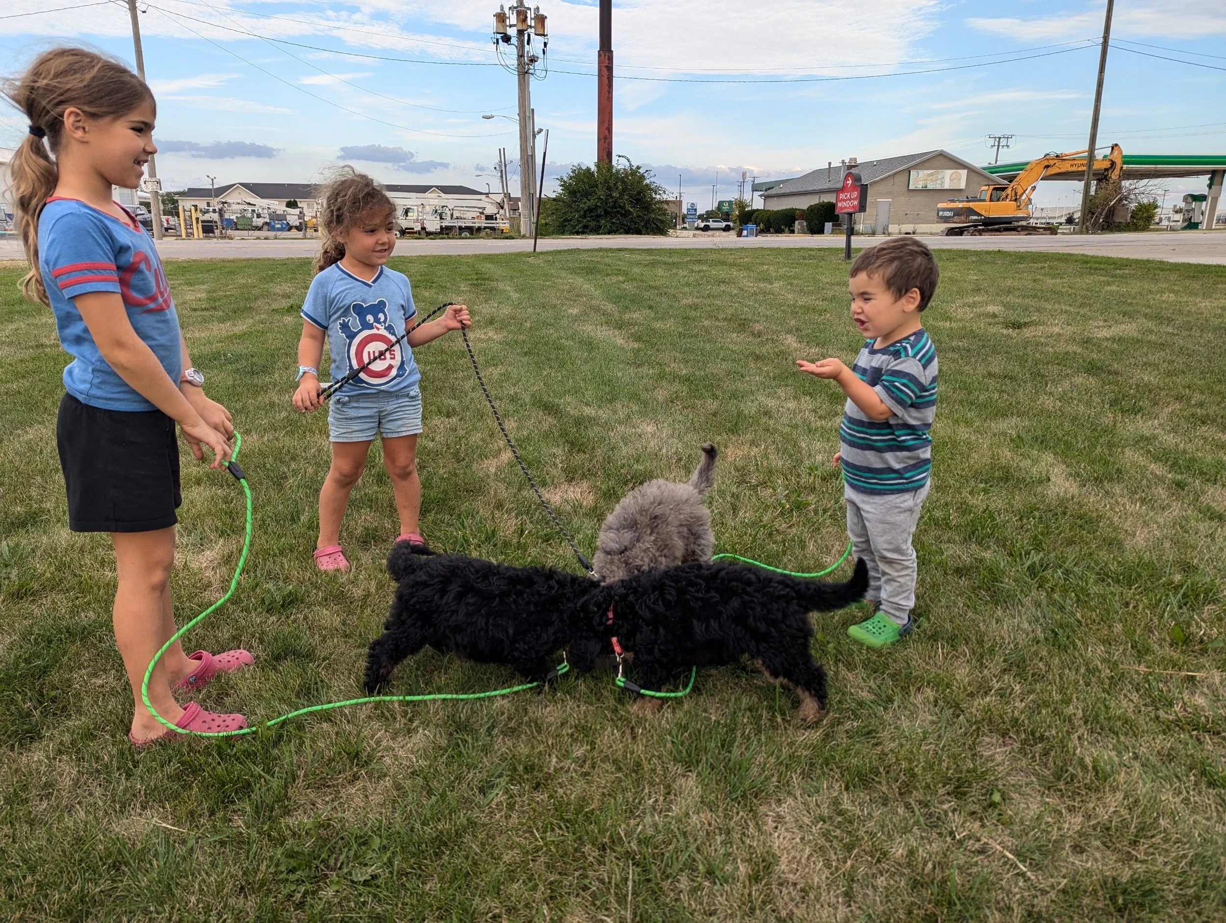 So, we packed up four puppies, our five kids, lots of snacks, and some good movies for 8 hours total in the car. Brian wasn’t very pleased about taking so many puppies, but I was confident it would be ok. At our first rest stop, I began to understand his hesitancy. Taking four puppies out to go potty that have never walked on a leash is quite the affair! Thankfully, we had a lot of help from Jordan, Riley, and Blair. Walter tried to help, but we couldn’t completely trust him with a leash as he is only two.