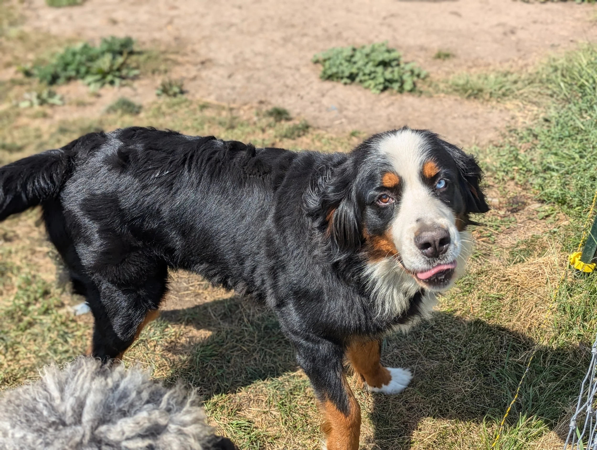 Minka is one of our beautiful Bernese Mountain Dogs. Her one blue eye and impressive size make her one of our most striking-looking dogs and her loving temperament makes her the friend of everyone she meets. She has a flaw, though: she likes to jump out of fences. Her height and athleticism (unlike most other Bernese Mountain Dogs) mean she can scale almost any fence with ease. She looks like a deer leaping up and over five-foot barriers like it’s nothing.