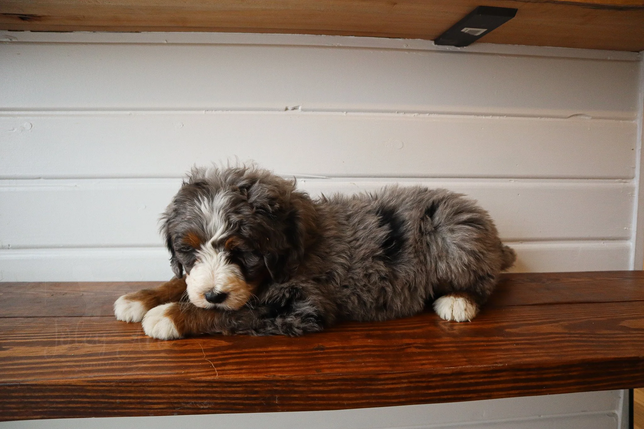 Baklava is a stunning male F1 Bernedoodle puppy for sale in Carlock, IL. He loves to snuggle, romp, and catch puppy snoozes. Make Jerry a member of your family and he will join right in on the fun! Plus, Baklava flaunts a beautiful merle coat and comes from parents of good-natured and lovable personalities. Make Baklava yours and he will arrive at your door family raised, vaccinated, and microchipped. We are delighted to present elite F1 Bernedoodle puppies and strive to match them with loving homes. If you’re ready for a bundle of cuteness, or if you have additional questions, click the button below: