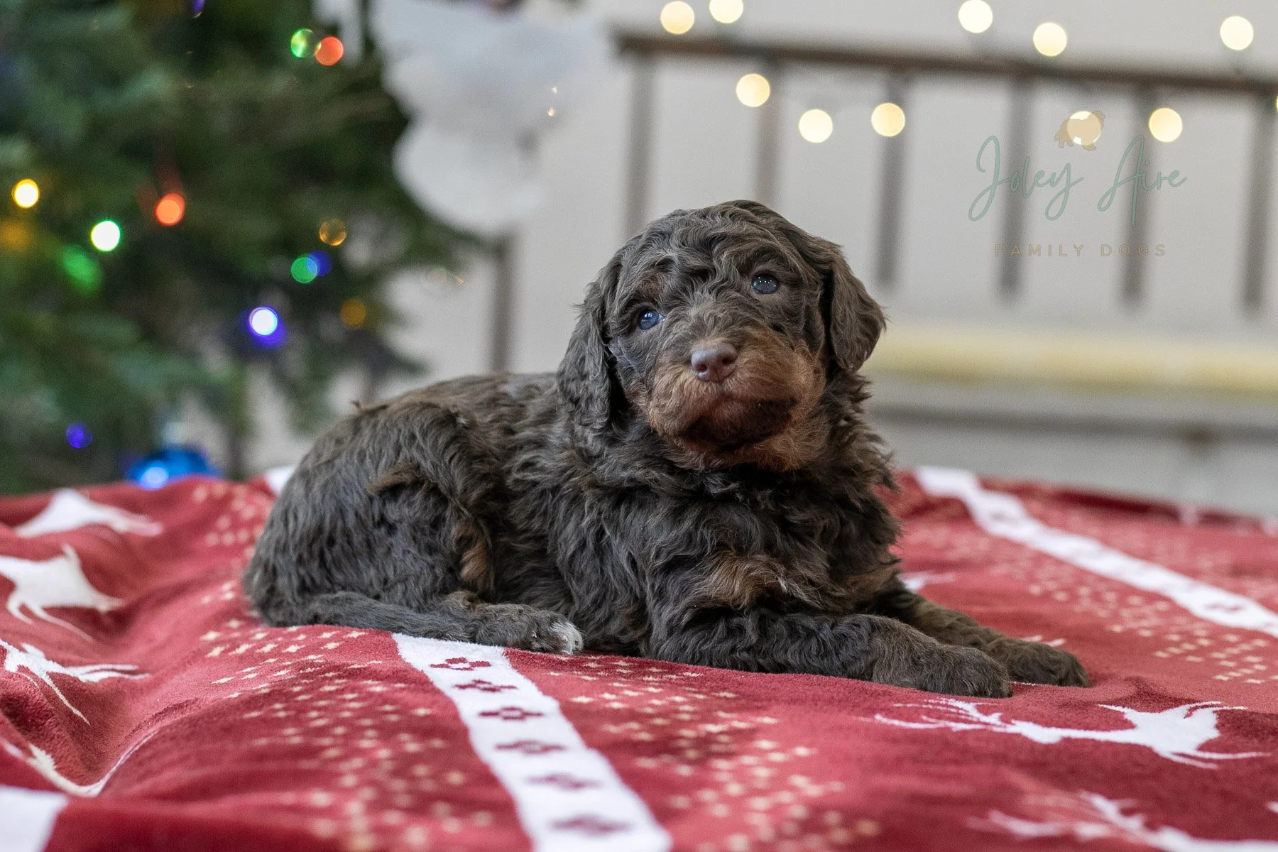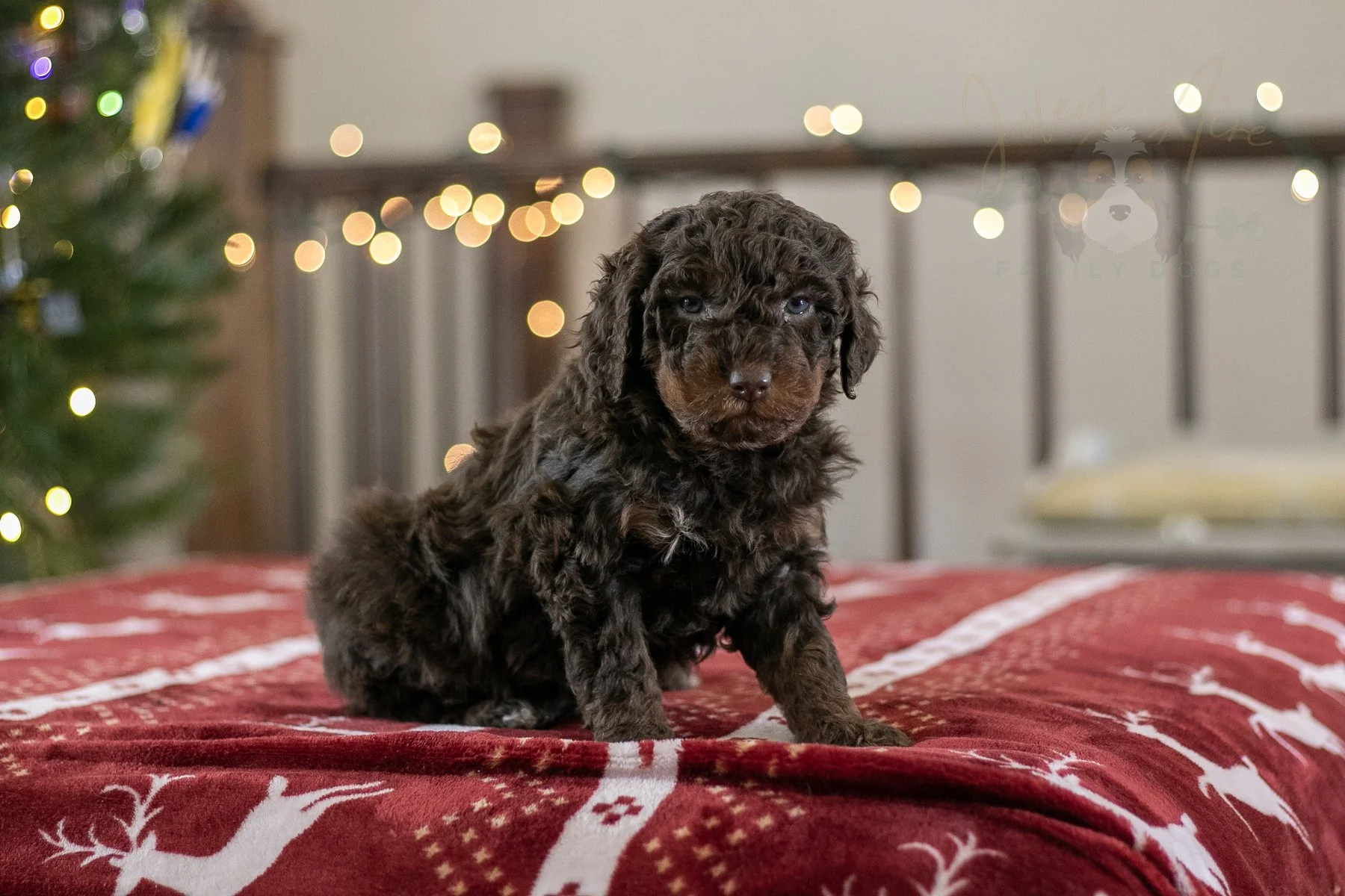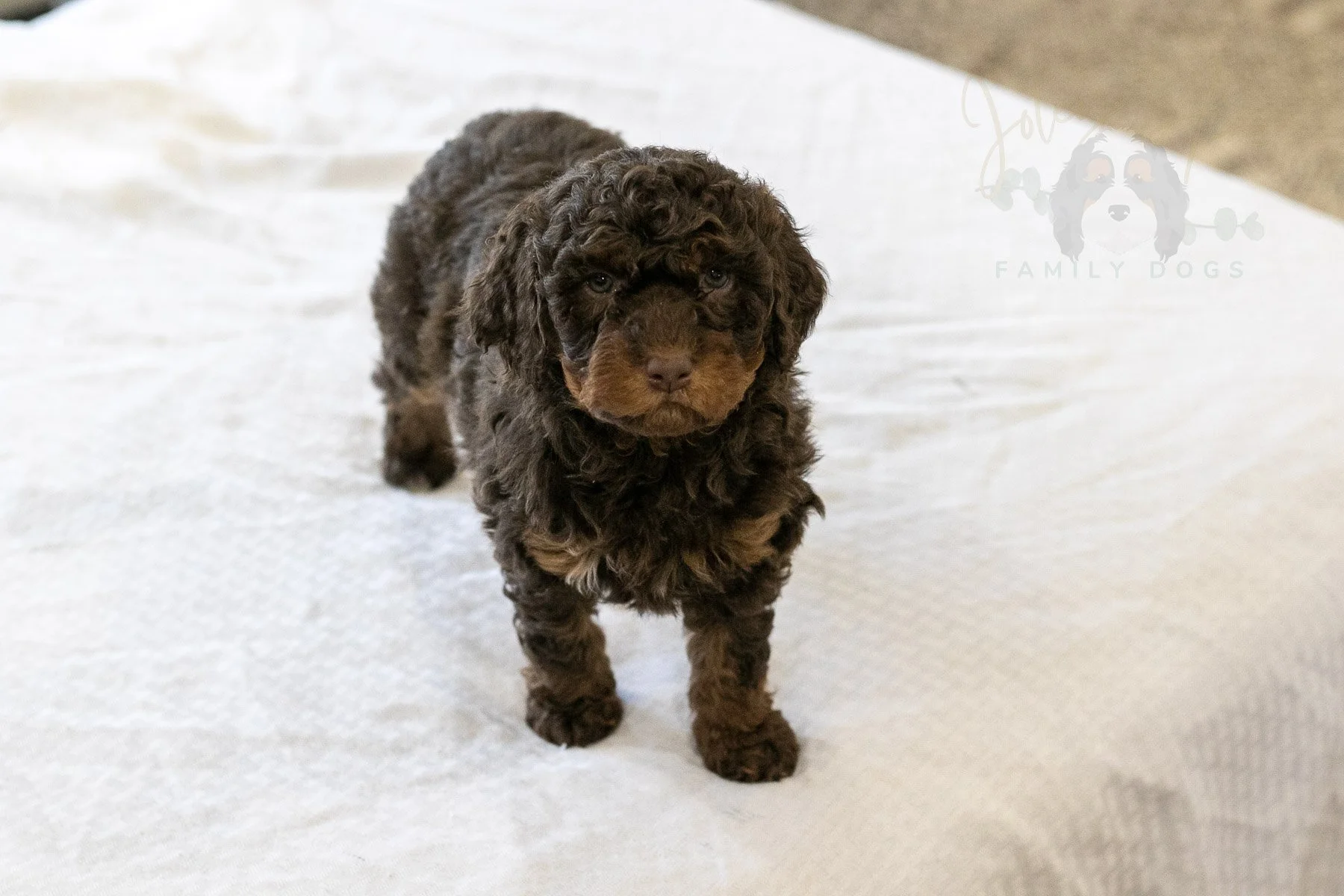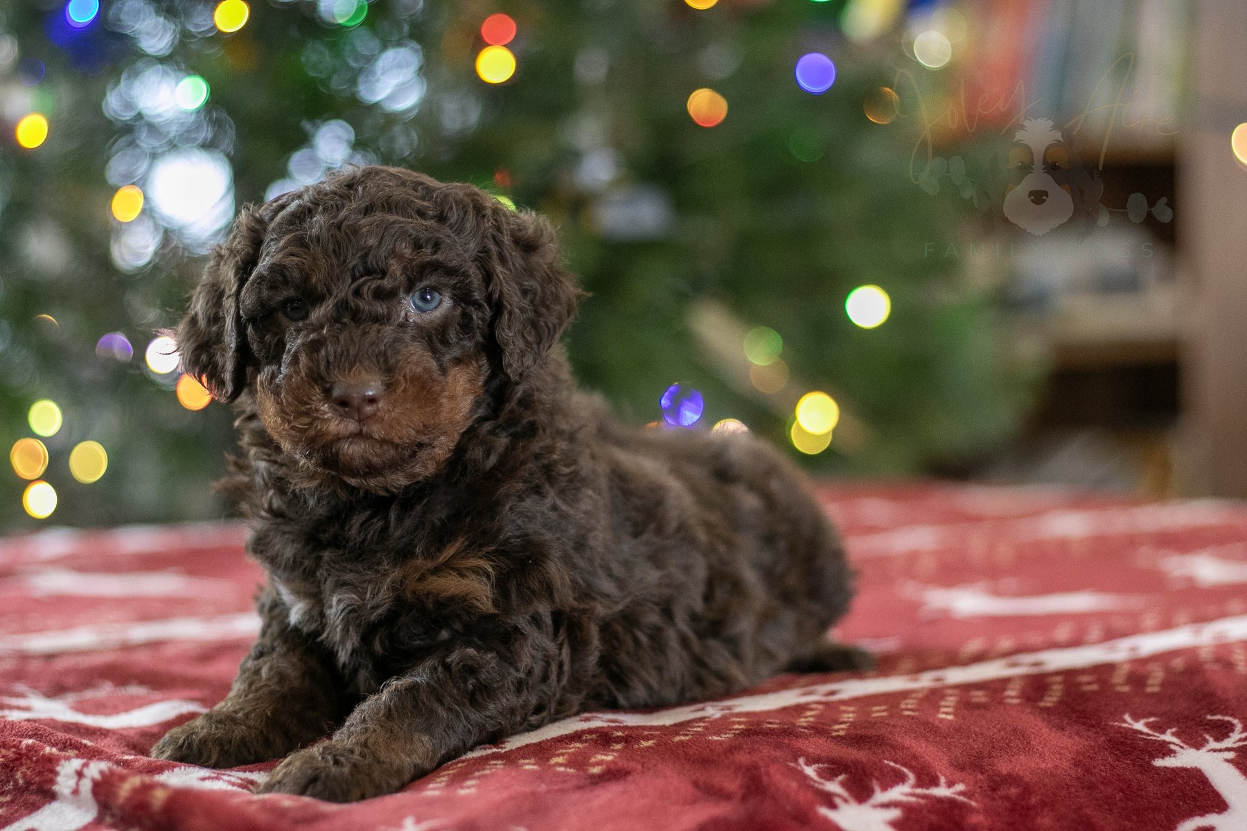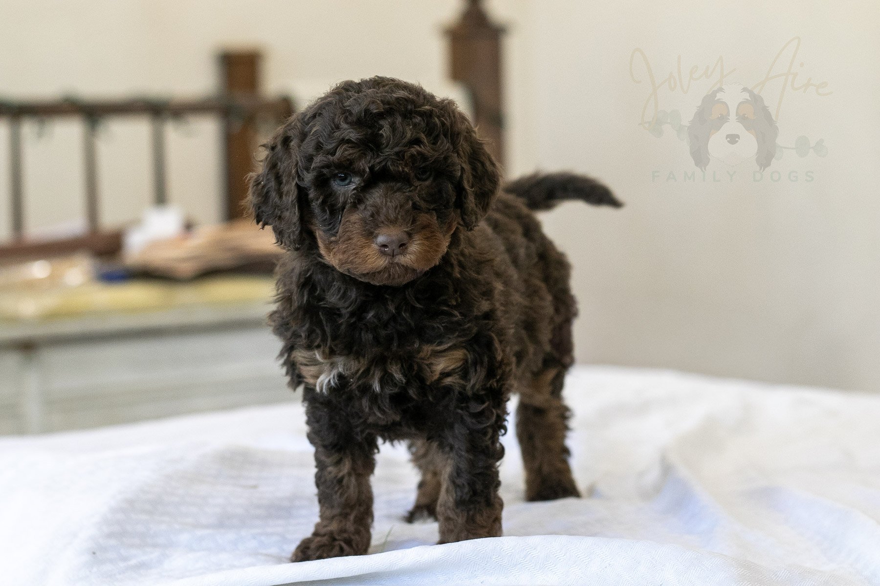 Behold, the name Arwen is truly fitting for this enchanting female Chocolate Phantom Bernedoodle puppy, her rich coat swirling with hues of deep chocolate and phantom markings as graceful as twilight shadows. This delightful F1b Bernedoodle, three parts Poodle to one part Bernese, is destined to grow to a gentle stature of forty to fifty pounds—just the perfect size for a loving companion with a heart as kind as hers.