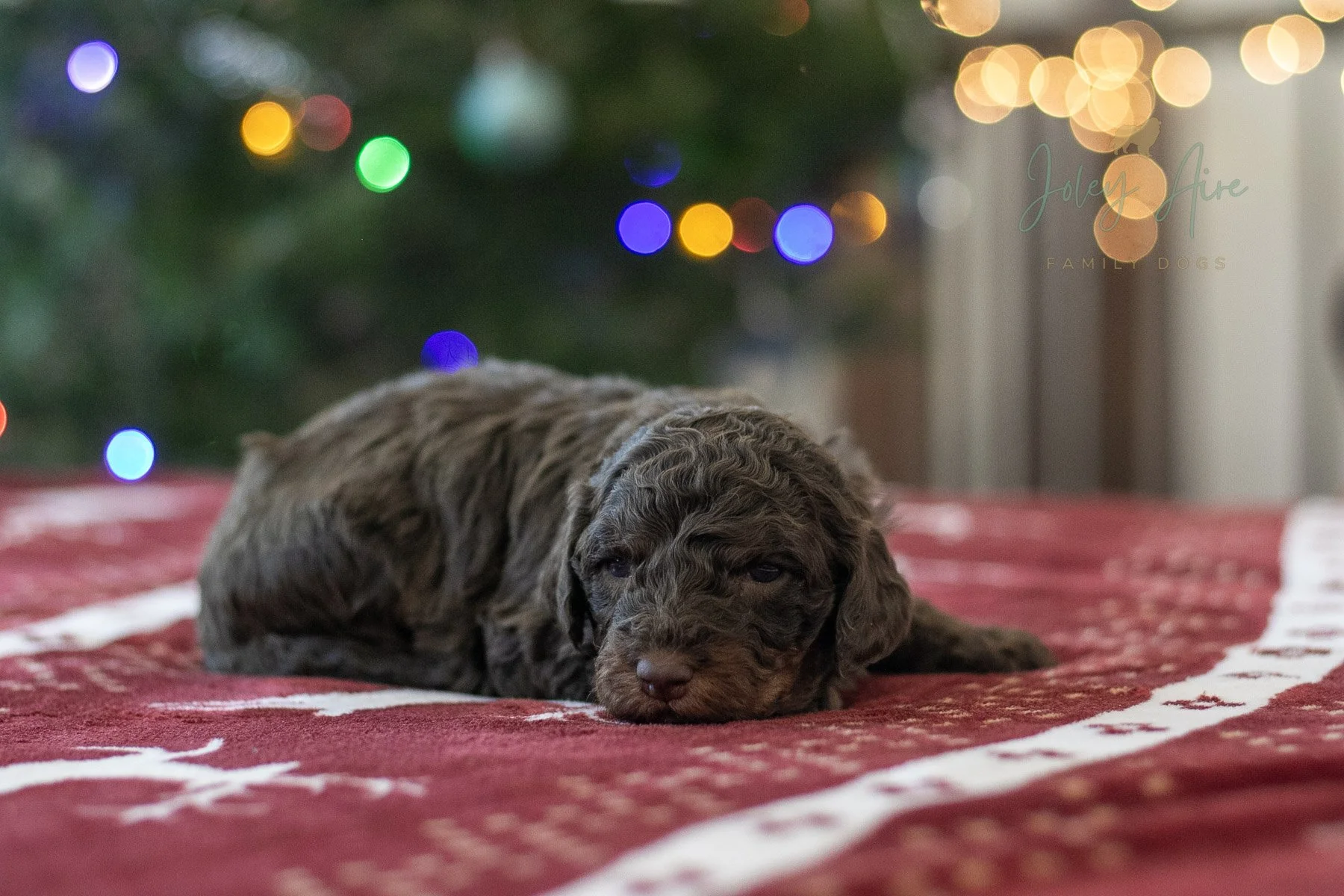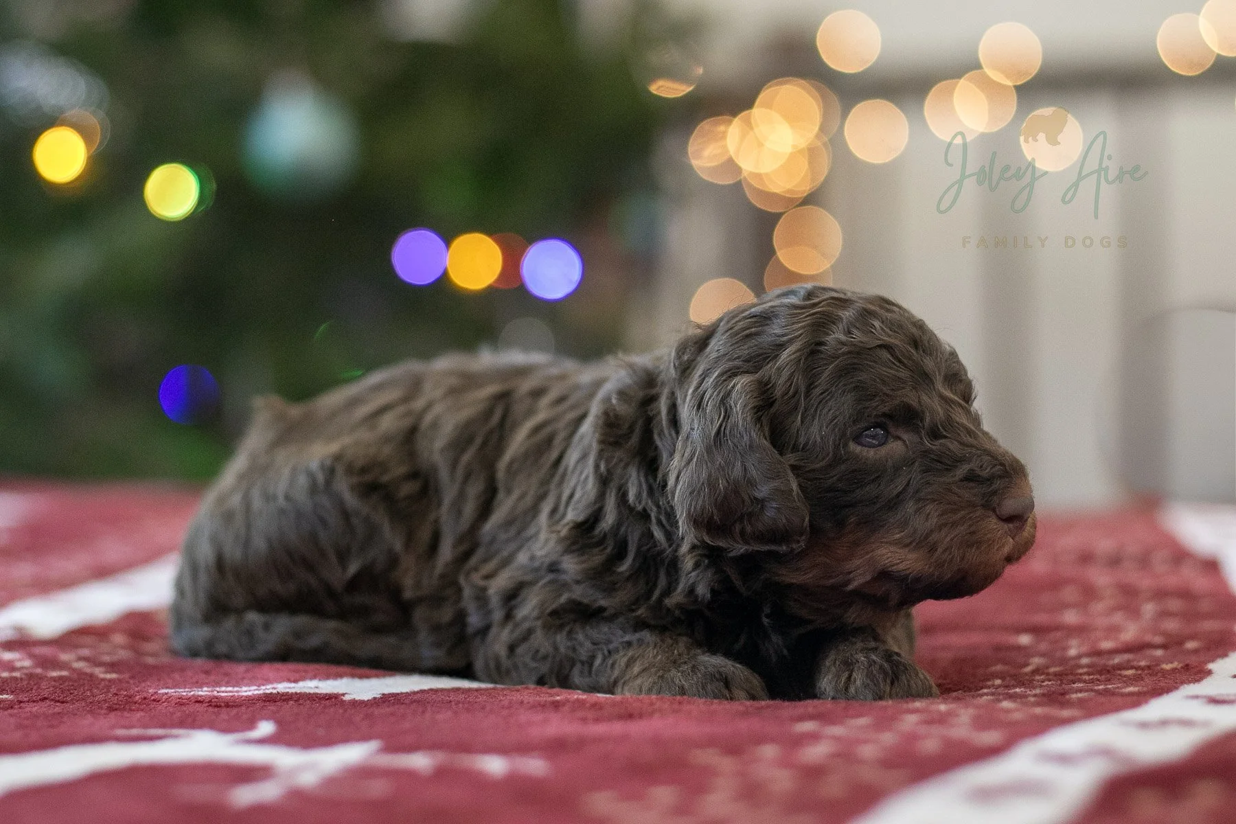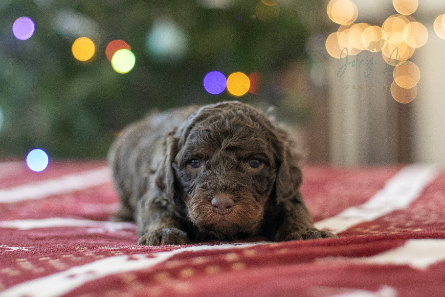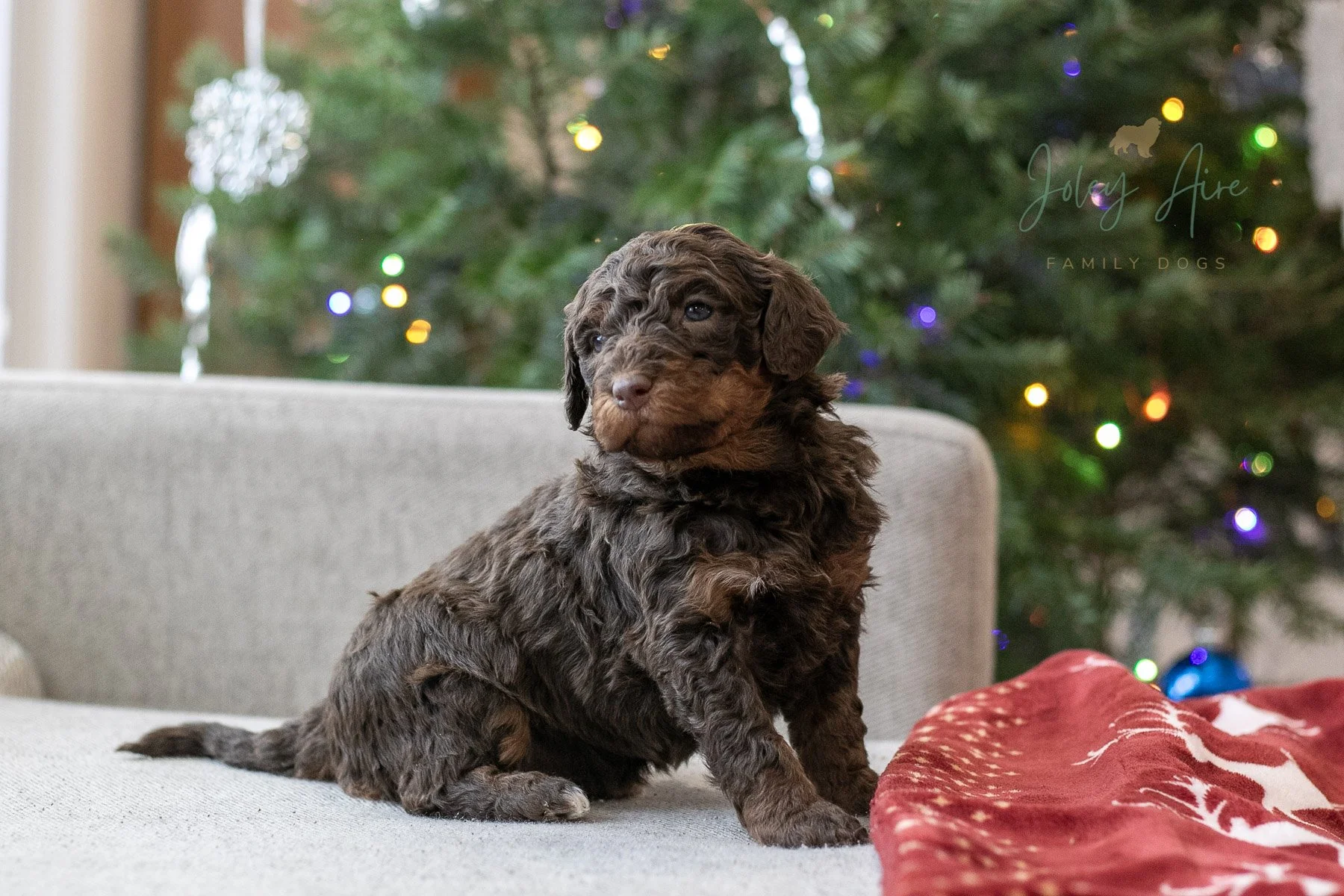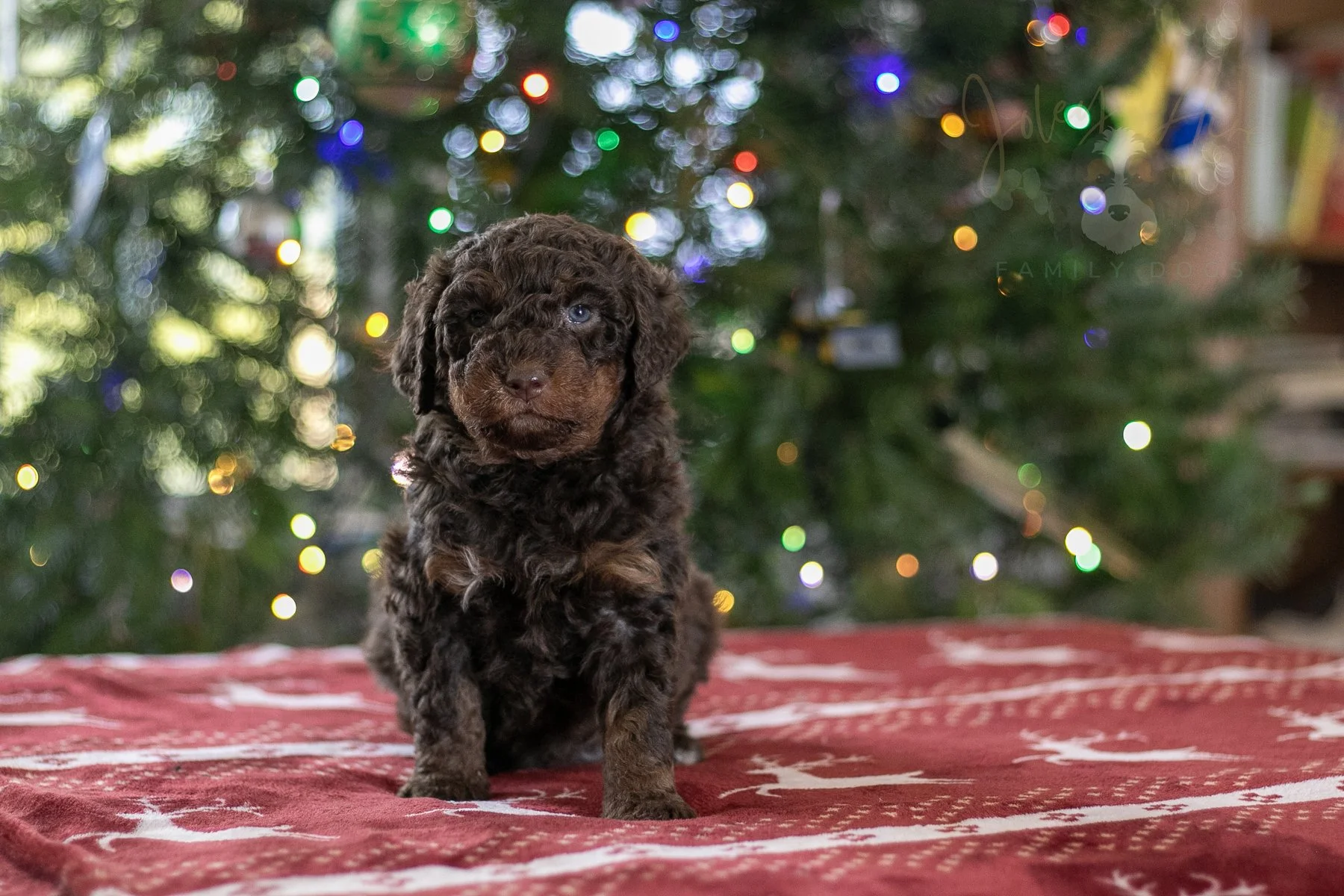 Behold, the name Arwen is truly fitting for this enchanting female Chocolate Phantom Bernedoodle puppy, her rich coat swirling with hues of deep chocolate and phantom markings as graceful as twilight shadows. This delightful F1b Bernedoodle, three parts Poodle to one part Bernese, is destined to grow to a gentle stature of forty to fifty pounds—just the perfect size for a loving companion with a heart as kind as hers.
