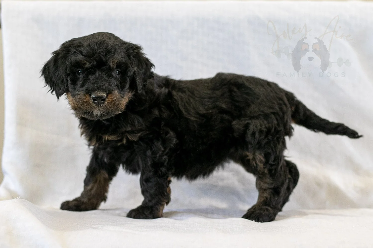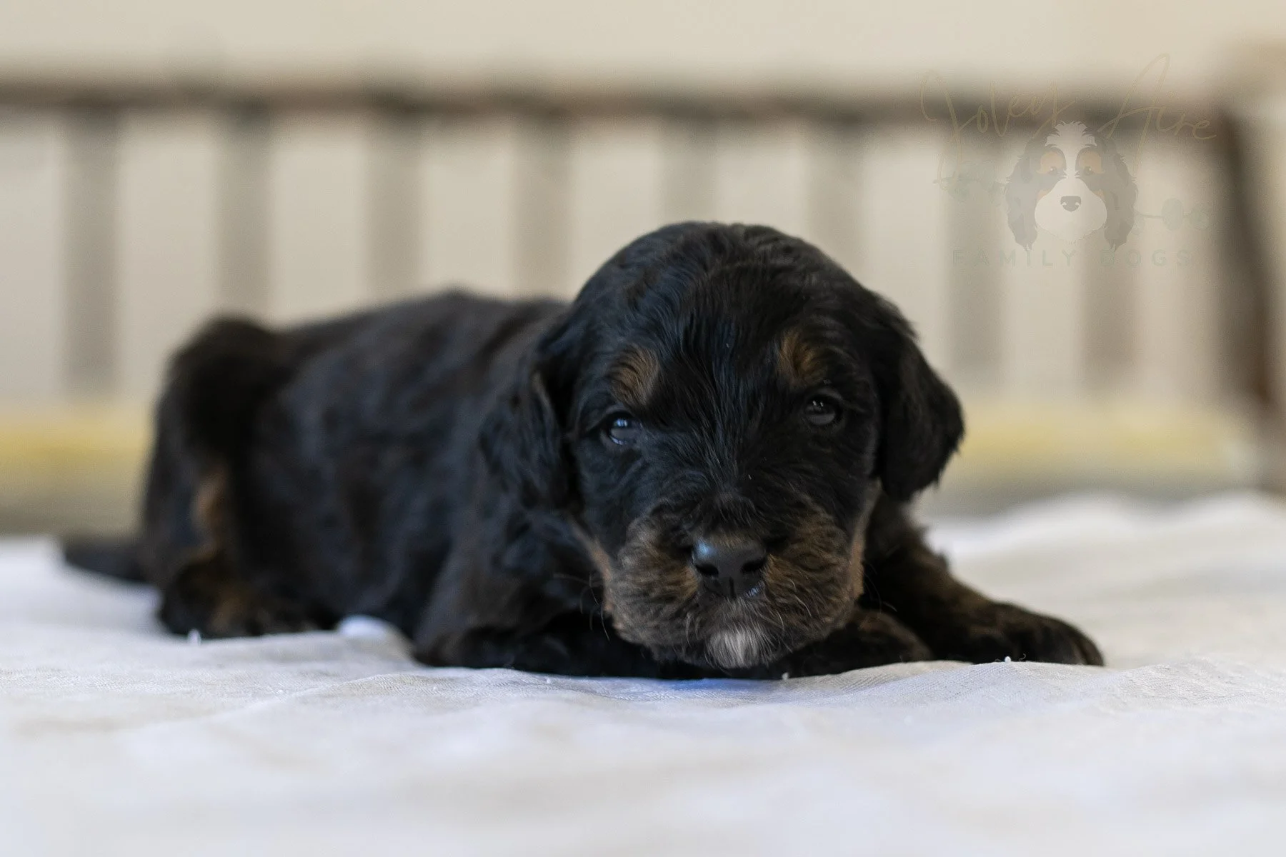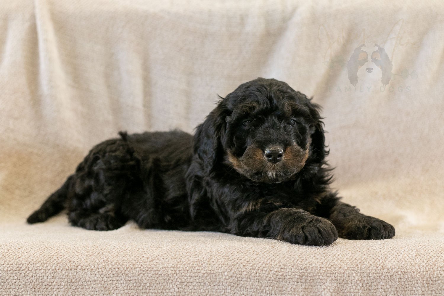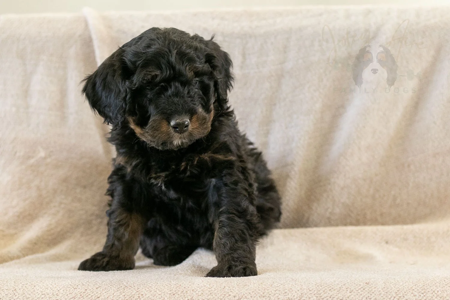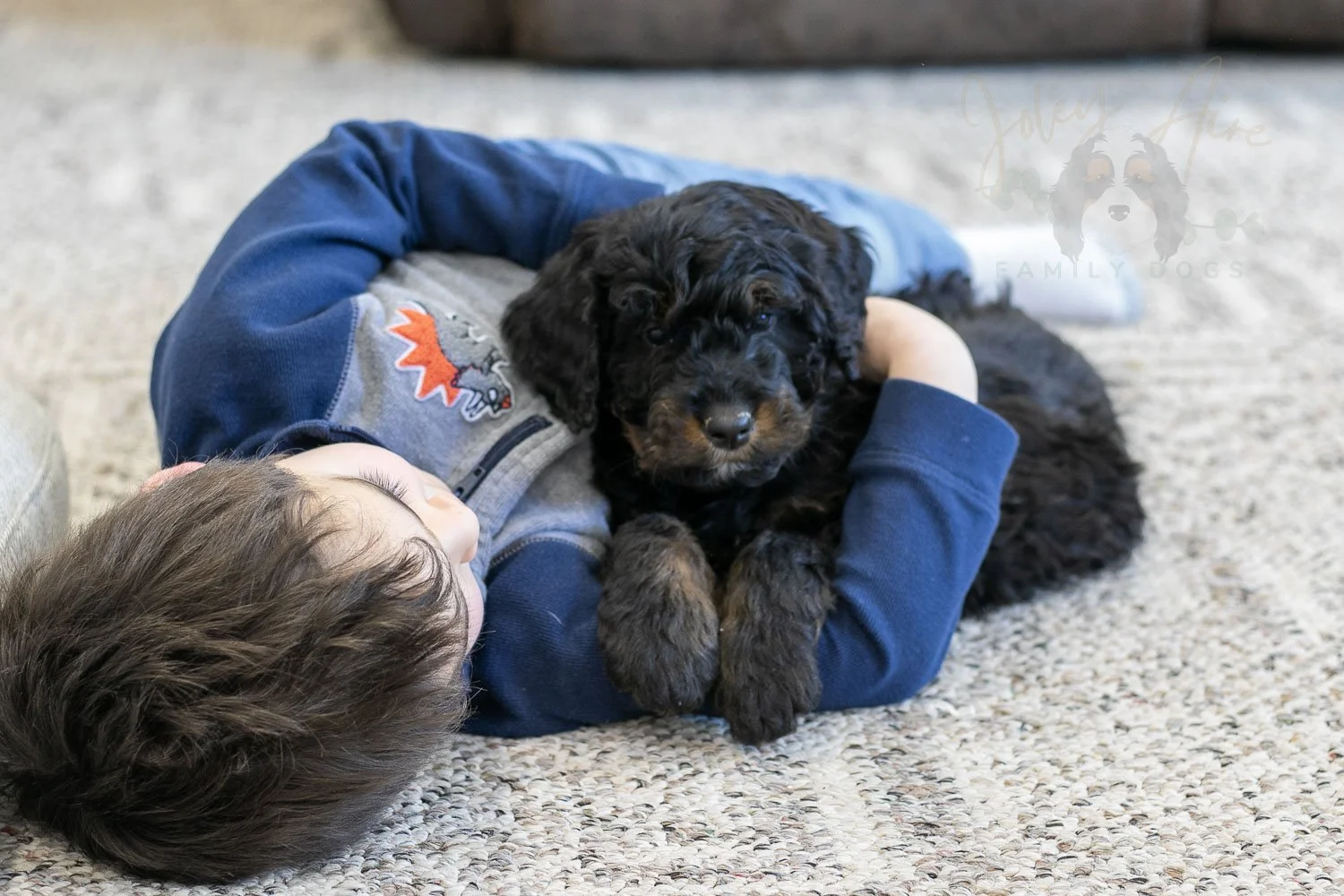 Raised in our home with children and everyday activity, Aurora is receiving intentional early socialization that prepares her for a smooth transition into family life. She is expected to mature into a large, tall Bernedoodle with a calm, loving temperament.