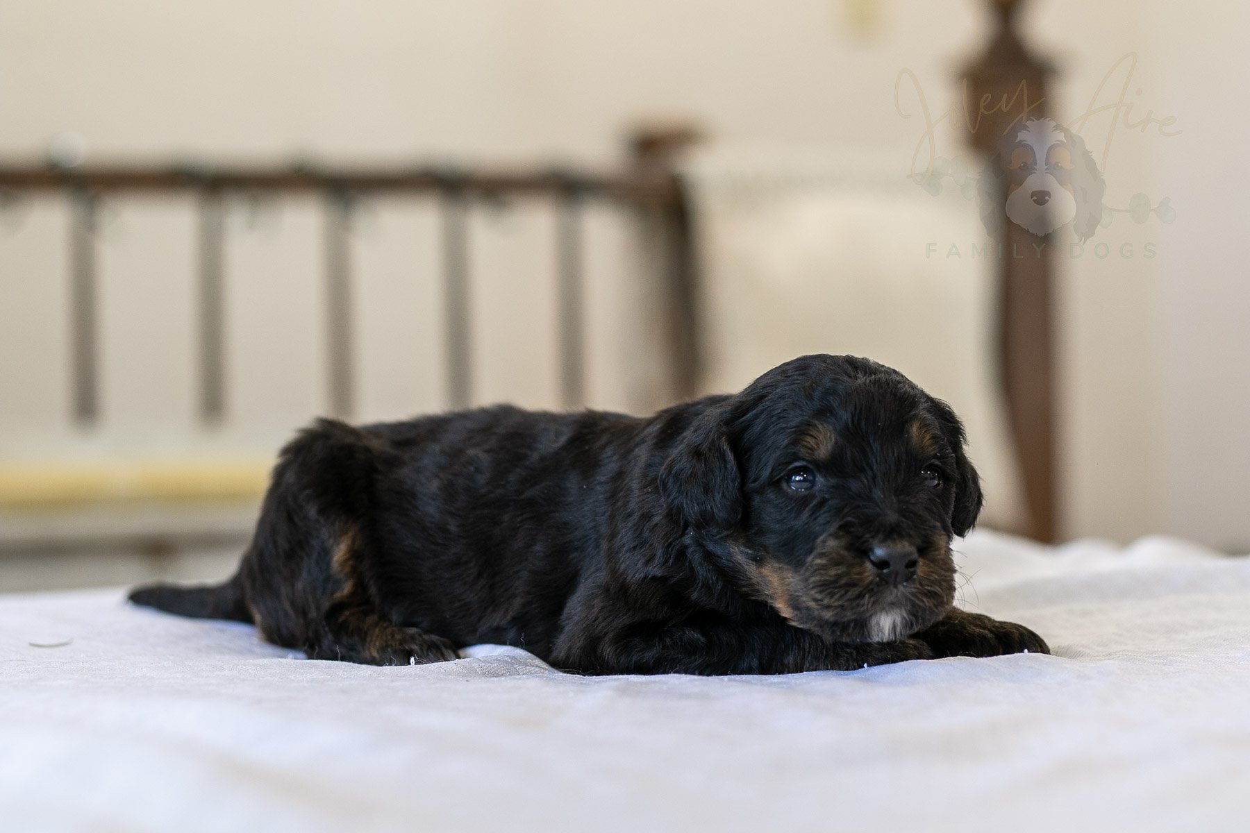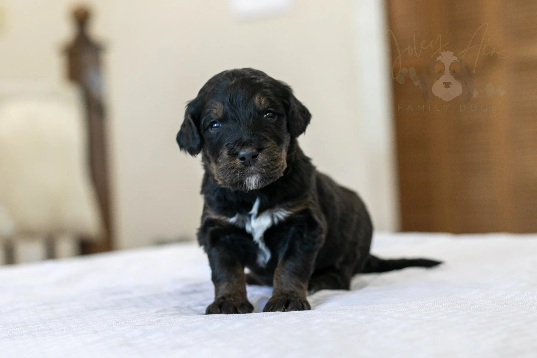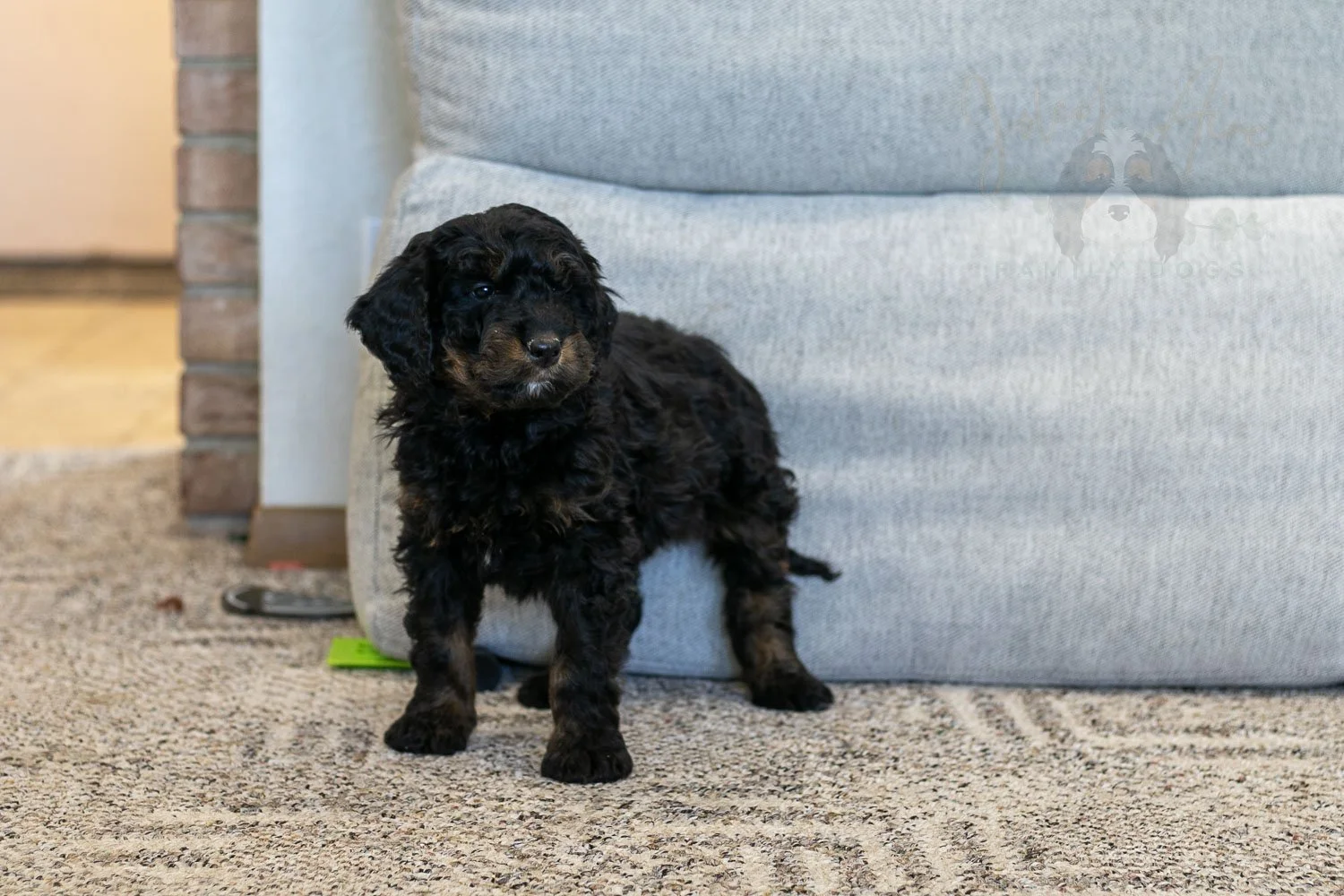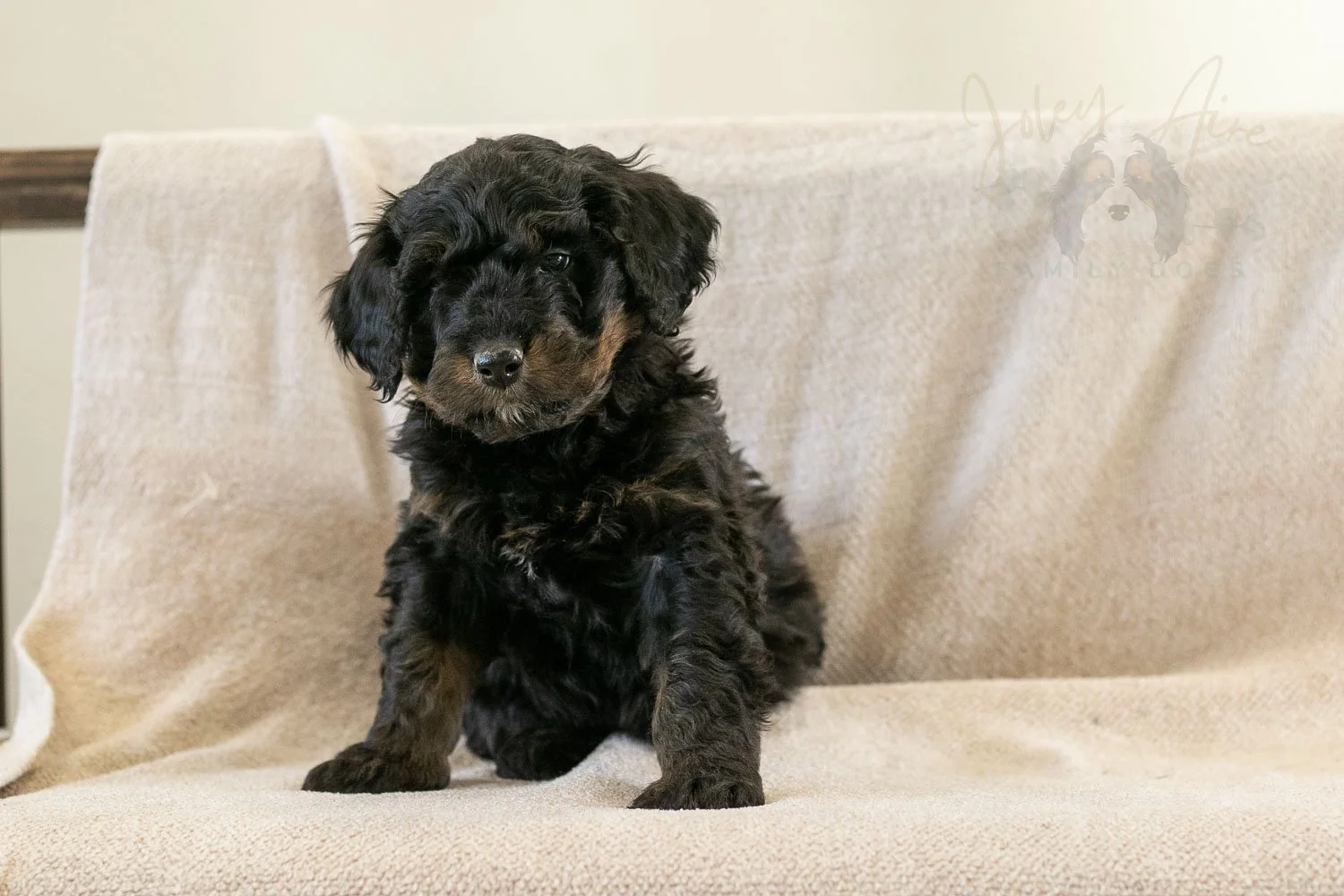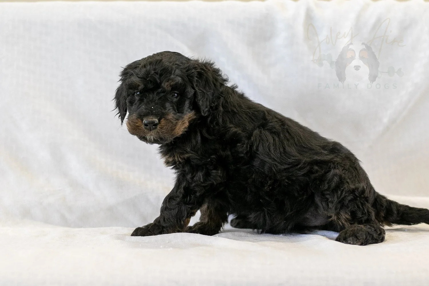 Raised in our home with children and everyday activity, Aurora is receiving intentional early socialization that prepares her for a smooth transition into family life. She is expected to mature into a large, tall Bernedoodle with a calm, loving temperament.