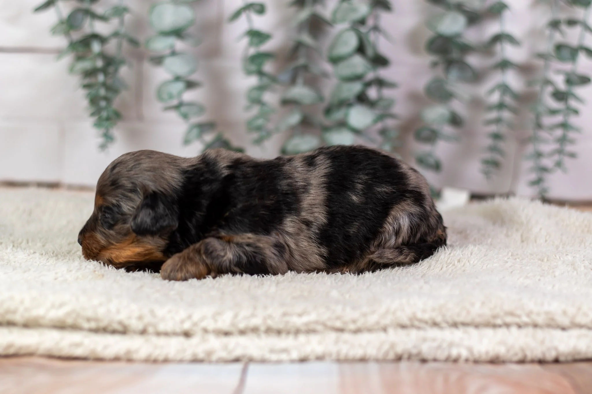 Meet Basil, the blue merle phantom male Bernedoodle runt of the litter, who has shown incredible spirit and resilience. Despite his smaller size, Basil is a fighter with a heart full of determination. His playful personality and affectionate nature make him a delightful companion, and he has been thriving as he continues to grow stronger every day. With his striking coat and charming demeanor, Basil is ready to find his forever home and will be available for adoption in July. Don't miss the chance to welcome this little warrior into your family!