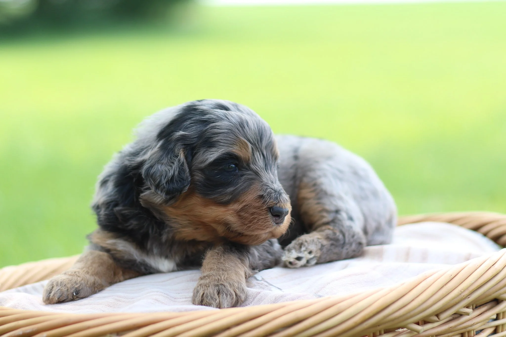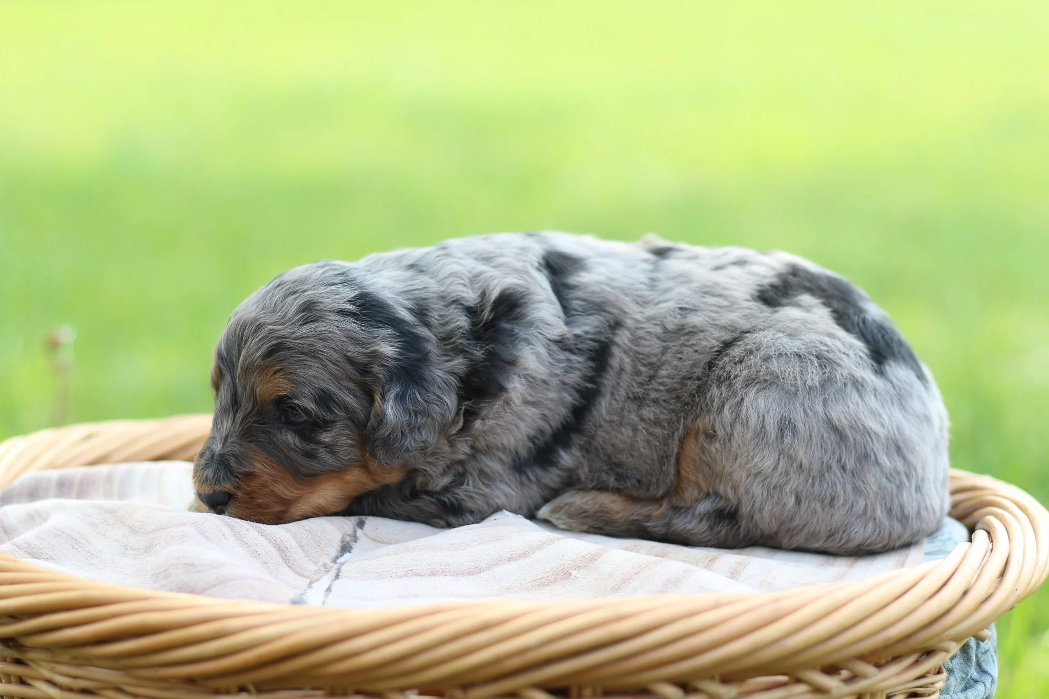 Meet Chive, the large phantom merle male Bernedoodle of this litter, who has shown incredible charisma and charm. With his impressive size, Chive is a gentle giant with a heart full of love. His playful personality and affectionate nature make him a delightful companion, and he is thriving daily, growing into an even more handsome pup. With his striking coat and friendly demeanor, Chive is ready to find his forever home and will be available for adoption in July. Don't miss the chance to welcome this lovable companion into your family!