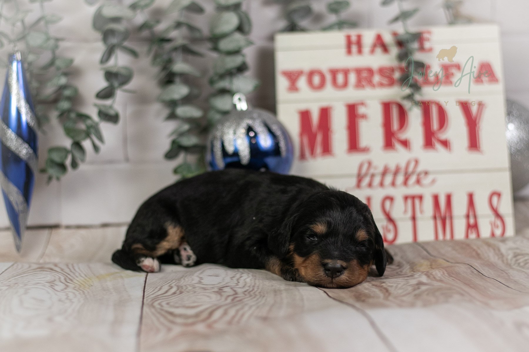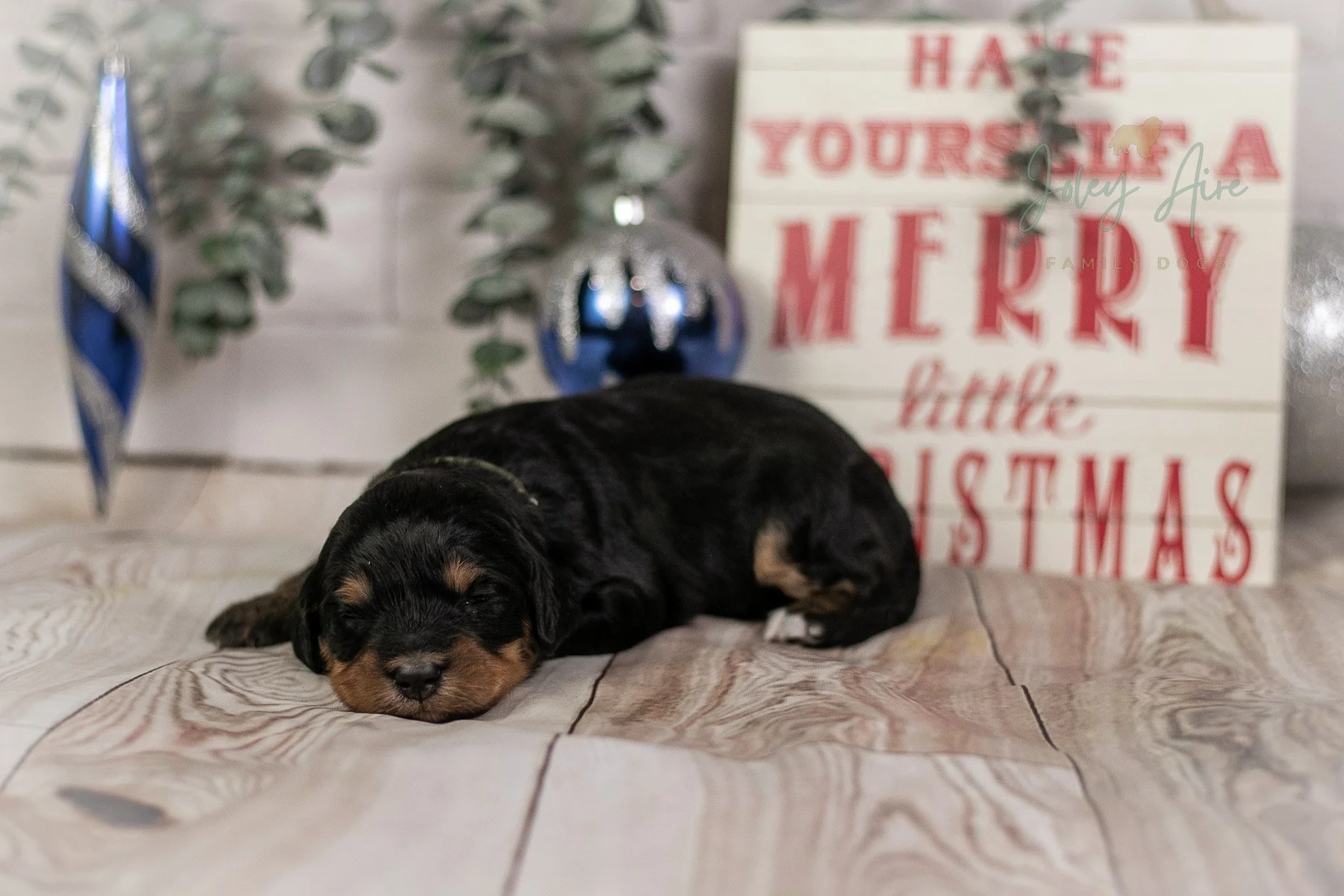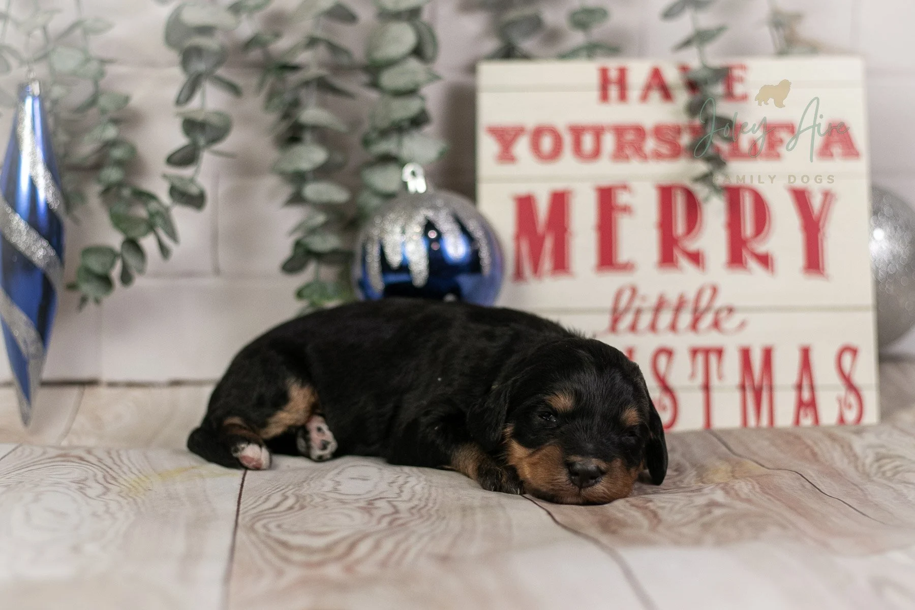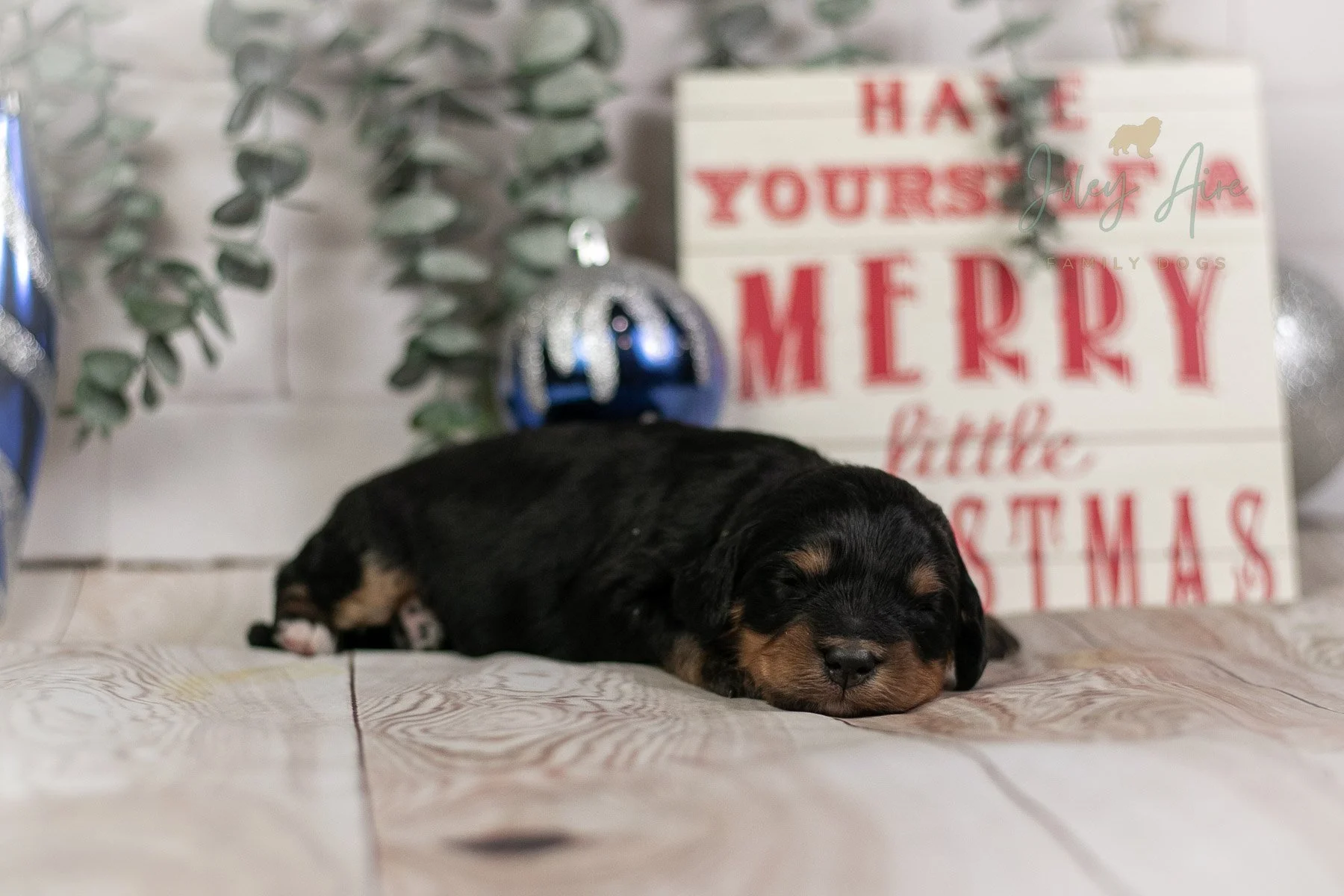 This beautiful little lady is Elbrus, an adorable female phantom Bernedoodle puppy with charming white back paws and a delicate splash of white on her chest. Her gorgeous phantom coat, combined with these unique markings, makes her truly one of a kind. Elbrus is expected to grow into a loving companion around 60-80 lbs and will surely inherit the gentle, affectionate temperament of her wonderful parents. Raised with care in our Illinois home, Elbrus will be ready to join her new family starting January 10, 2026!