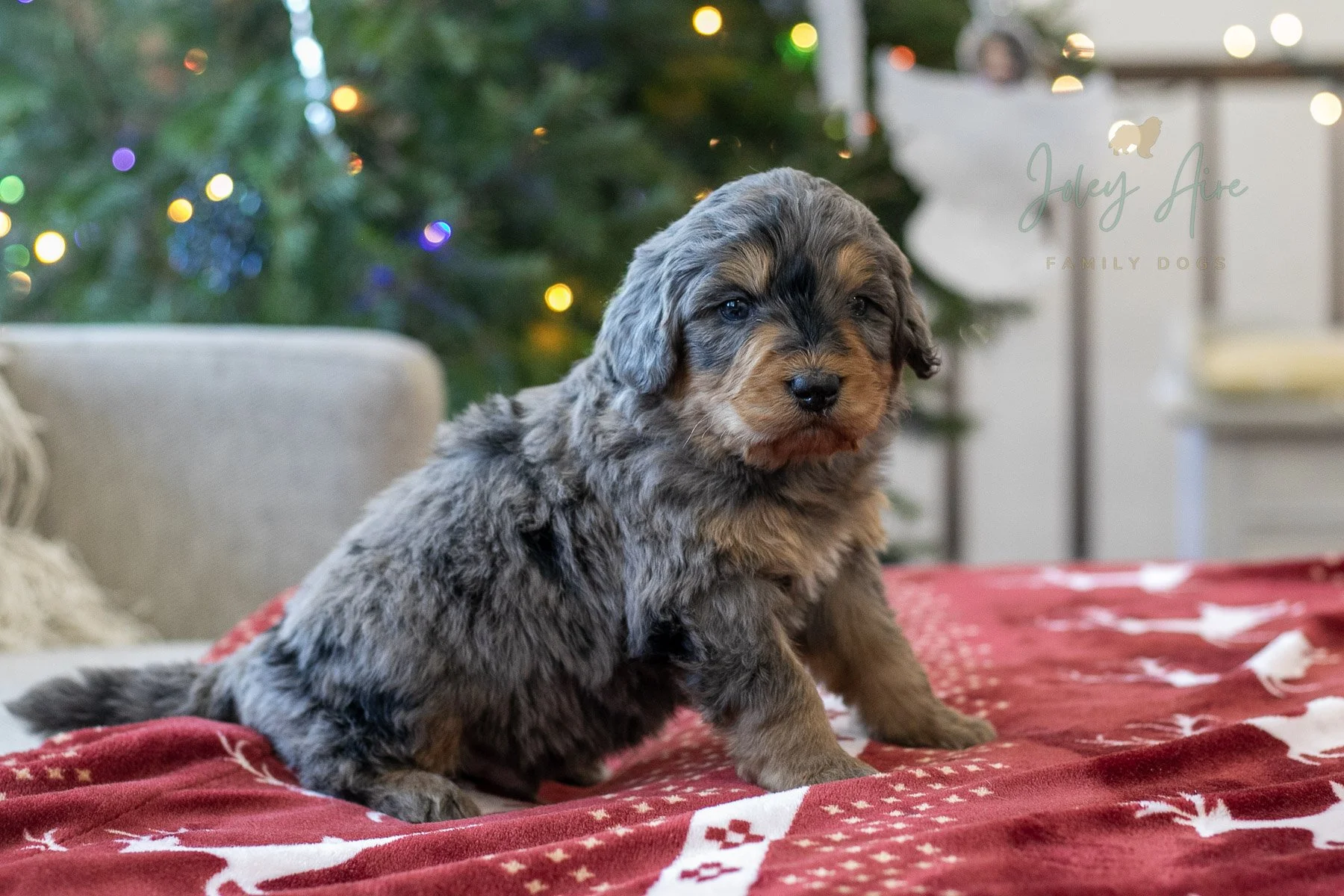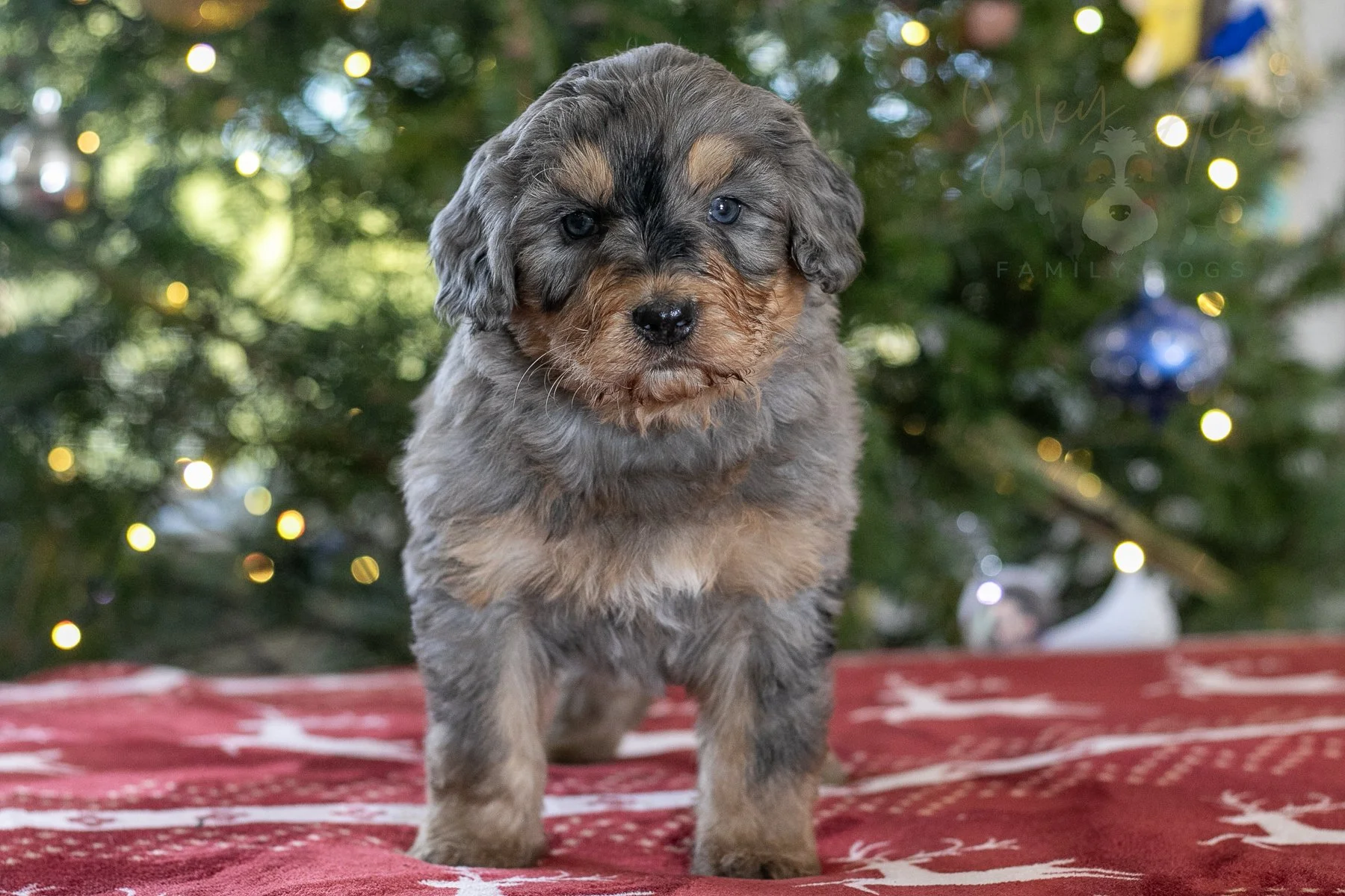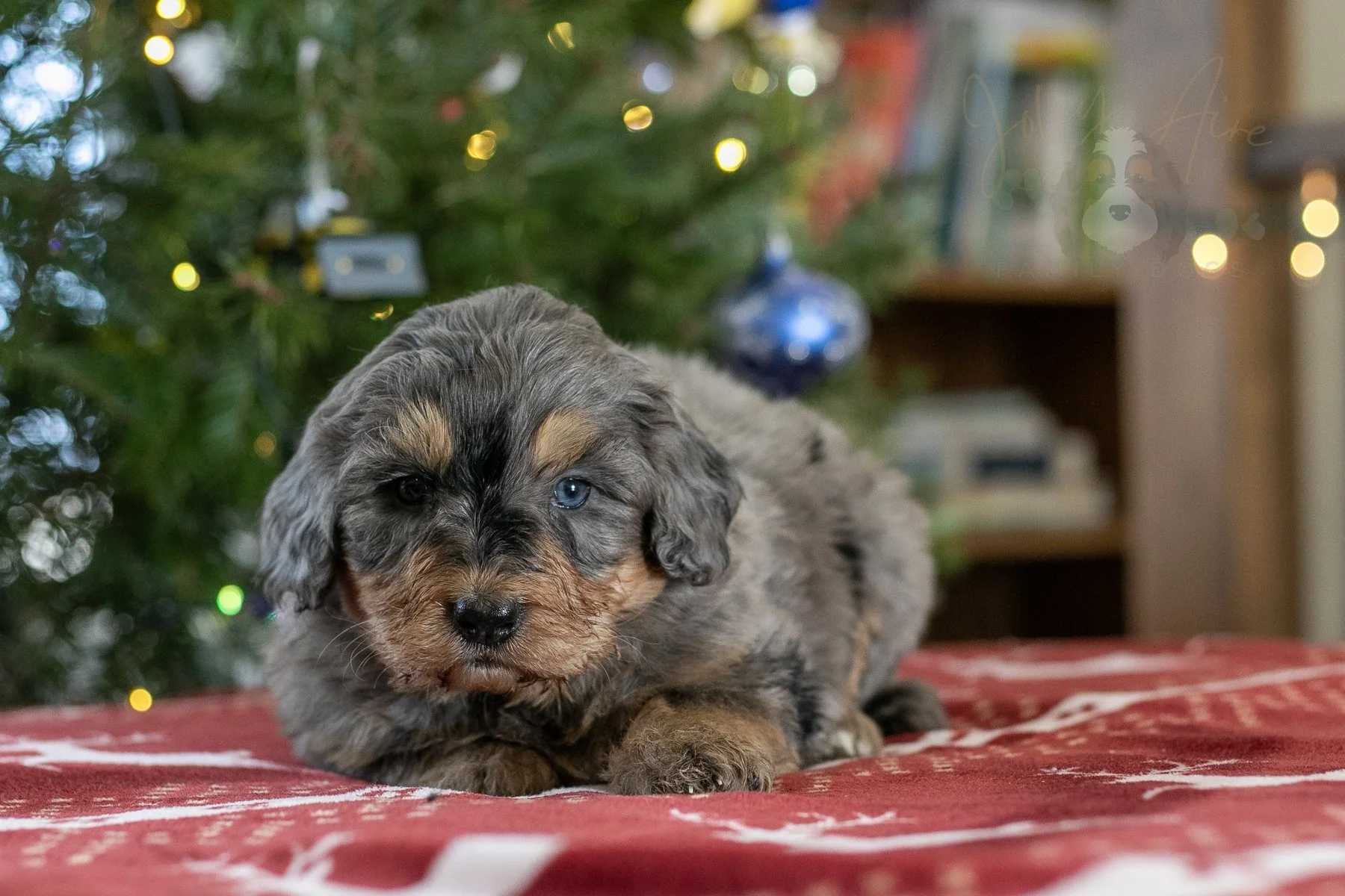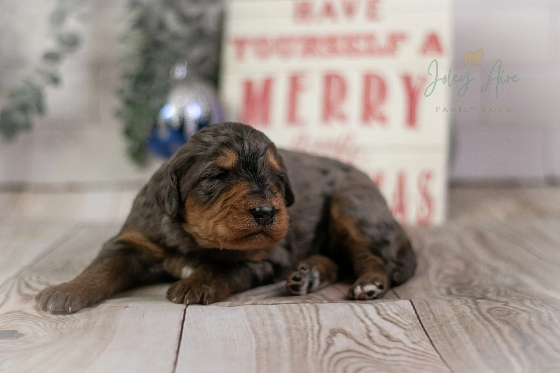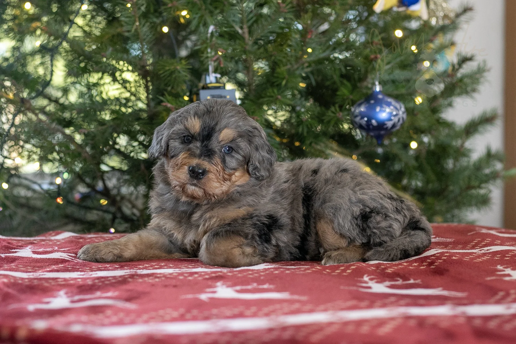 Behold Everest, our majestic male phantom Merle, his coat a tapestry of shadows and light, as bold and captivating as the towering peaks from which he takes his name. This beautiful Bernedoodle pup wears a palette of colors that dance like dawn upon the rugged mountains, drawing the gaze and warming the heart. Within him lies a calm spirit and a gentle soul—a treasure of affection and grace, destined to be your family’s steadfast companion. As he grows, Everest will blossom into a loving guardian, a true reflection of his extraordinary parents, who gifted him their gentle temperament and warm, friendly charm. Raised with tender care and boundless love in our cozy Illinois home, this noble pup will be ready to journey into your life beginning January 10, 2026. We eagerly await the moment Everest becomes a cherished member of your family.