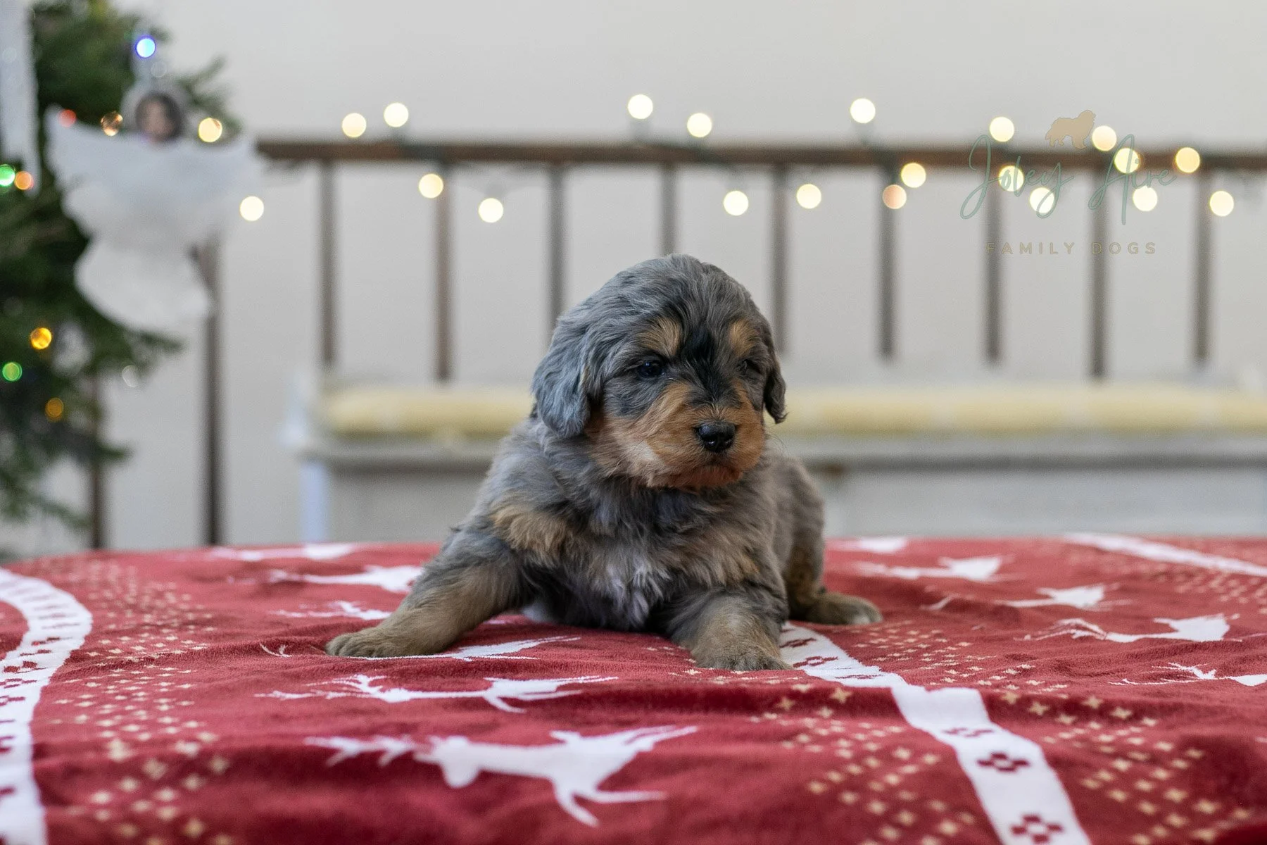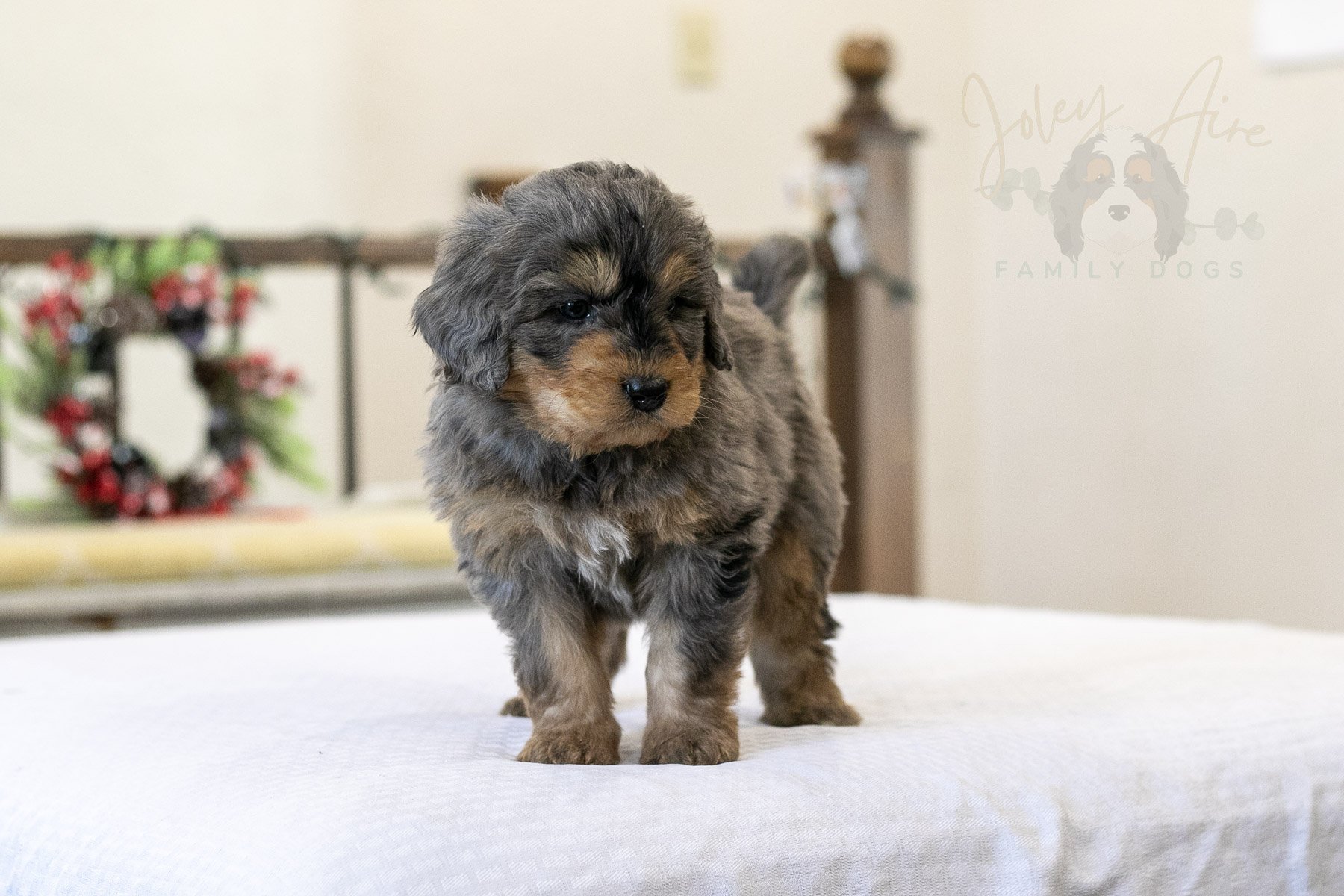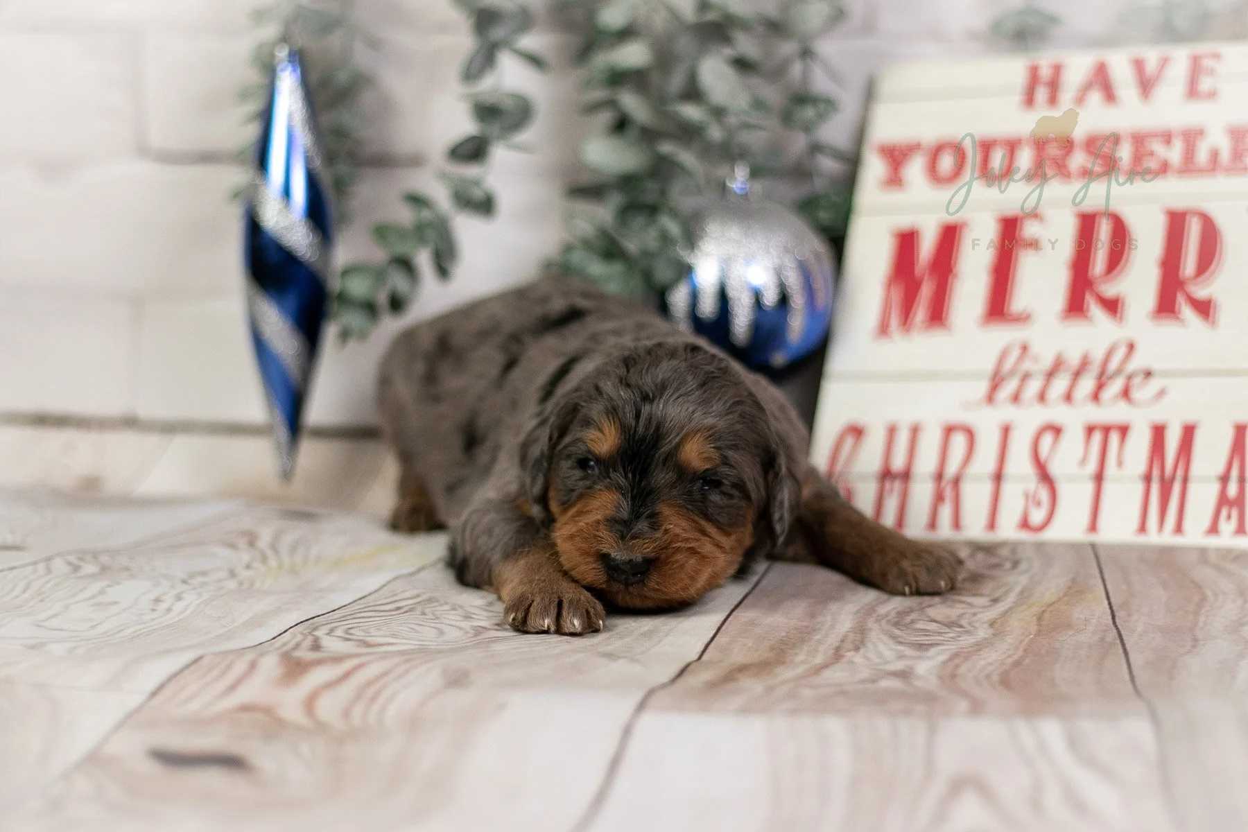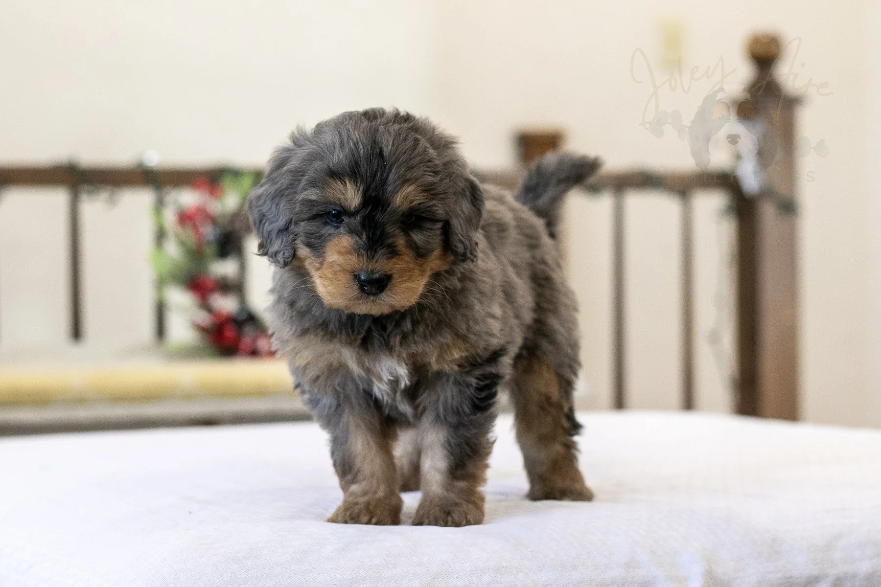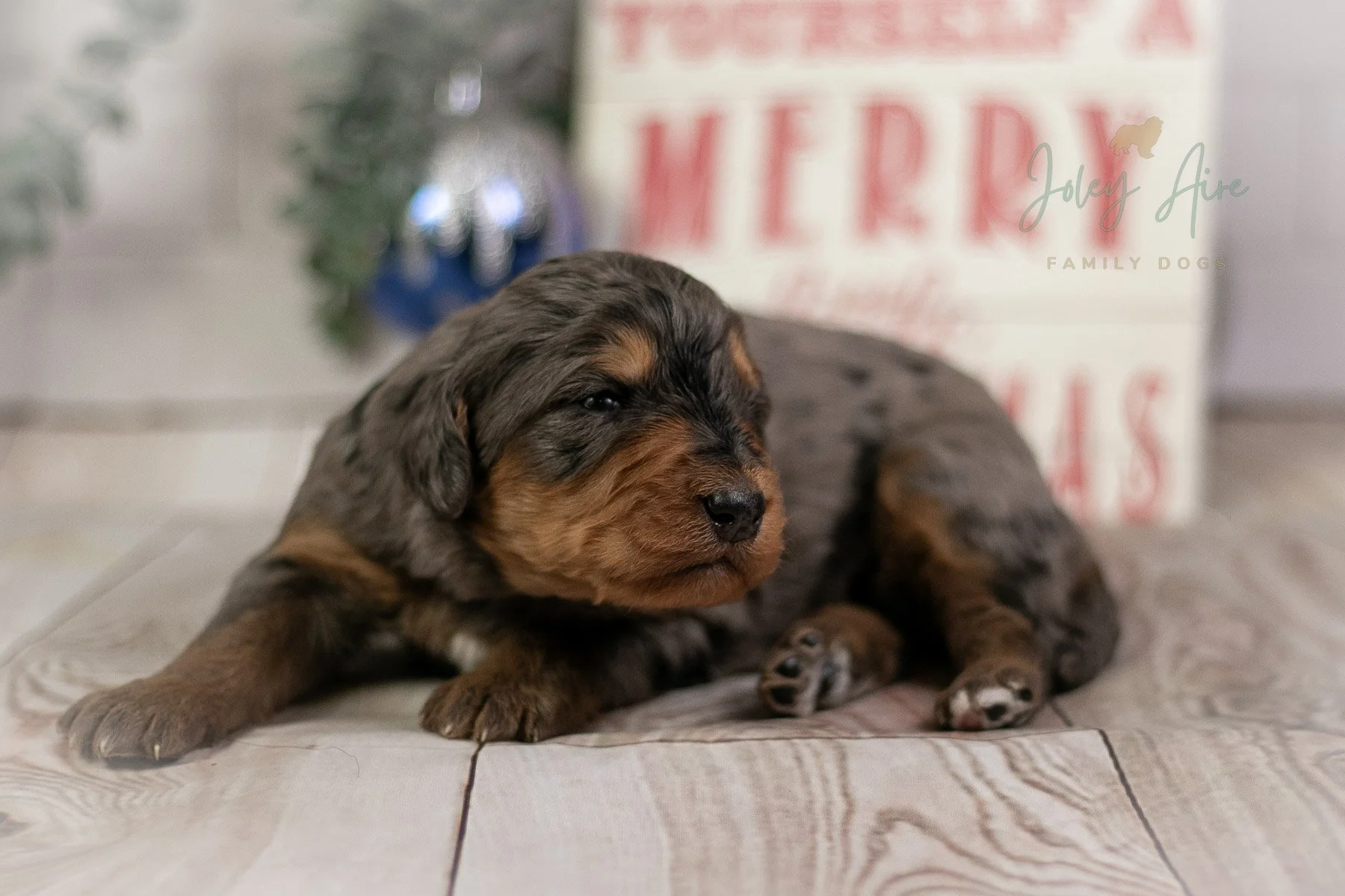 Behold Everest, our majestic male phantom Merle, his coat a tapestry of shadows and light, as bold and captivating as the towering peaks from which he takes his name. This beautiful Bernedoodle pup wears a palette of colors that dance like dawn upon the rugged mountains, drawing the gaze and warming the heart. Within him lies a calm spirit and a gentle soul—a treasure of affection and grace, destined to be your family’s steadfast companion. As he grows, Everest will blossom into a loving guardian, a true reflection of his extraordinary parents, who gifted him their gentle temperament and warm, friendly charm. Raised with tender care and boundless love in our cozy Illinois home, this noble pup will be ready to journey into your life beginning January 10, 2026. We eagerly await the moment Everest becomes a cherished member of your family.