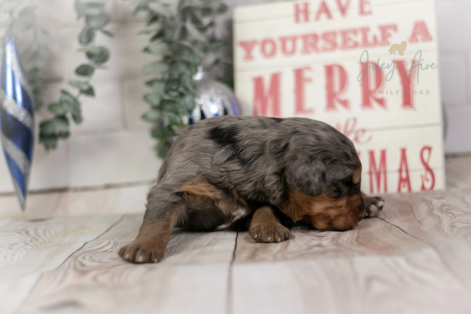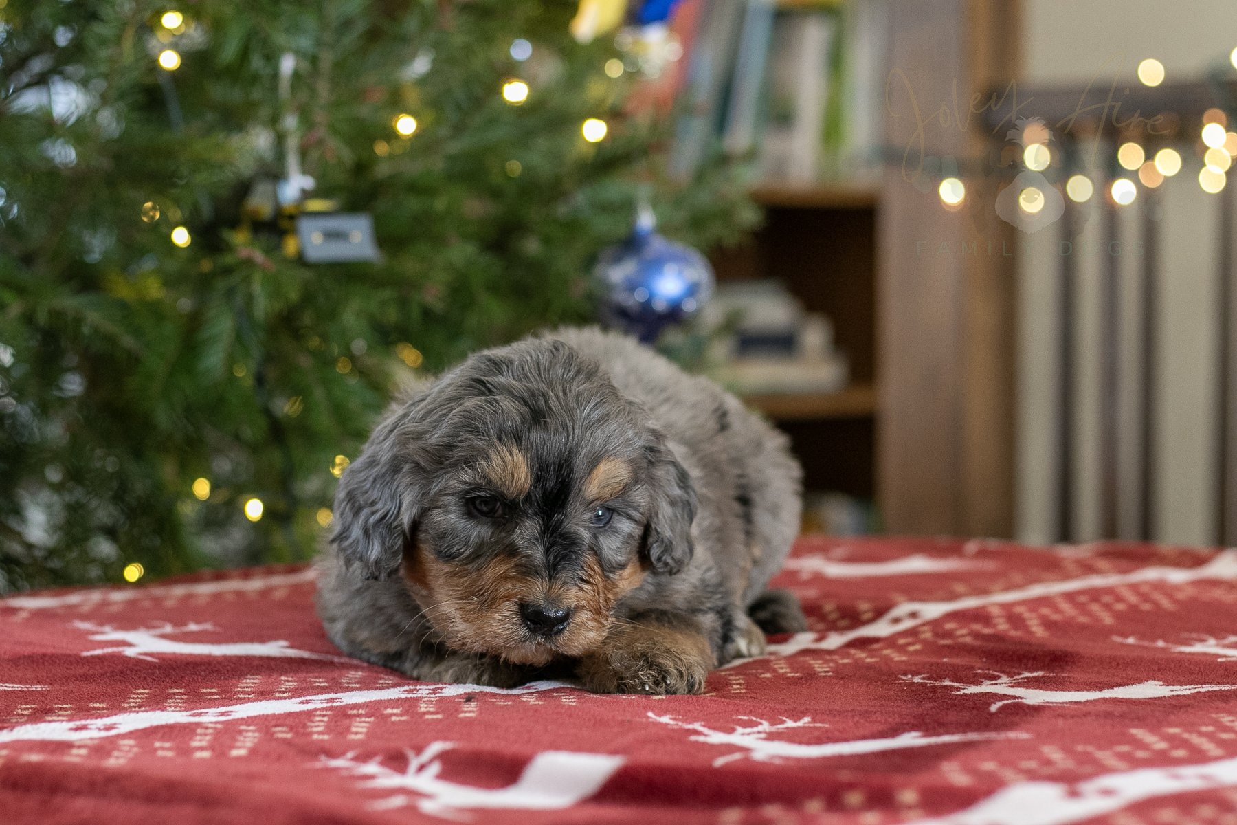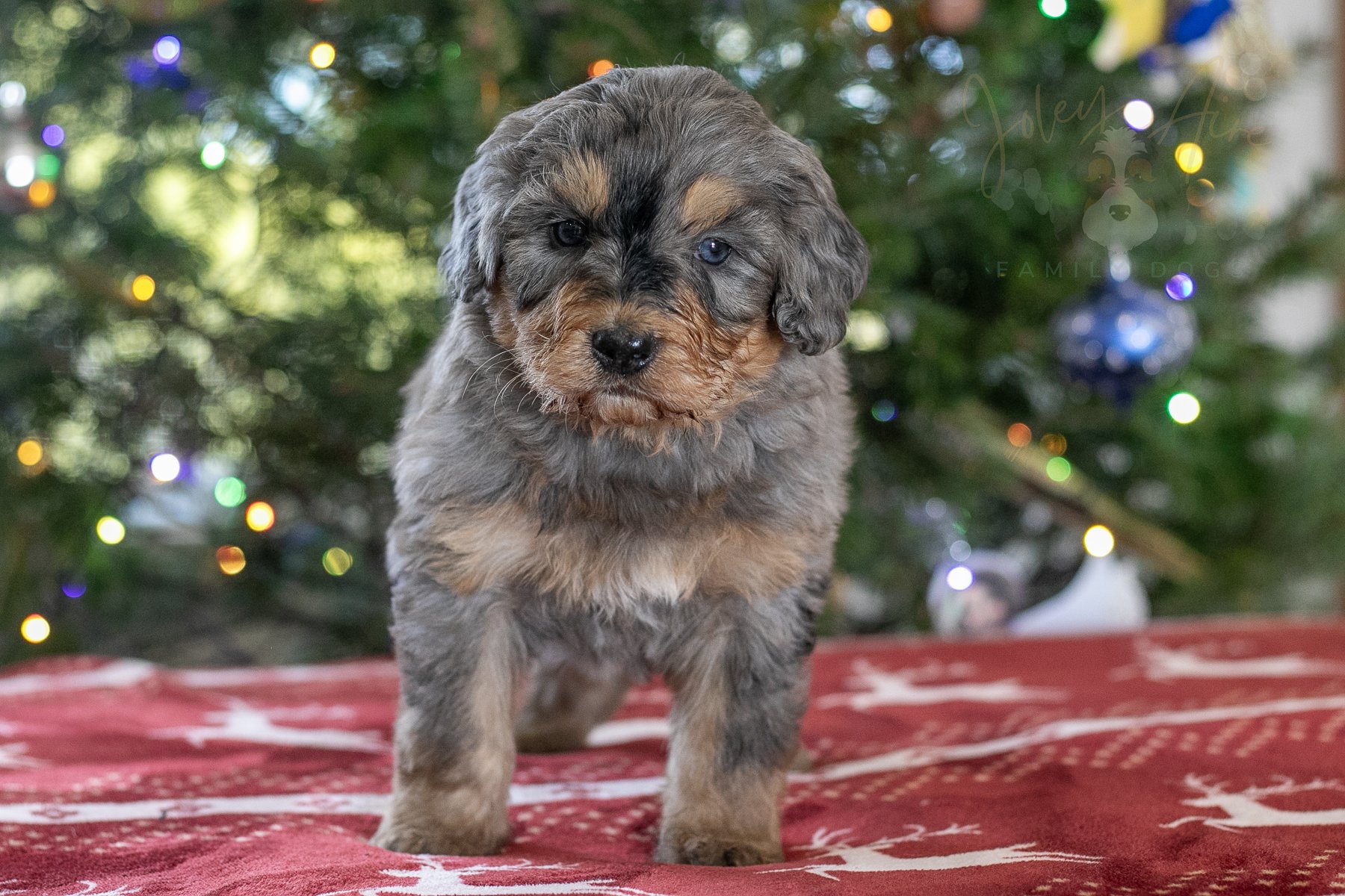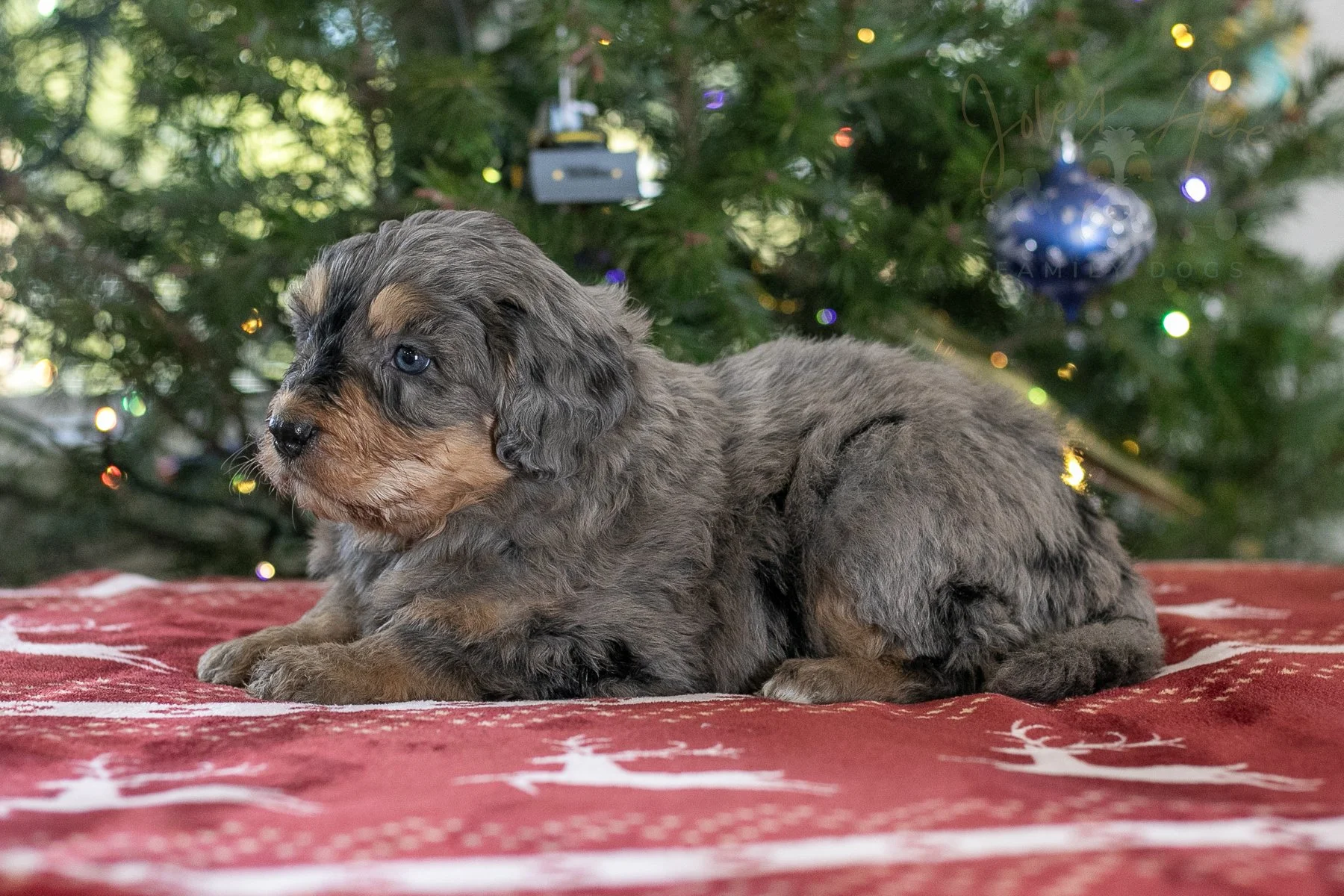 Behold Everest, our majestic male phantom Merle, his coat a tapestry of shadows and light, as bold and captivating as the towering peaks from which he takes his name. This beautiful Bernedoodle pup wears a palette of colors that dance like dawn upon the rugged mountains, drawing the gaze and warming the heart. Within him lies a calm spirit and a gentle soul—a treasure of affection and grace, destined to be your family’s steadfast companion. As he grows, Everest will blossom into a loving guardian, a true reflection of his extraordinary parents, who gifted him their gentle temperament and warm, friendly charm. Raised with tender care and boundless love in our cozy Illinois home, this noble pup will be ready to journey into your life beginning January 10, 2026. We eagerly await the moment Everest becomes a cherished member of your family.