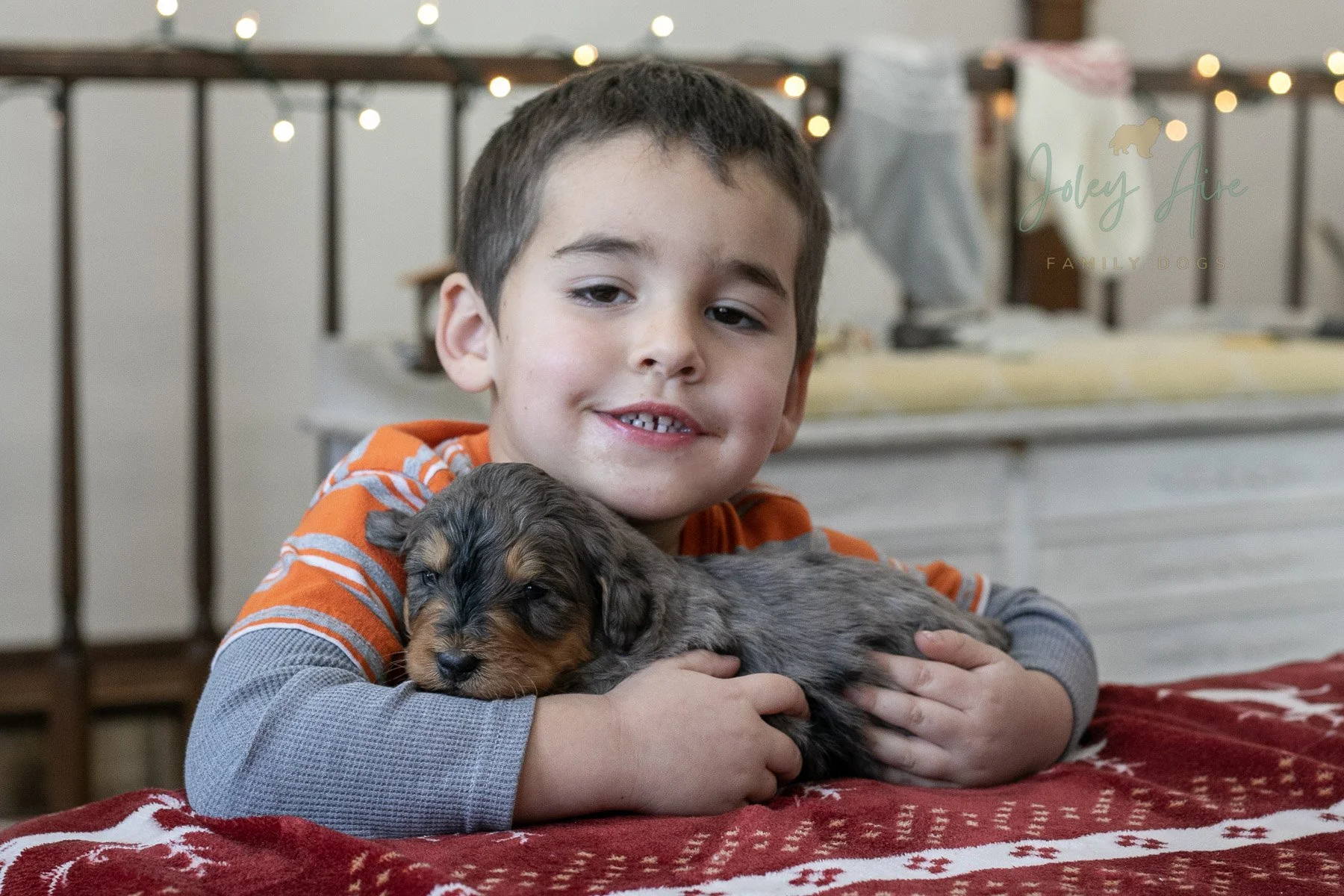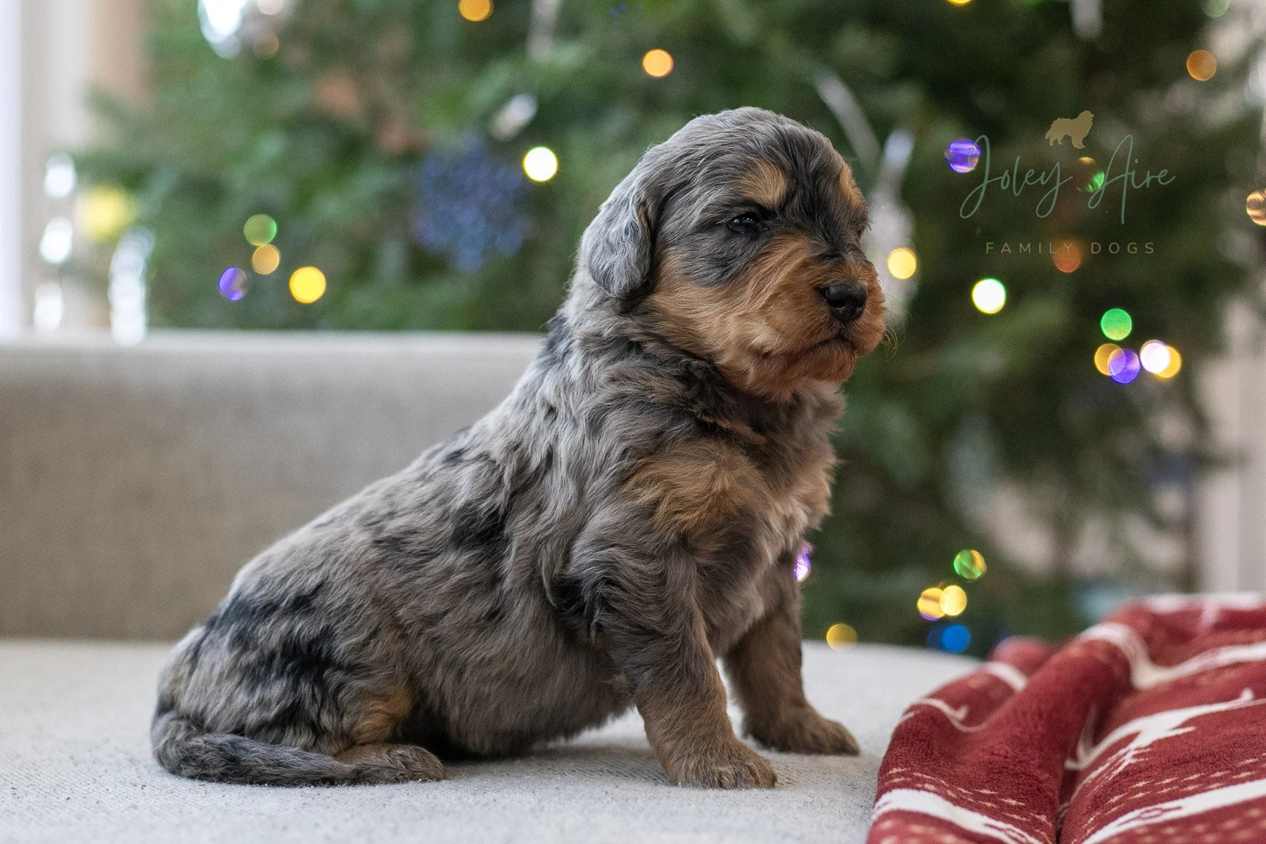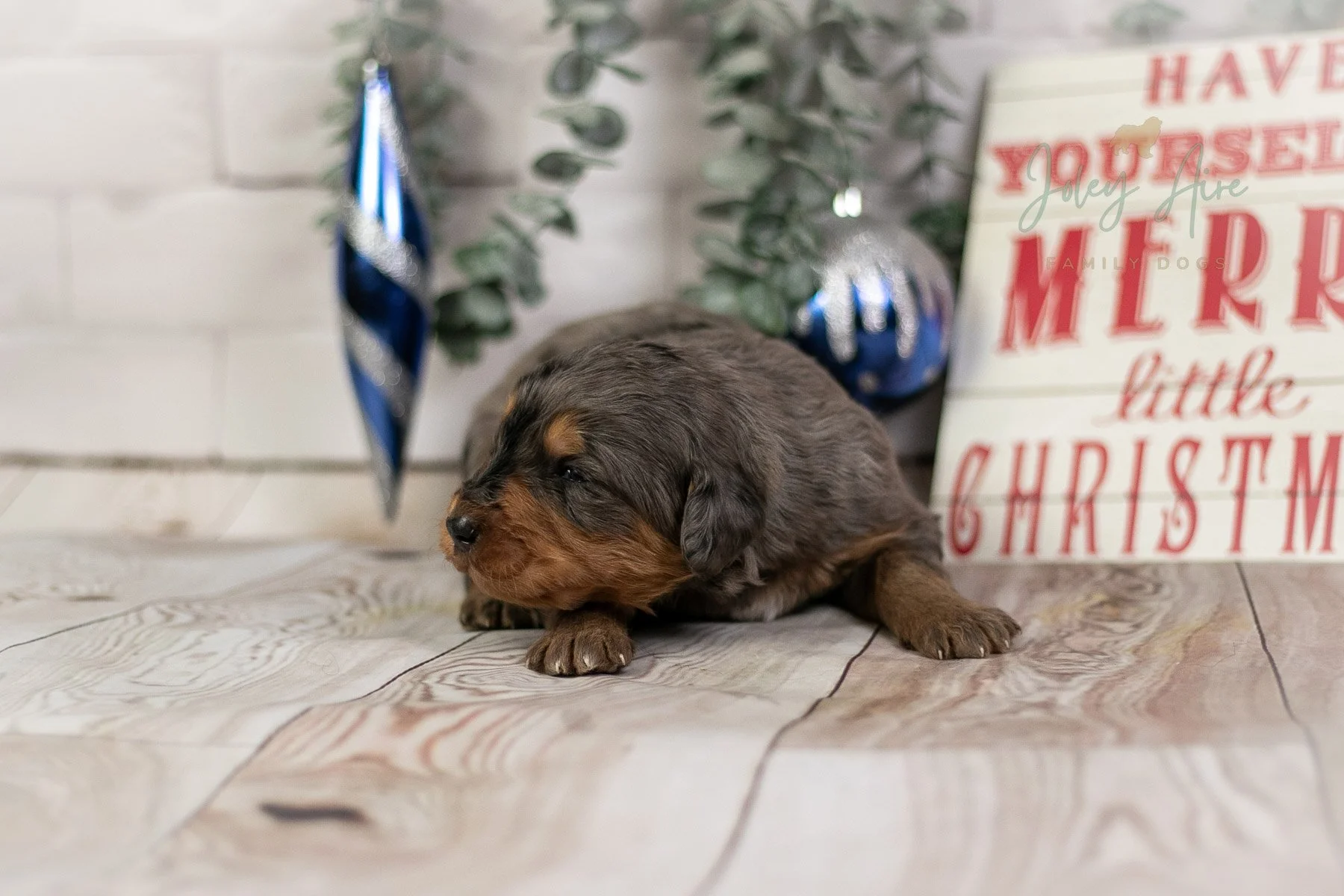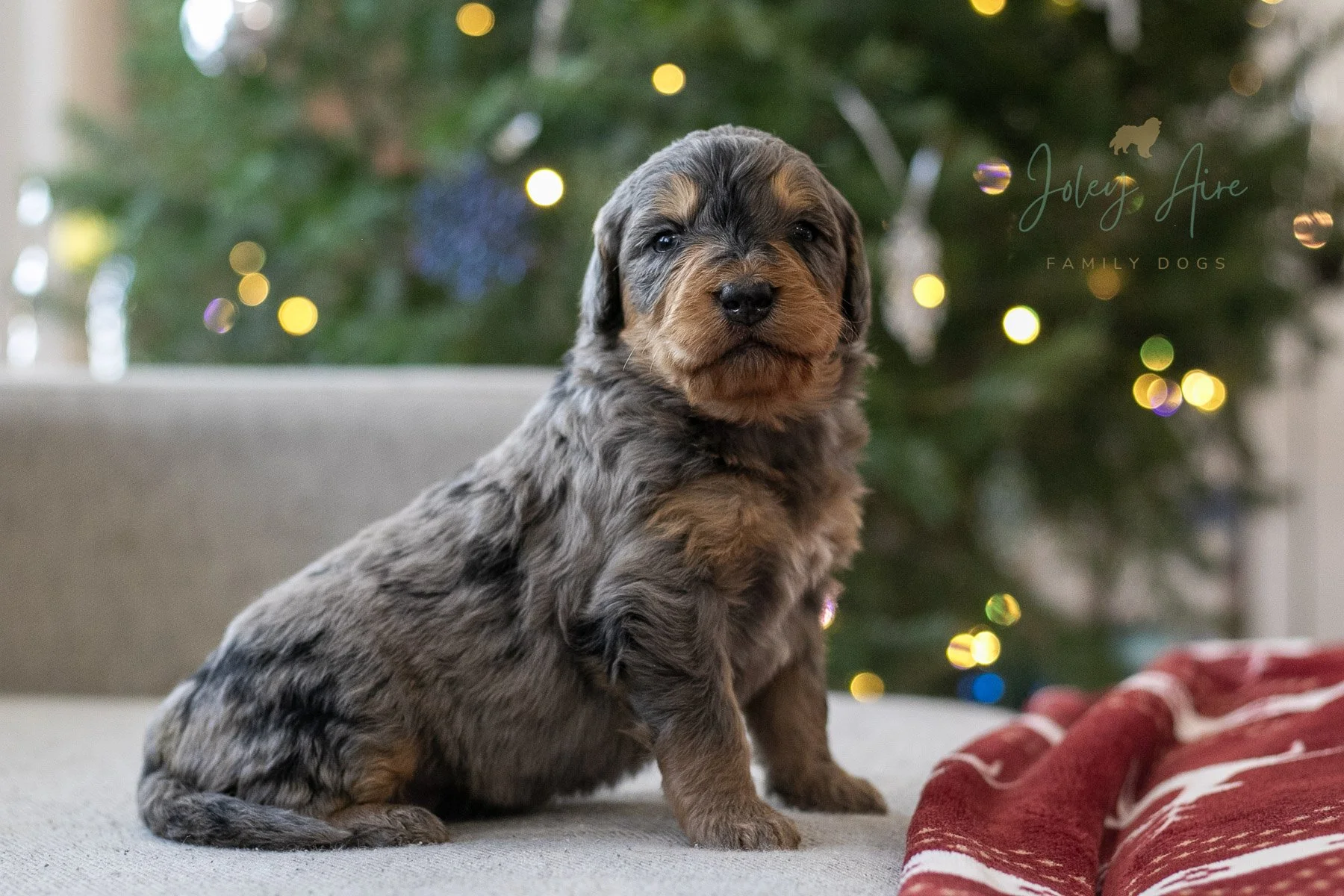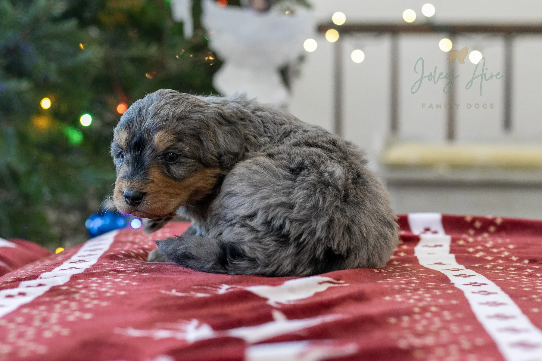 Behold Everest, our majestic male phantom Merle, his coat a tapestry of shadows and light, as bold and captivating as the towering peaks from which he takes his name. This beautiful Bernedoodle pup wears a palette of colors that dance like dawn upon the rugged mountains, drawing the gaze and warming the heart. Within him lies a calm spirit and a gentle soul—a treasure of affection and grace, destined to be your family’s steadfast companion. As he grows, Everest will blossom into a loving guardian, a true reflection of his extraordinary parents, who gifted him their gentle temperament and warm, friendly charm. Raised with tender care and boundless love in our cozy Illinois home, this noble pup will be ready to journey into your life beginning January 10, 2026. We eagerly await the moment Everest becomes a cherished member of your family.