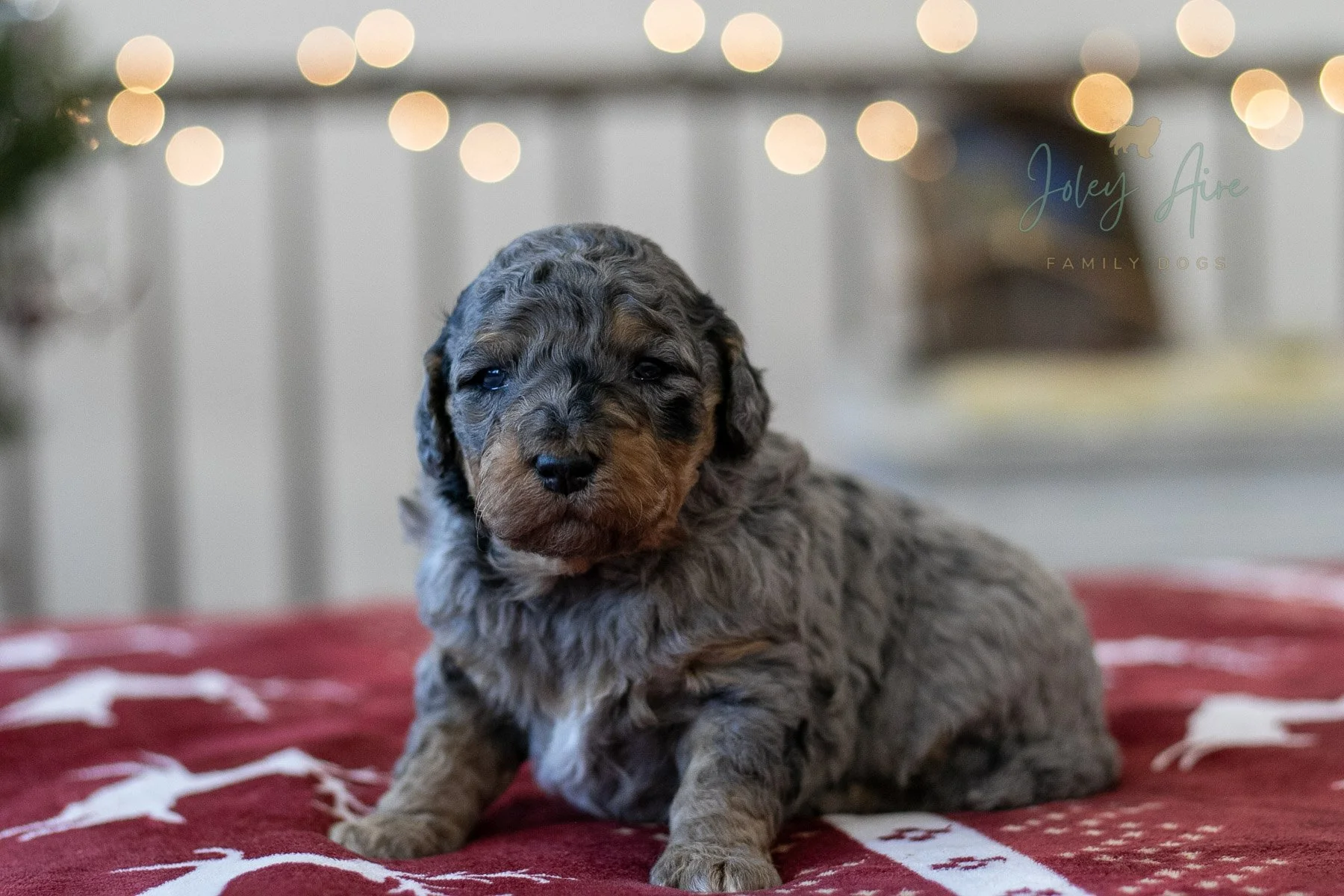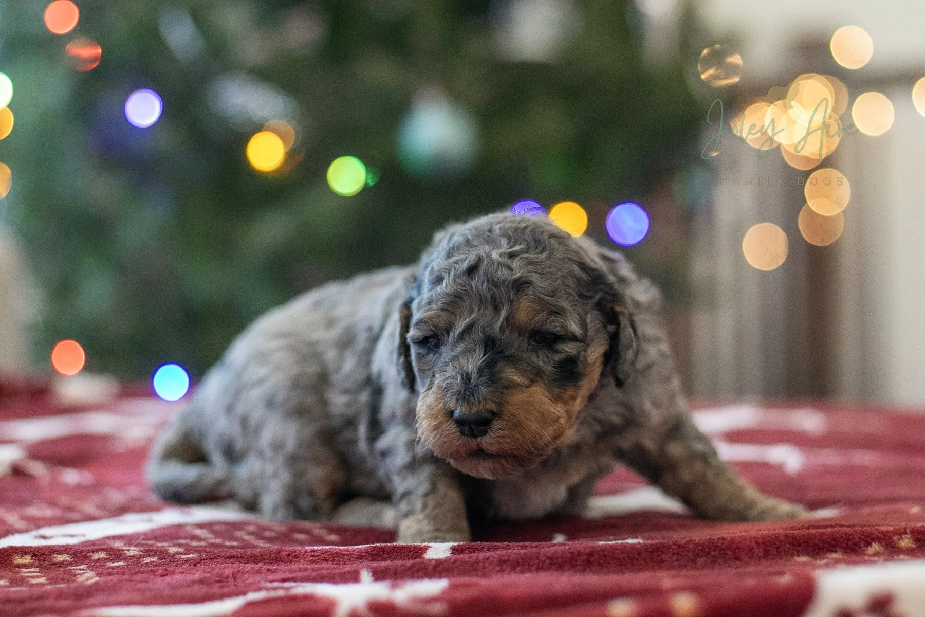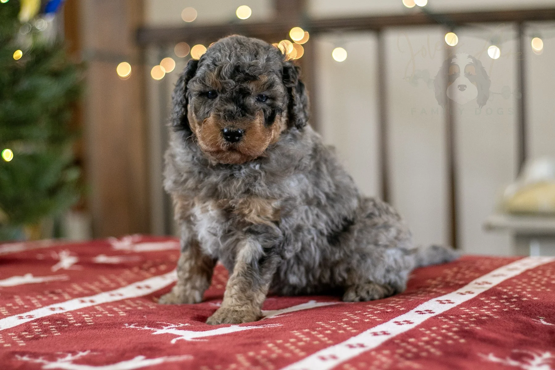 Harken, for the name Frodo is most fitting for this noble male Phantom Merle Bernedoodle pup. His coat, like the mists of dawn upon the Silverlode, gleams with shades of silvery gray and bears phantom markings, as if woven by Elven hands in the twilight. This rare F1b Bernedoodle, born of three parts noble Poodle and one part mighty Bernese, shall grow to a gentle stature of forty to fifty pounds—mighty enough for a steadfast companion, yet gentle as the Shire’s own heart.
