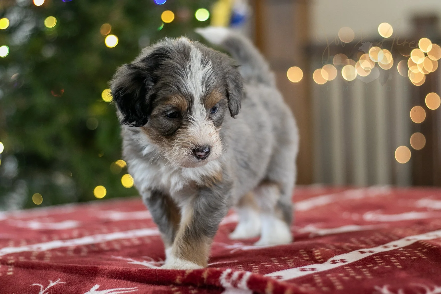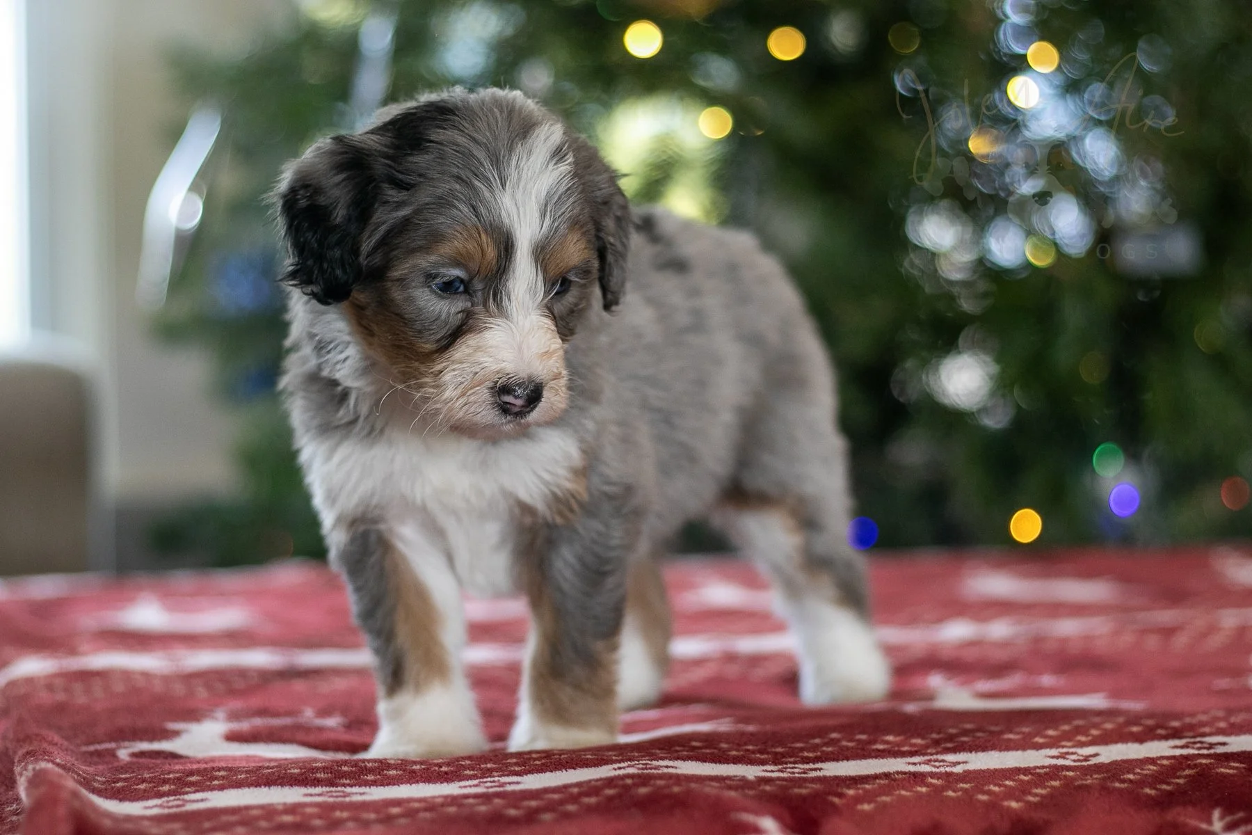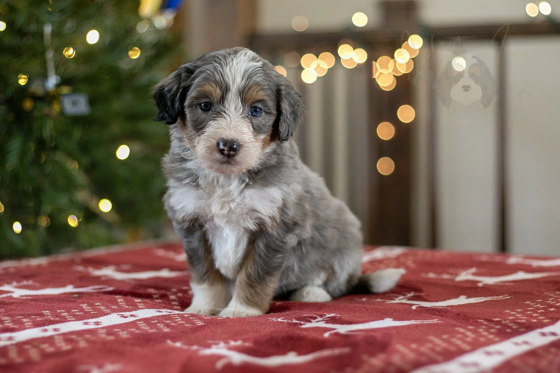 Meet Fuji, our charming little lady with a tri-color merle coat as unique and beautiful as the mountain air she’s named after. This precious female Bernedoodle puppy has a stunning blend of colors that turn heads and a gentle, loving spirit that warms every heart. Watching her grow, we know she’ll be a devoted, affectionate companion, likely around 60-80 lbs, inheriting the best traits from her wonderful parents—who’ve passed along their remarkable sweetness and friendly nature. Raised with care and love right here in our cozy Illinois home, Fuji will be ready to join your family starting January 10, 2026! We can’t wait for you to meet her.