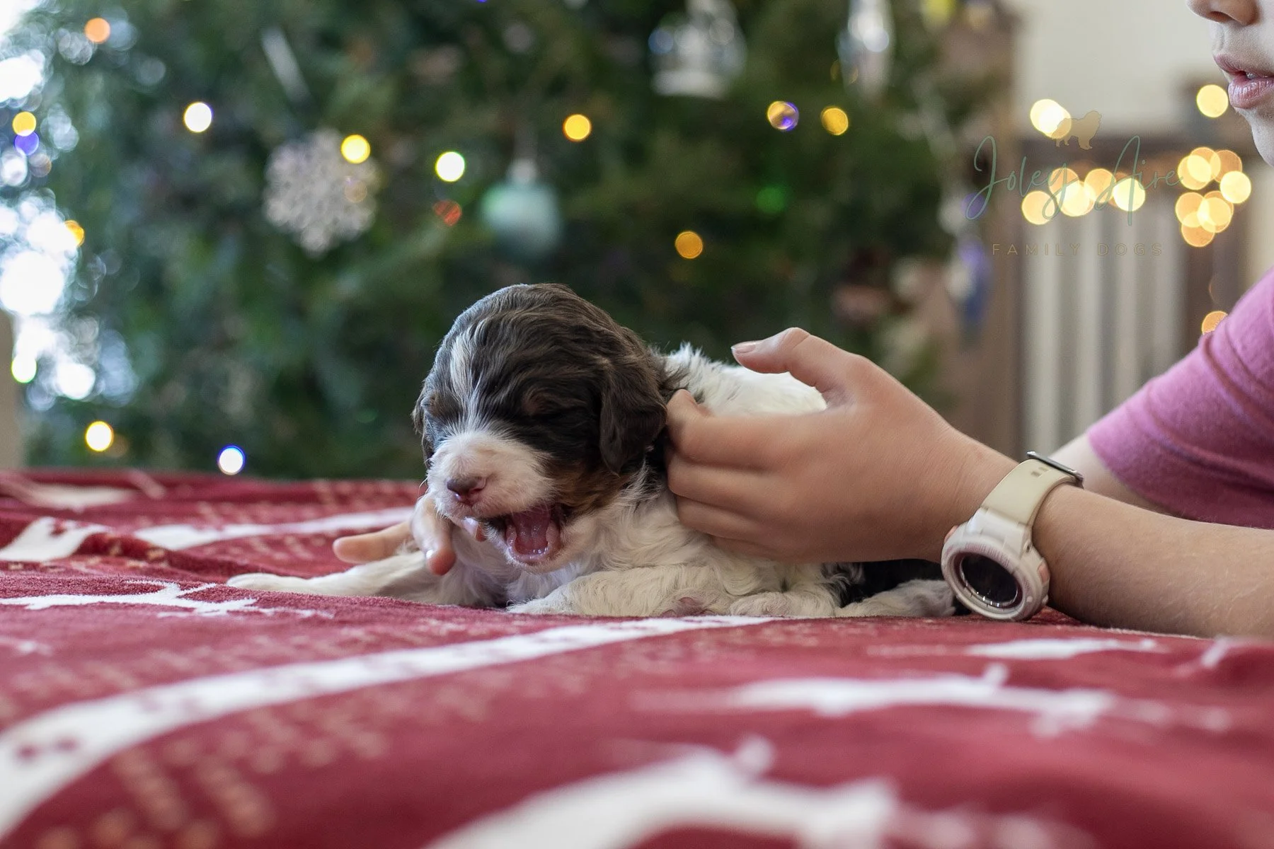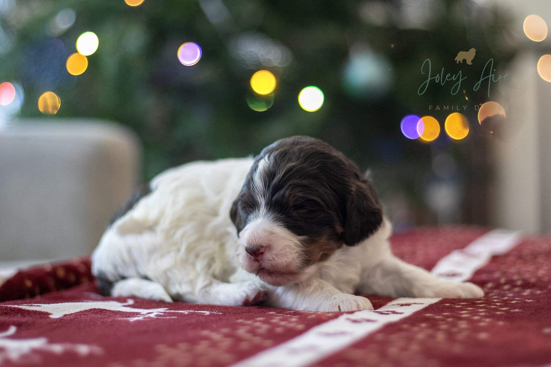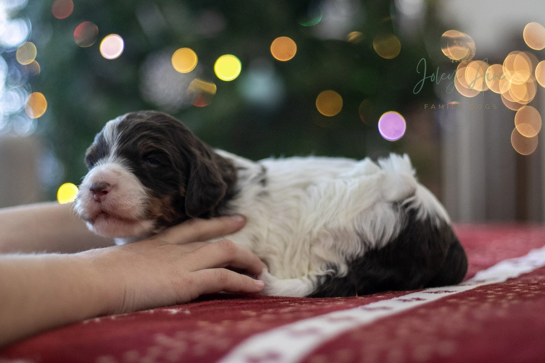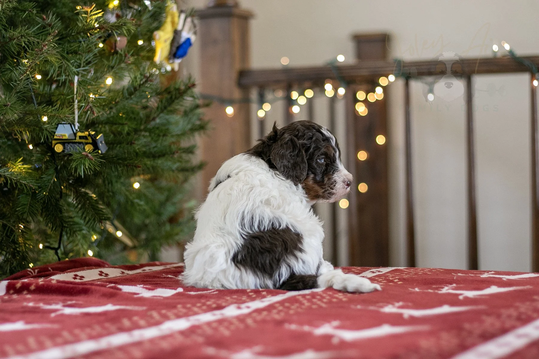 Suki is a lovely medium sized F1 Bernedoodle. She has striking tri-color markings and an amazing personality! Suki is very friendly and lovable and happy all the time.