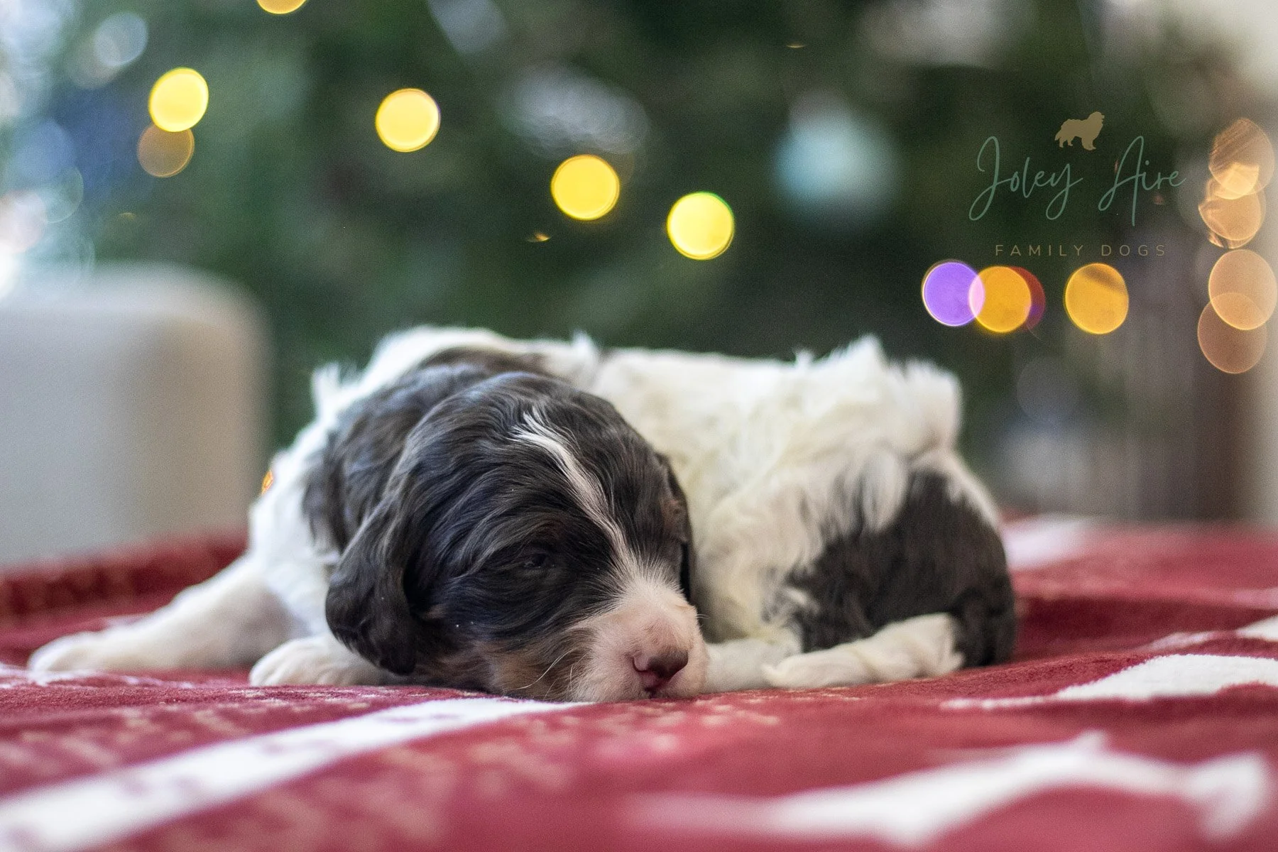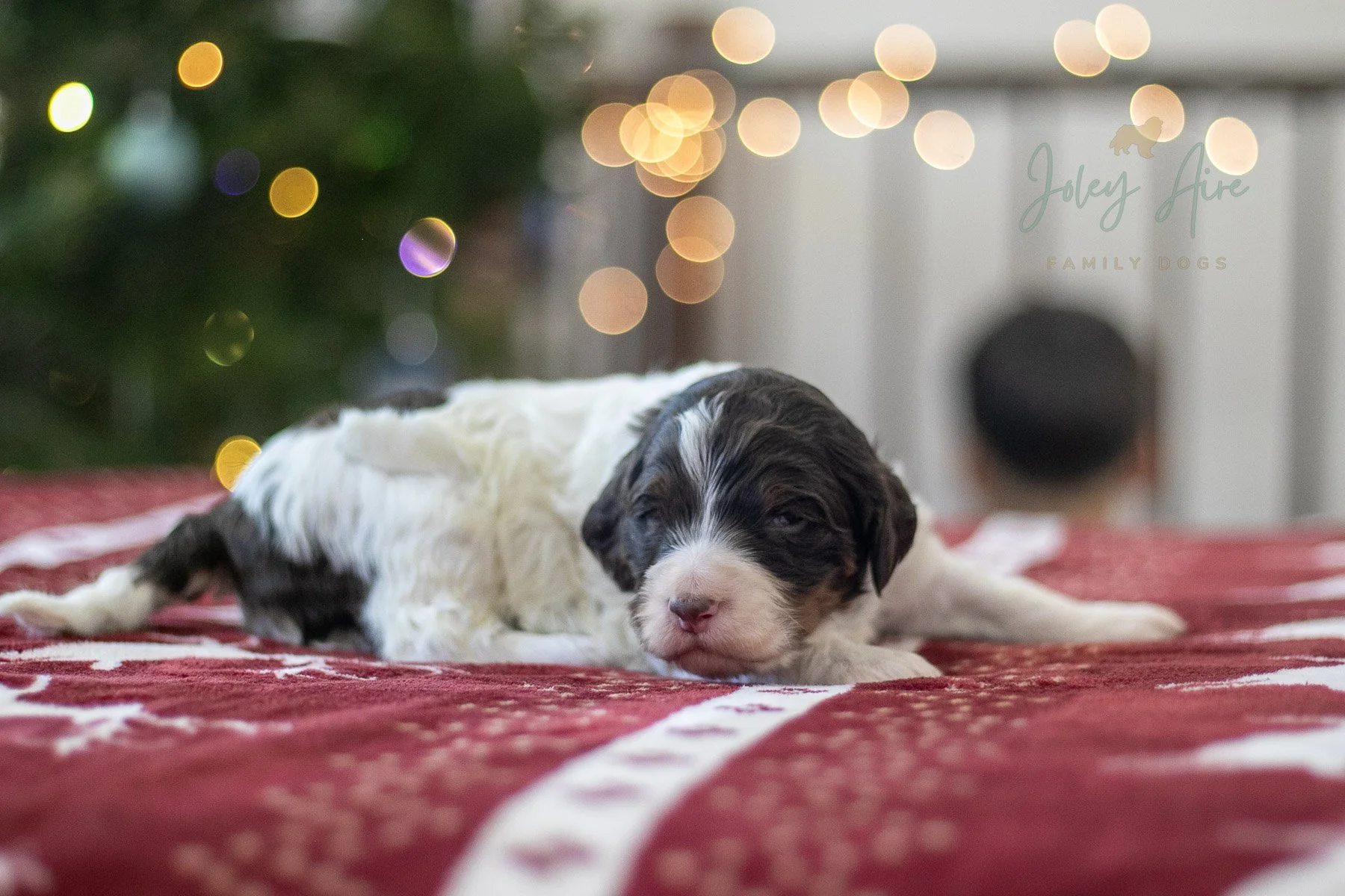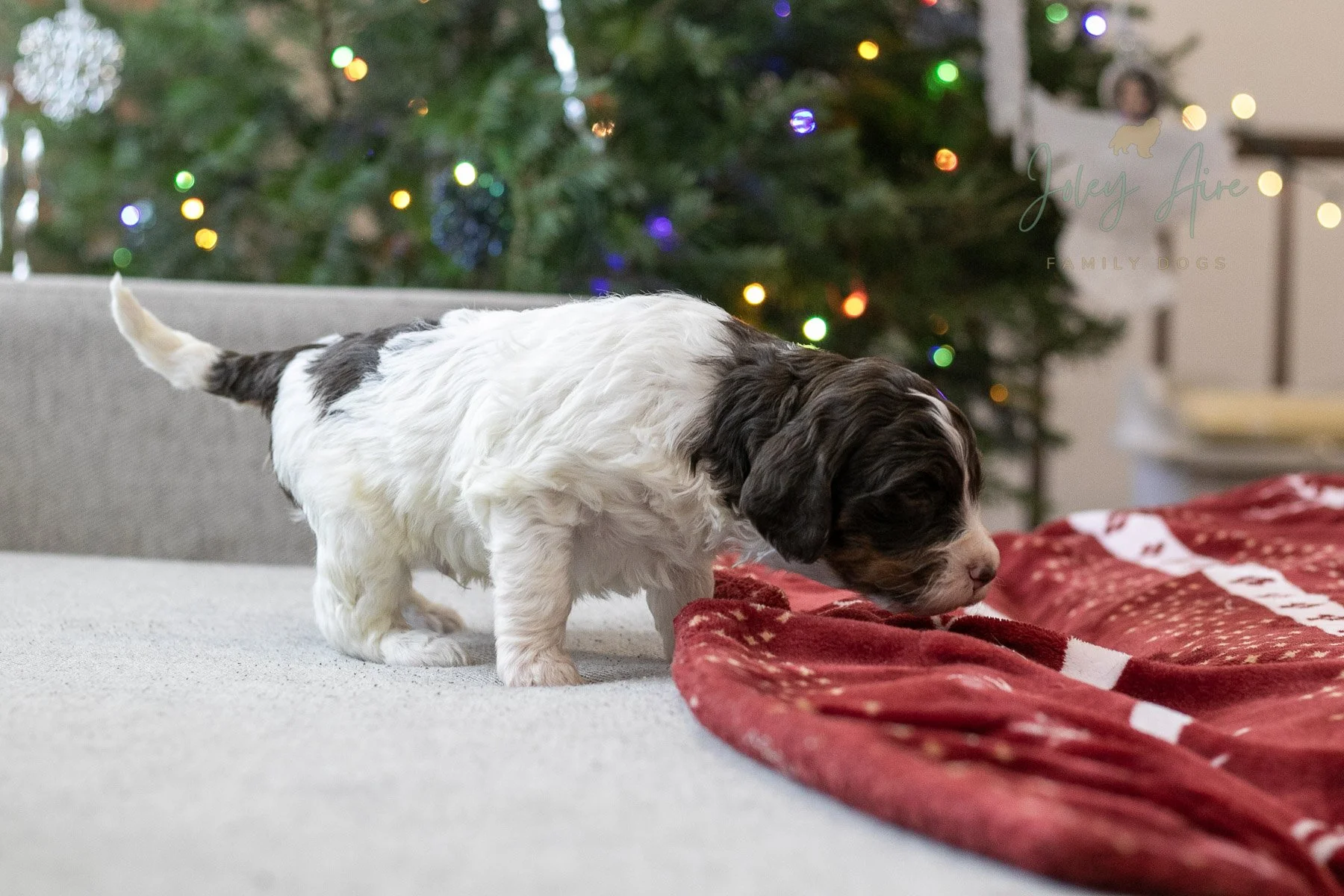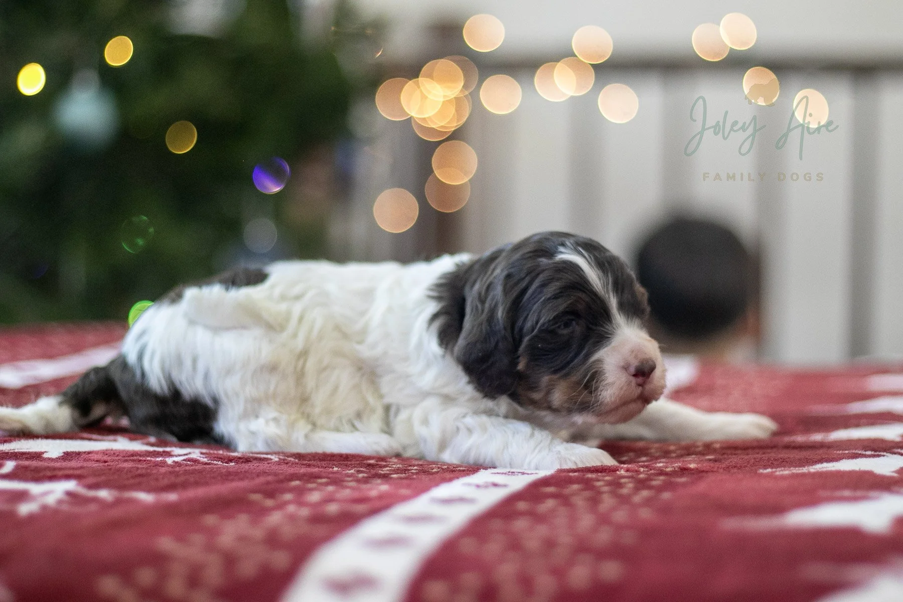 Suki is a lovely medium sized F1 Bernedoodle. She has striking tri-color markings and an amazing personality! Suki is very friendly and lovable and happy all the time.