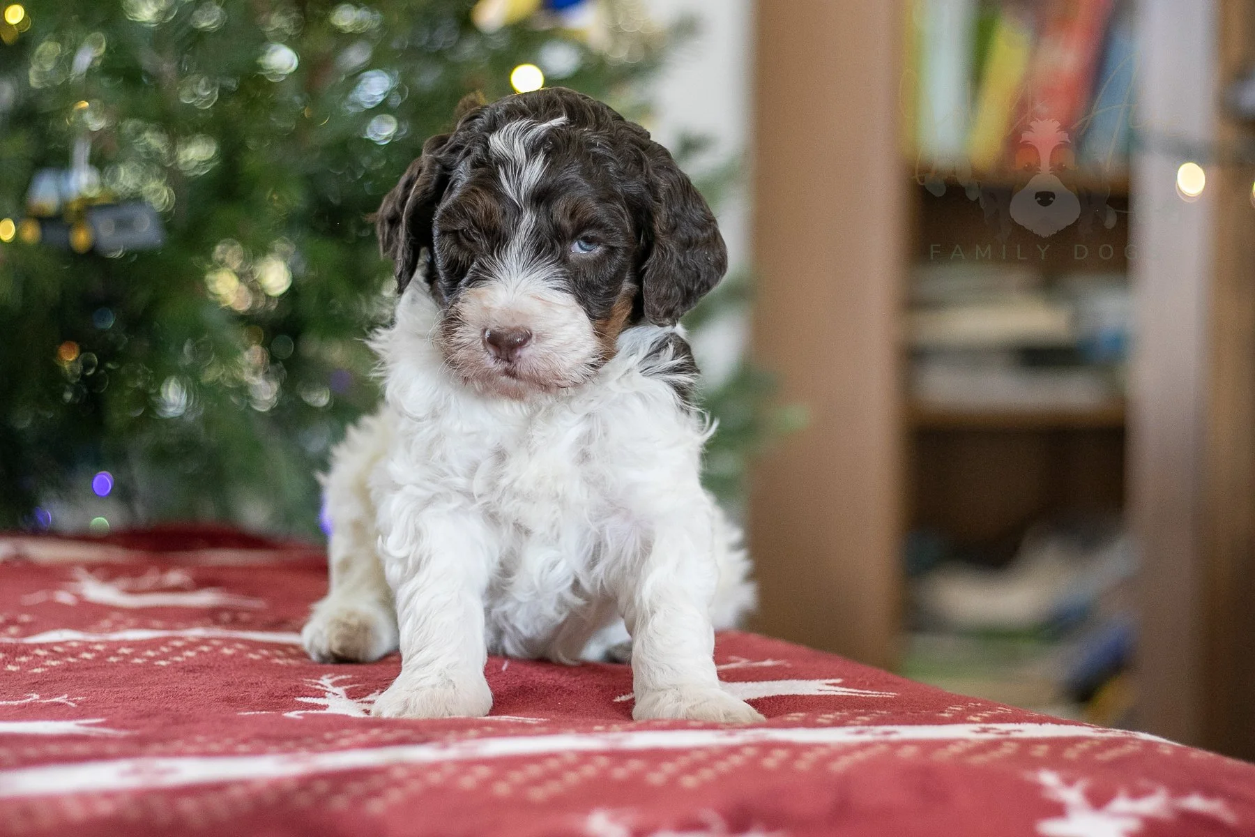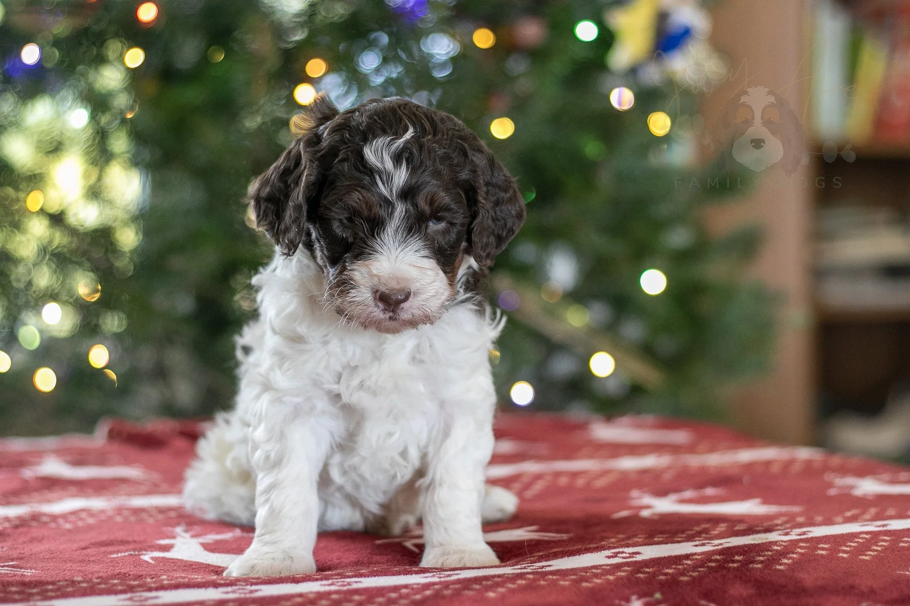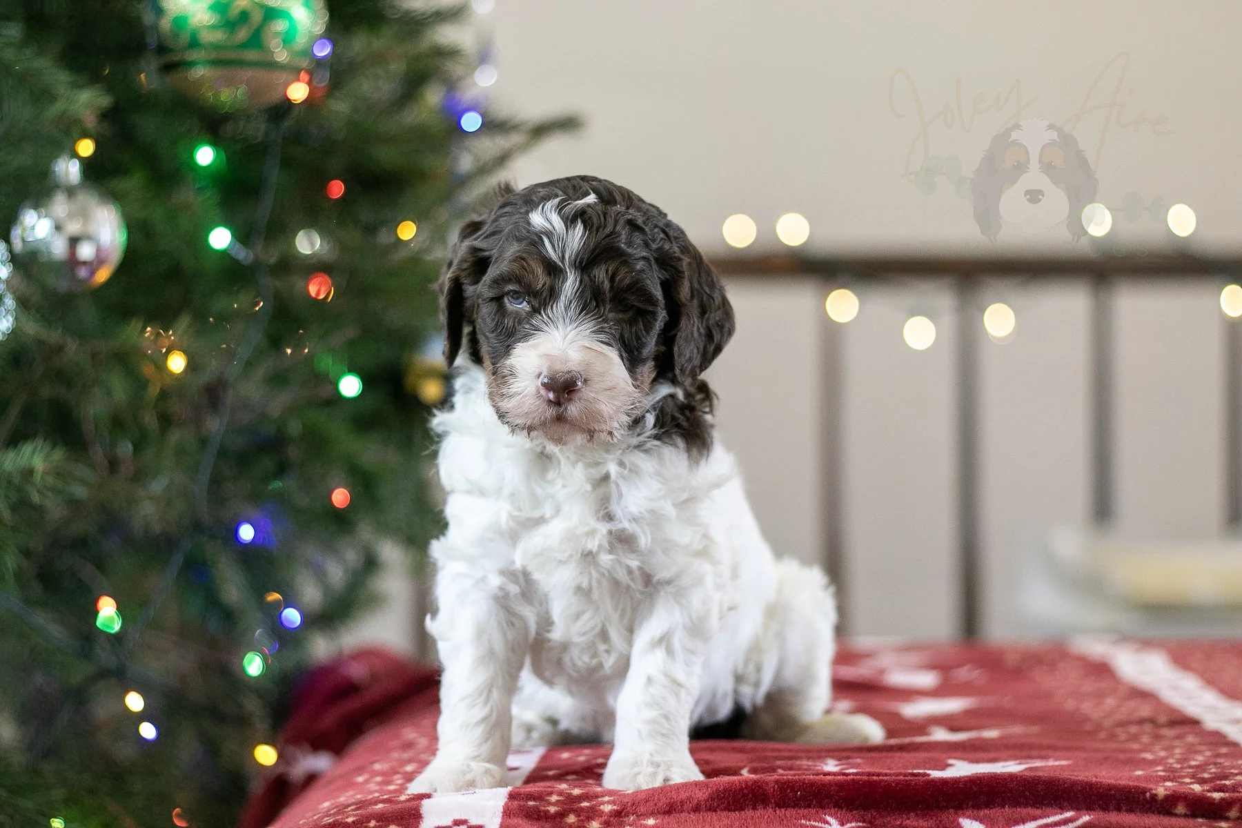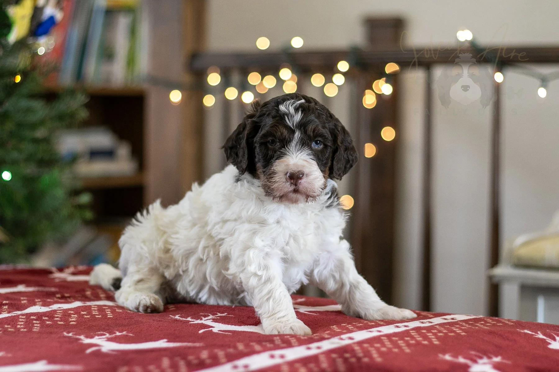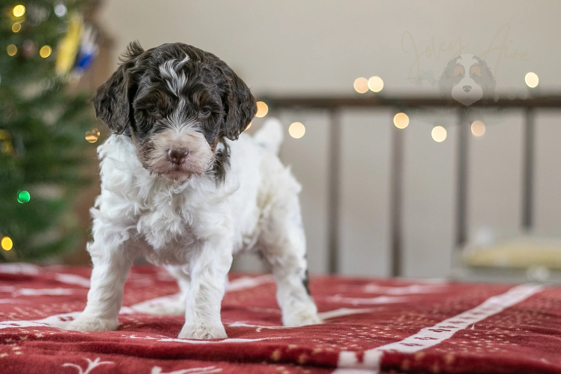Behold, the name Gandalf the White is most fitting for this fair chocolate parti pup, for he is clad in robes of snowy white that gleam like the First Light of Eärendil. This noble creature is an F1b Bernedoodle, three parts Poodle to one part Bernese, destined to grow to a stature of forty to fifty pounds—just the right size for a loyal companion of steadfast heart.