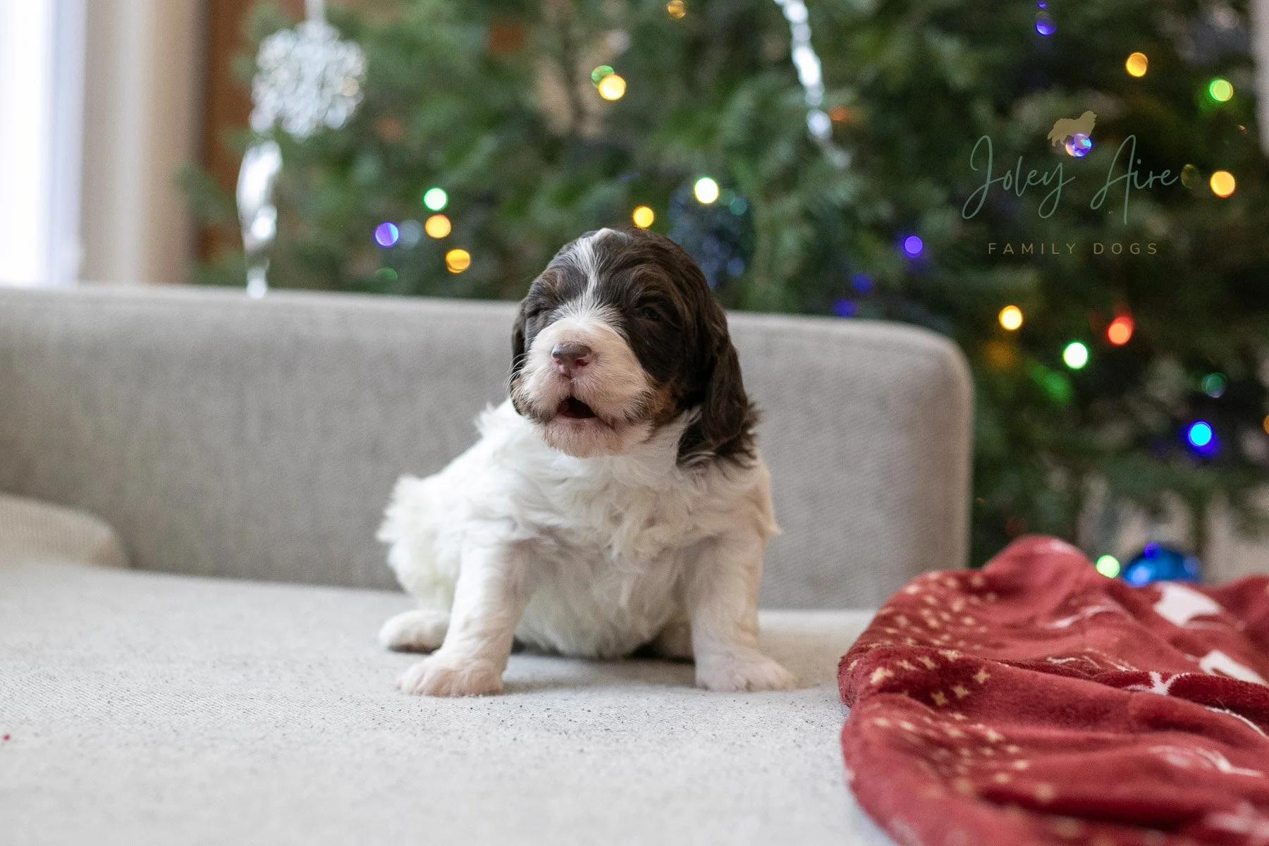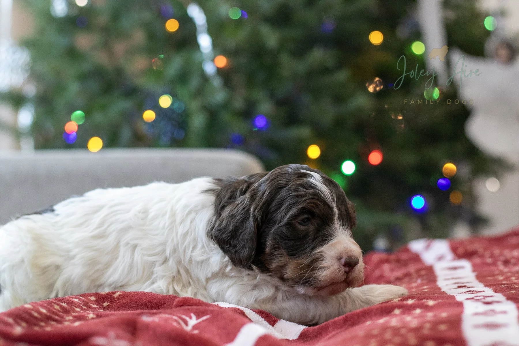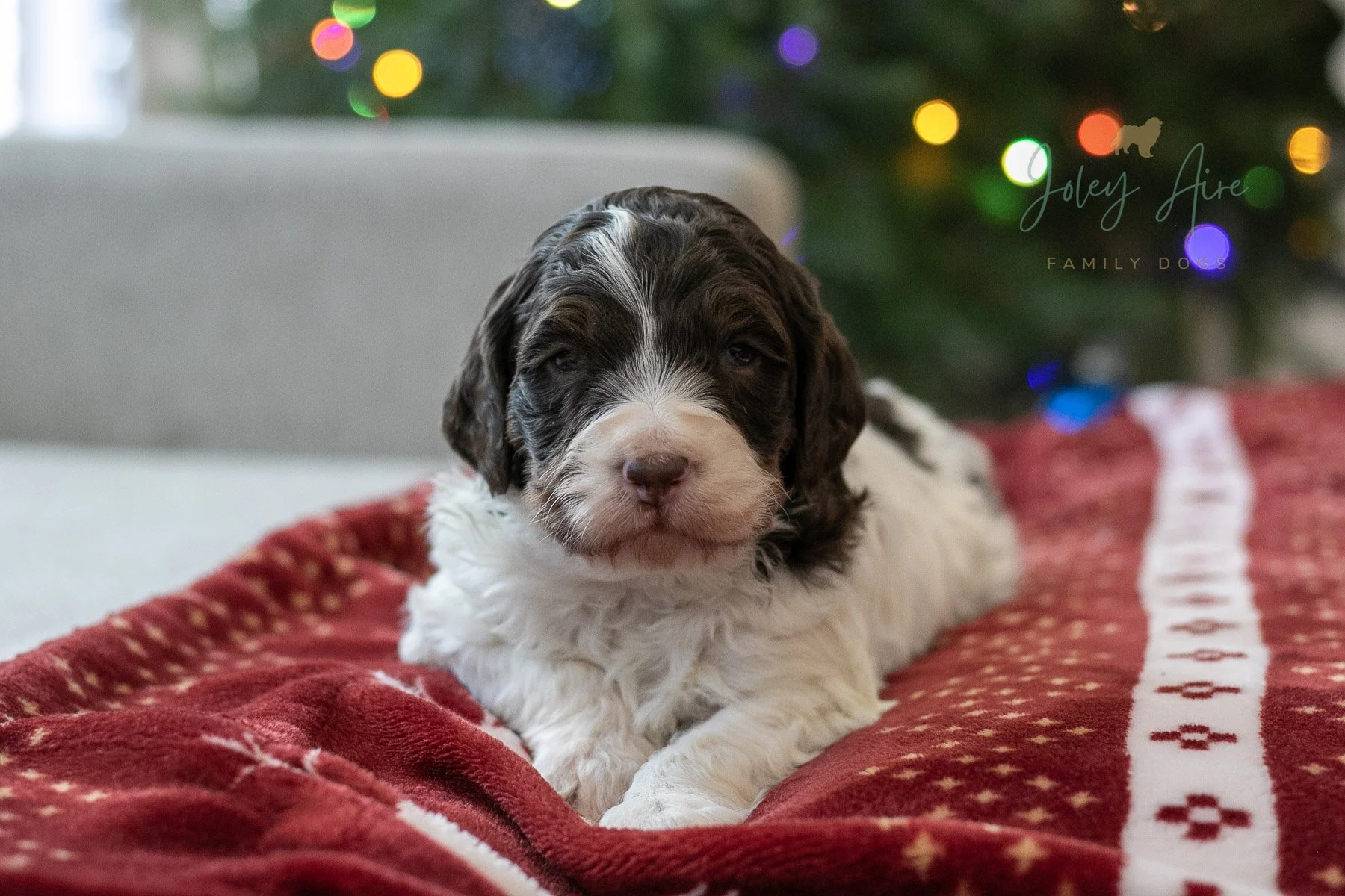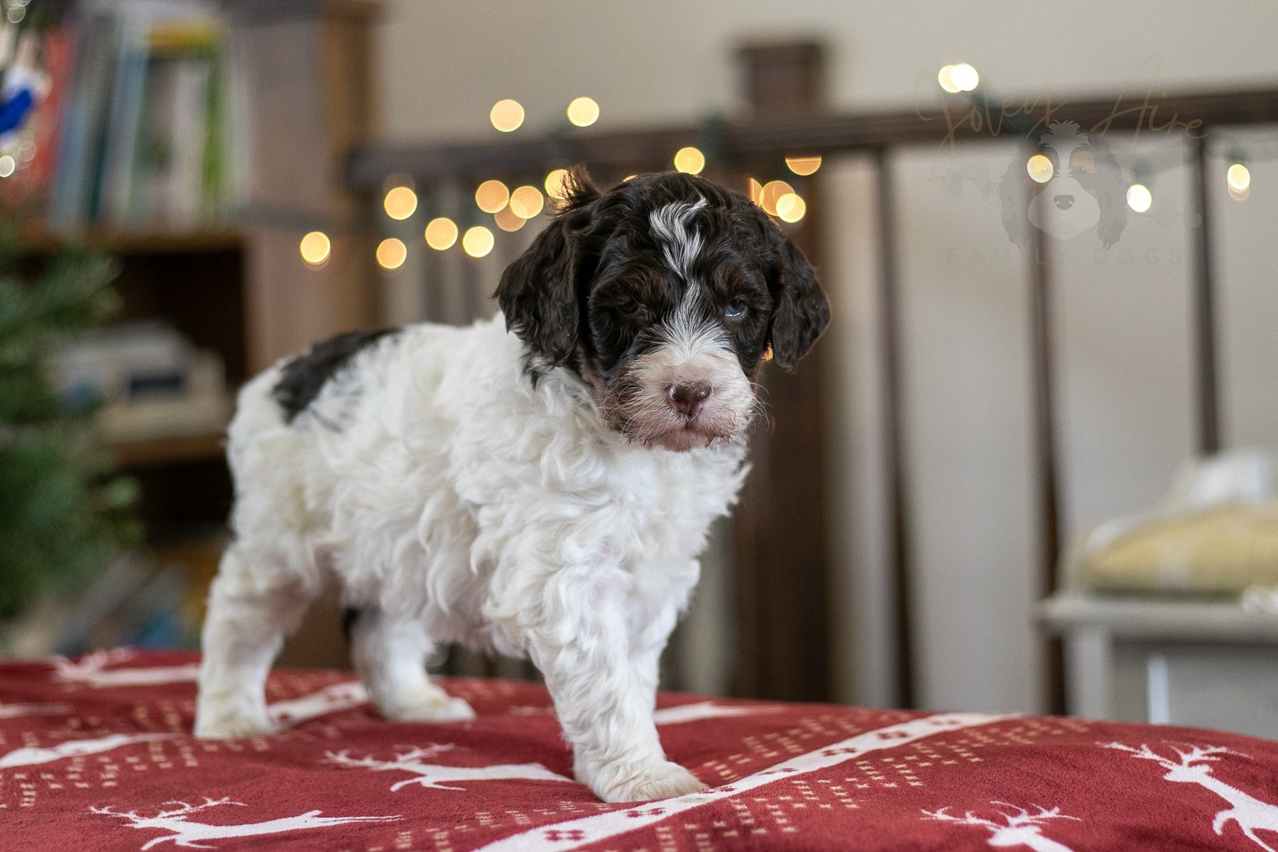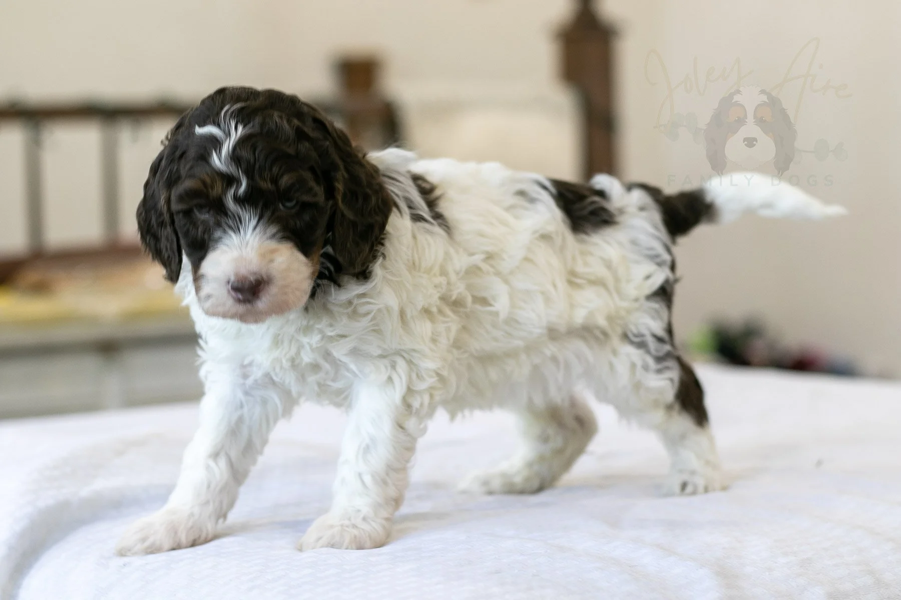 Behold, the name Gandalf the White is most fitting for this fair chocolate parti pup, for he is clad in robes of snowy white that gleam like the First Light of Eärendil. This noble creature is an F1b Bernedoodle, three parts Poodle to one part Bernese, destined to grow to a stature of forty to fifty pounds—just the right size for a loyal companion of steadfast heart.