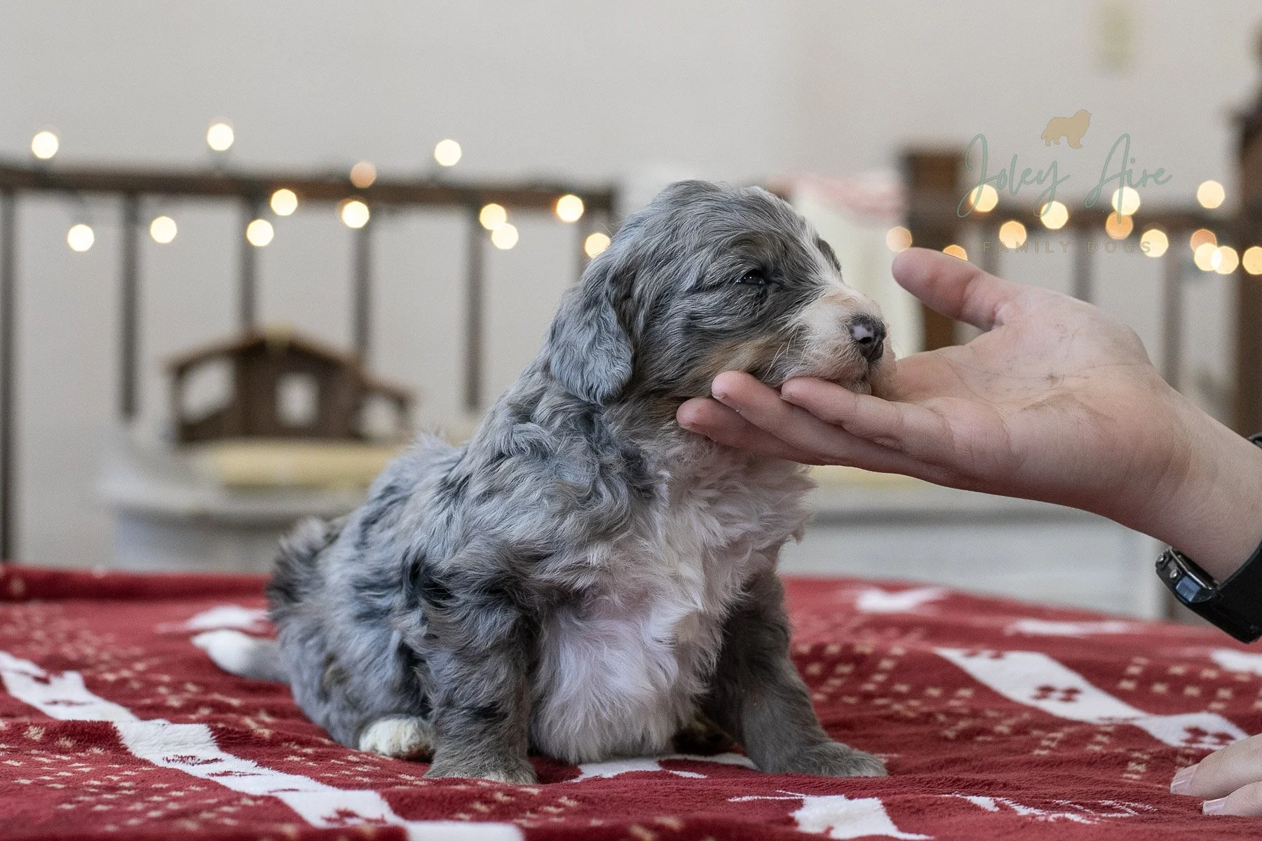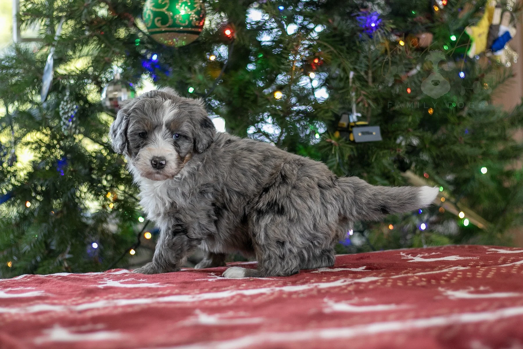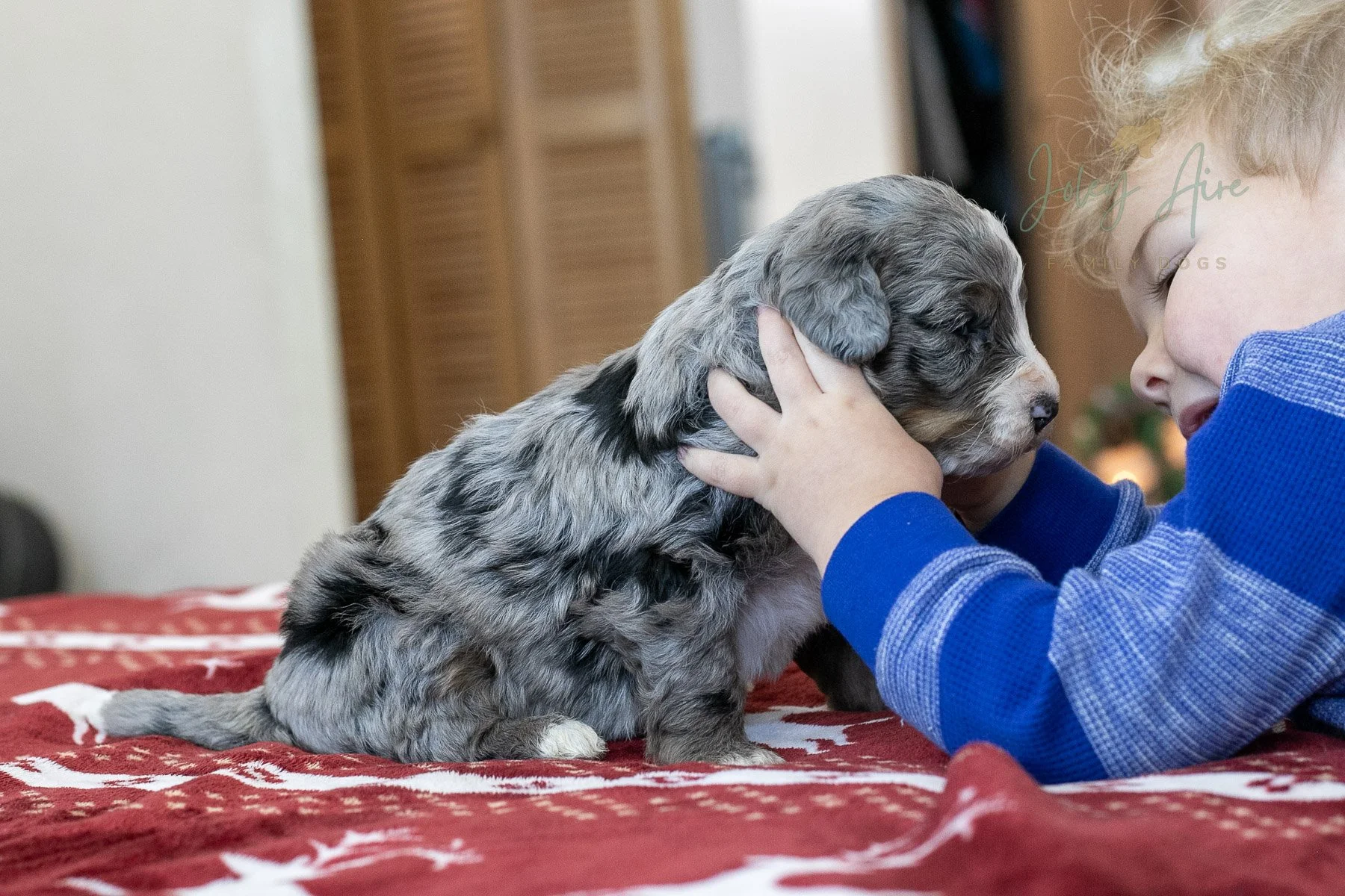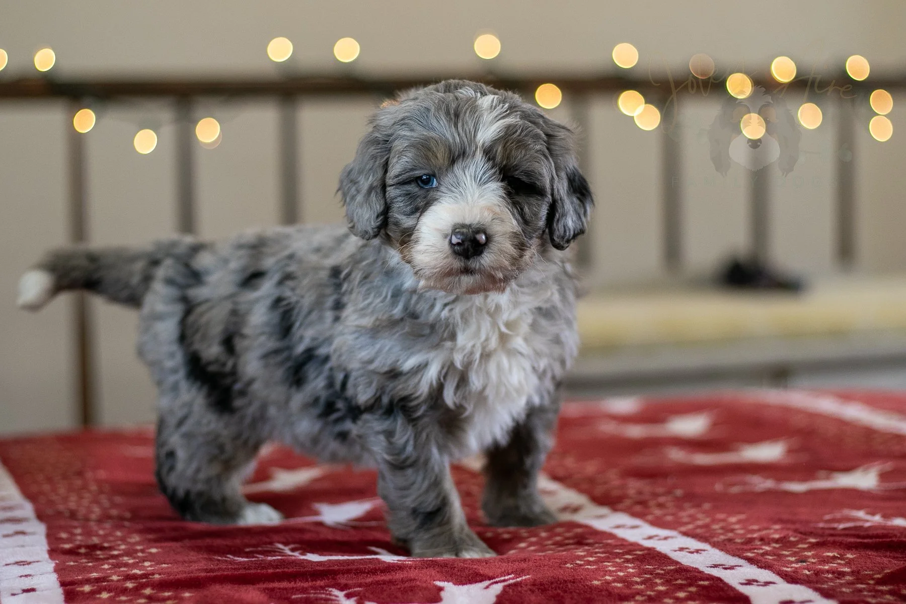 This adorable little boy is Rainier, a tri-color merle male Bernedoodle puppy from Winston and Bonnie. His most charming feature is his stunning merle coat with beautiful patches of black, white, and tan, making him truly one-of-a-kind. Rainier is expected to grow to a loving 60-80 lbs and will surely inherit the gentle, affectionate temperament of his wonderful parents. Raised with care in our Illinois home, Rainier will be ready to join his new family starting January 10, 2026!