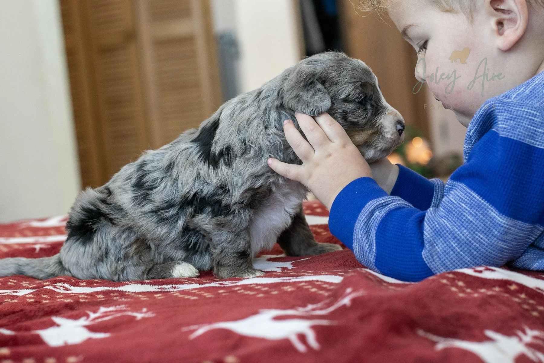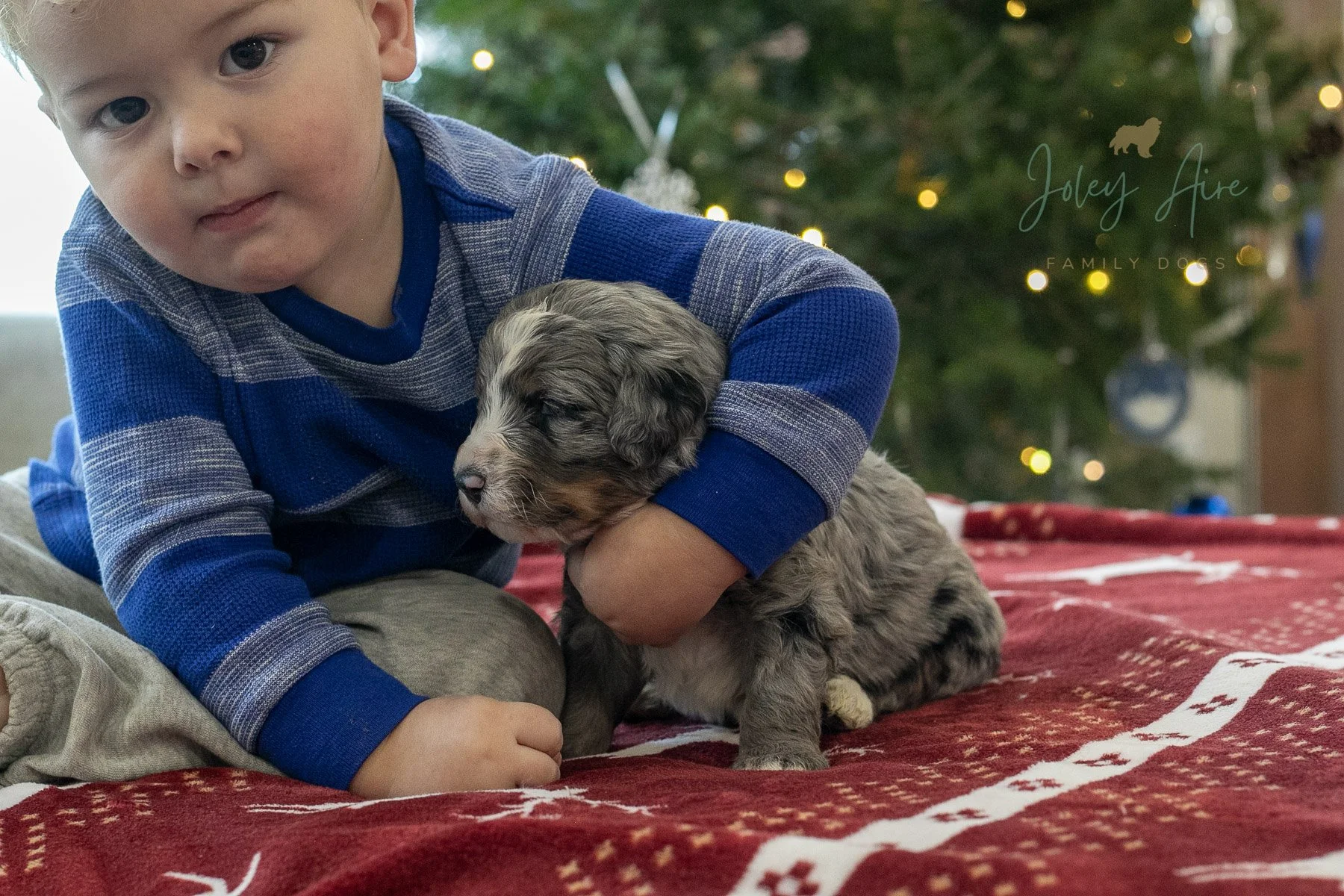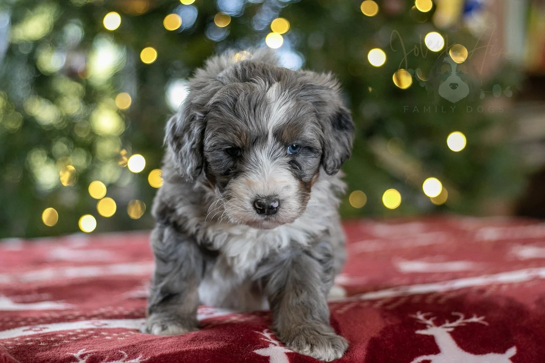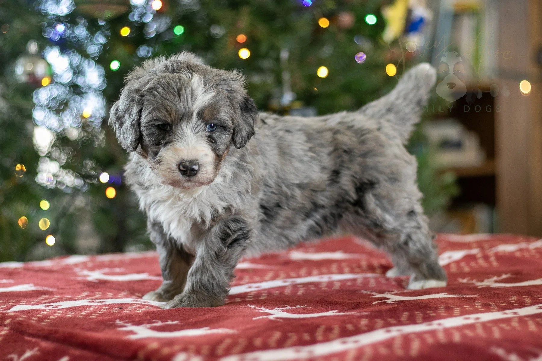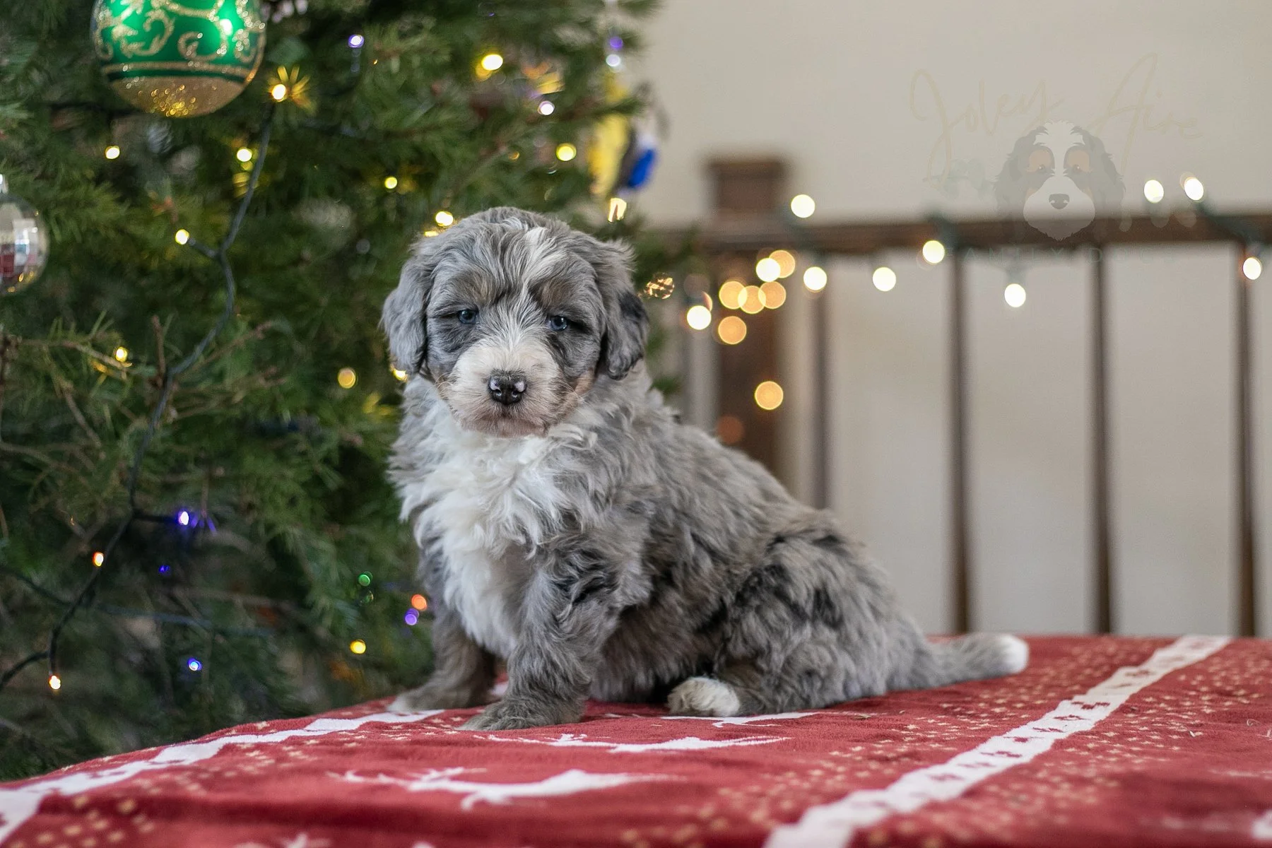 This adorable little boy is Rainier, a tri-color merle male Bernedoodle puppy from Winston and Bonnie. His most charming feature is his stunning merle coat with beautiful patches of black, white, and tan, making him truly one-of-a-kind. Rainier is expected to grow to a loving 60-80 lbs and will surely inherit the gentle, affectionate temperament of his wonderful parents. Raised with care in our Illinois home, Rainier will be ready to join his new family starting January 10, 2026!
