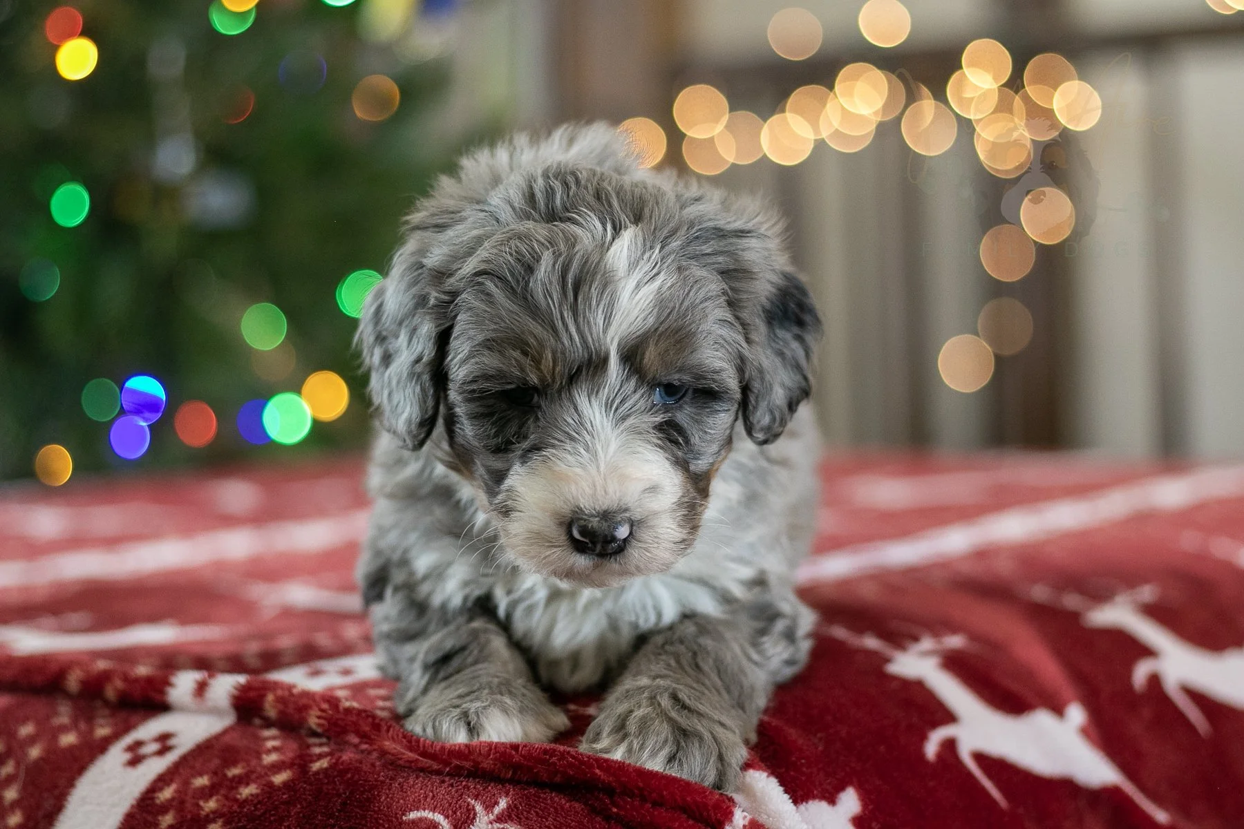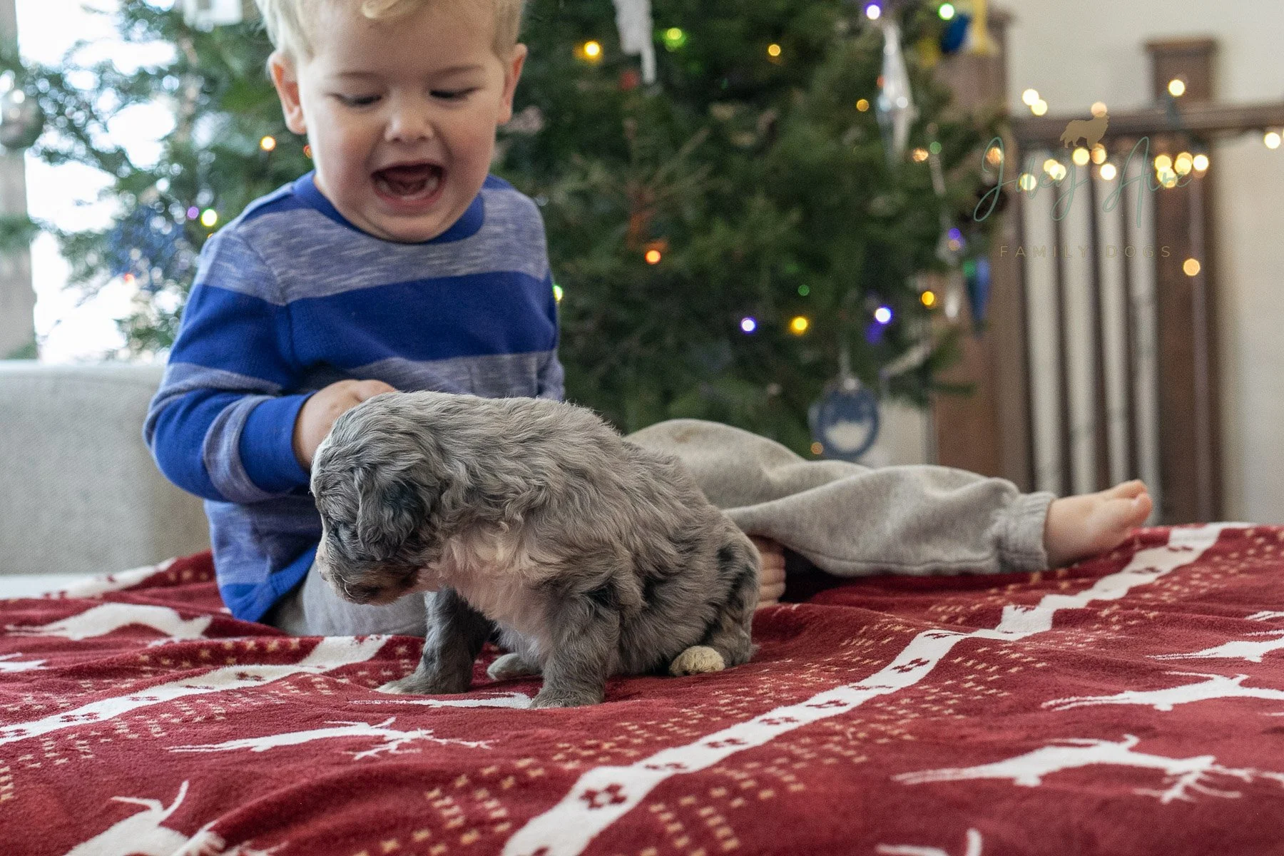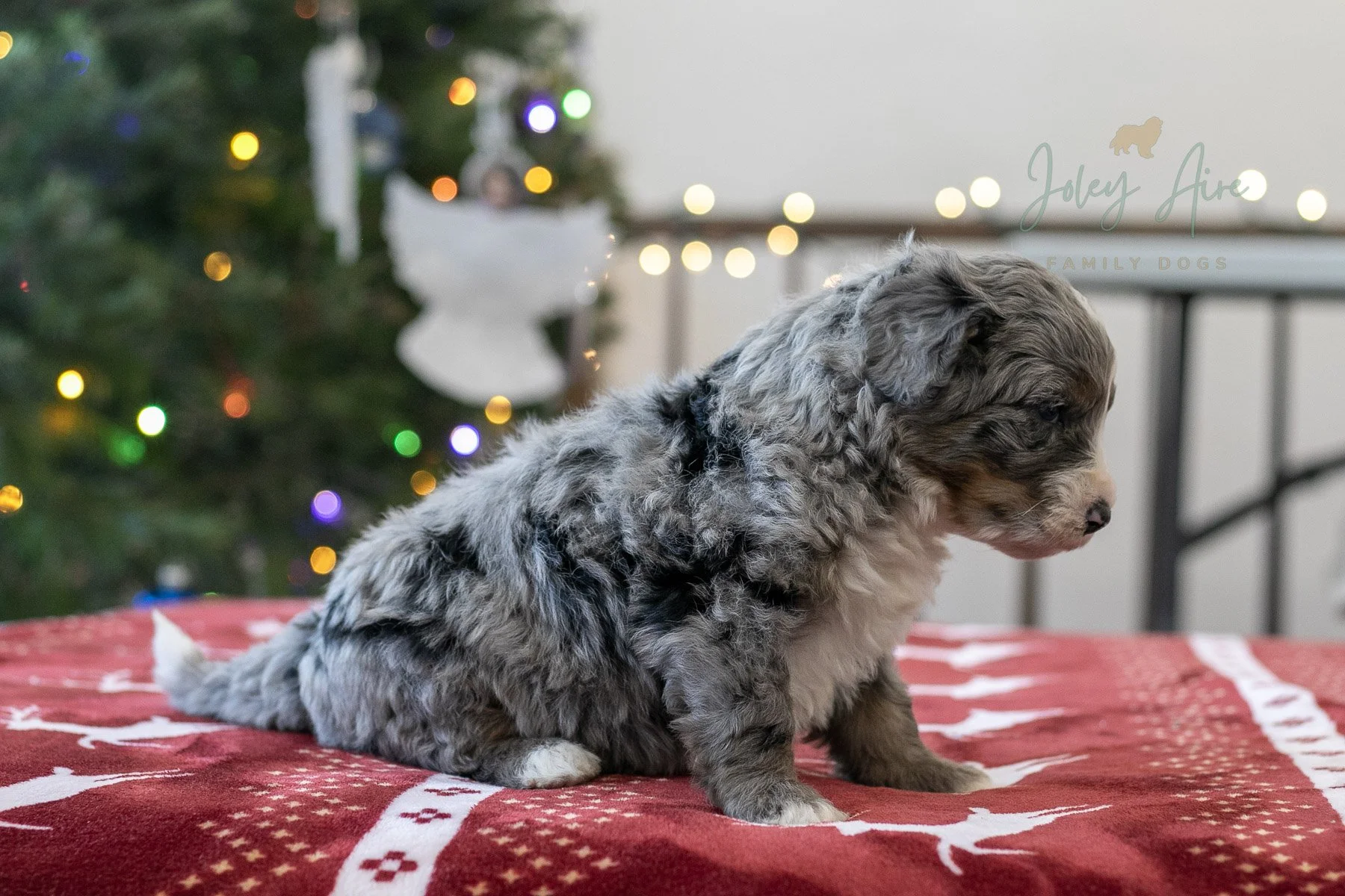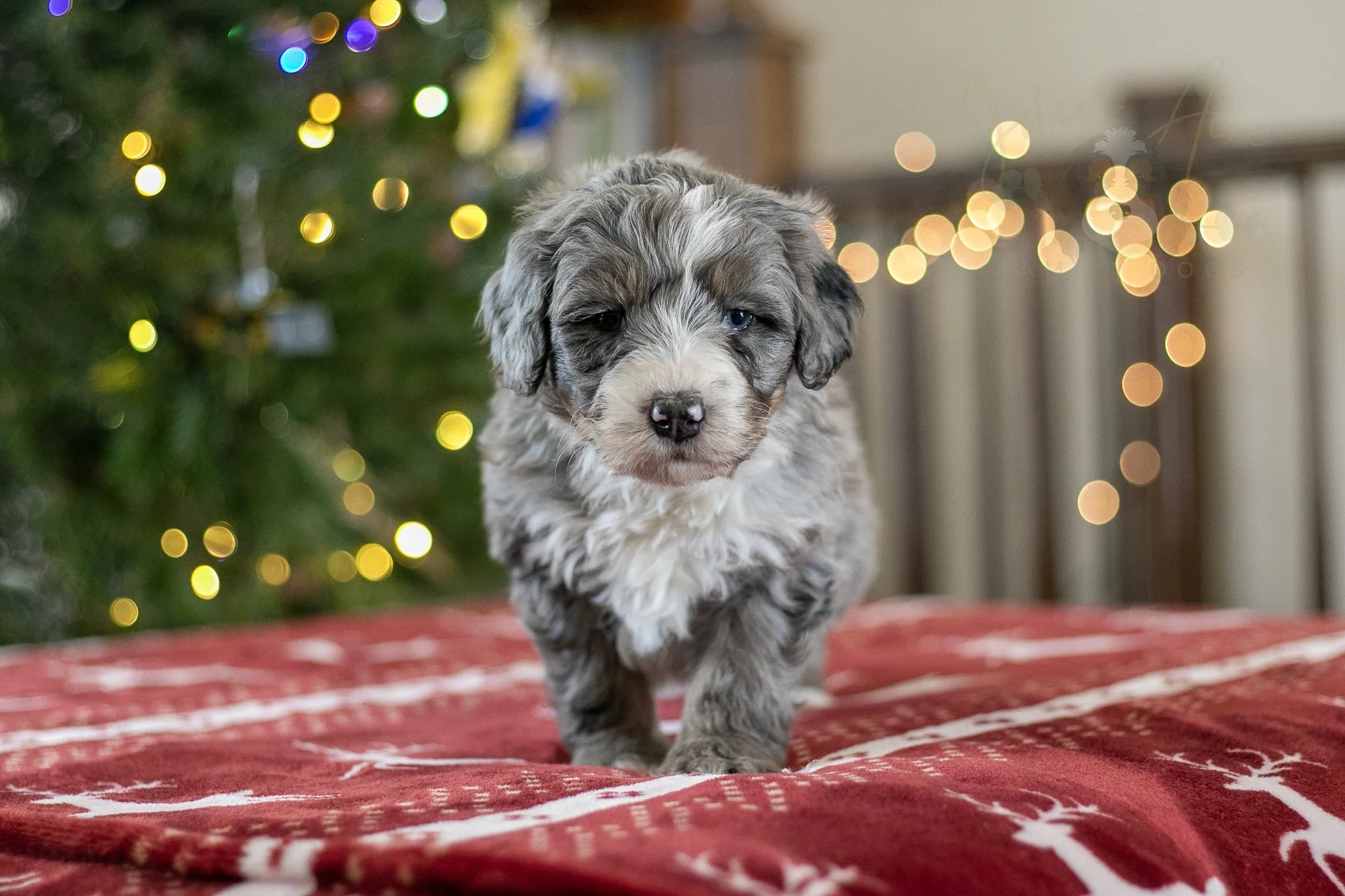 This adorable little boy is Rainier, a tri-color merle male Bernedoodle puppy from Winston and Bonnie. His most charming feature is his stunning merle coat with beautiful patches of black, white, and tan, making him truly one-of-a-kind. Rainier is expected to grow to a loving 60-80 lbs and will surely inherit the gentle, affectionate temperament of his wonderful parents. Raised with care in our Illinois home, Rainier will be ready to join his new family starting January 10, 2026!