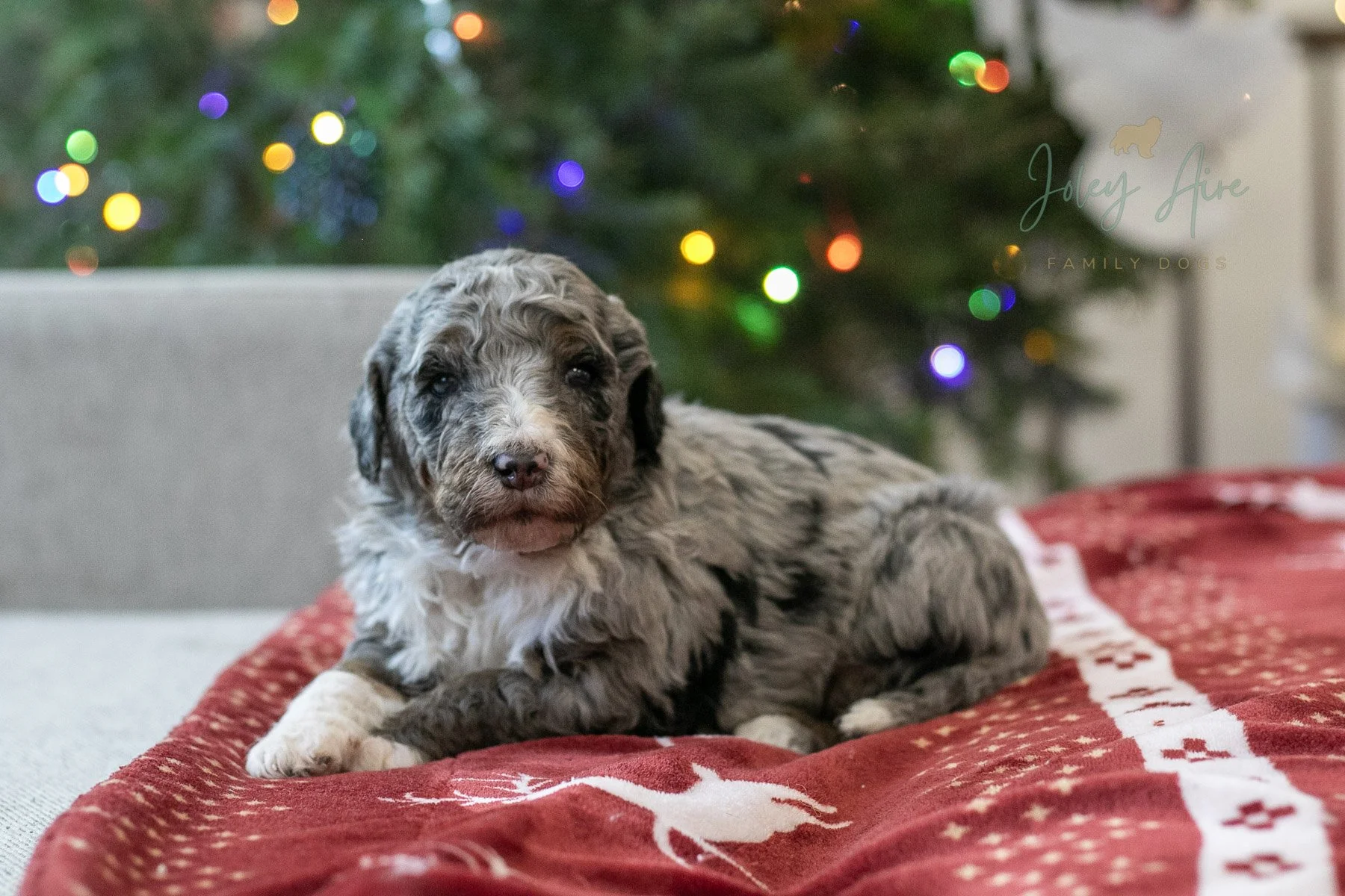 Winston is a purebred, AKC registered small standard poodle and an exciting upcoming stud for our program. His unique coloring is called Blue Merle Phantom. We can’t wait to see what his Bernedoodle puppies look like! Not only is he gorgeous, but his personality is amazing! He’s super sweet and loving!