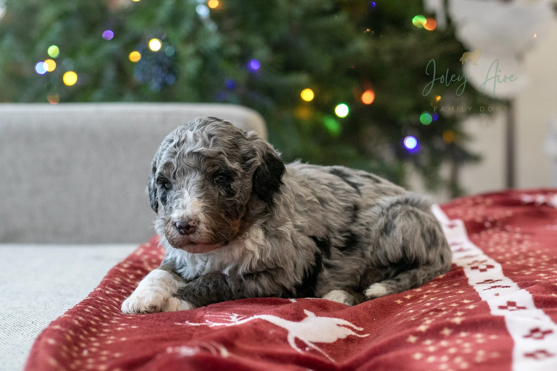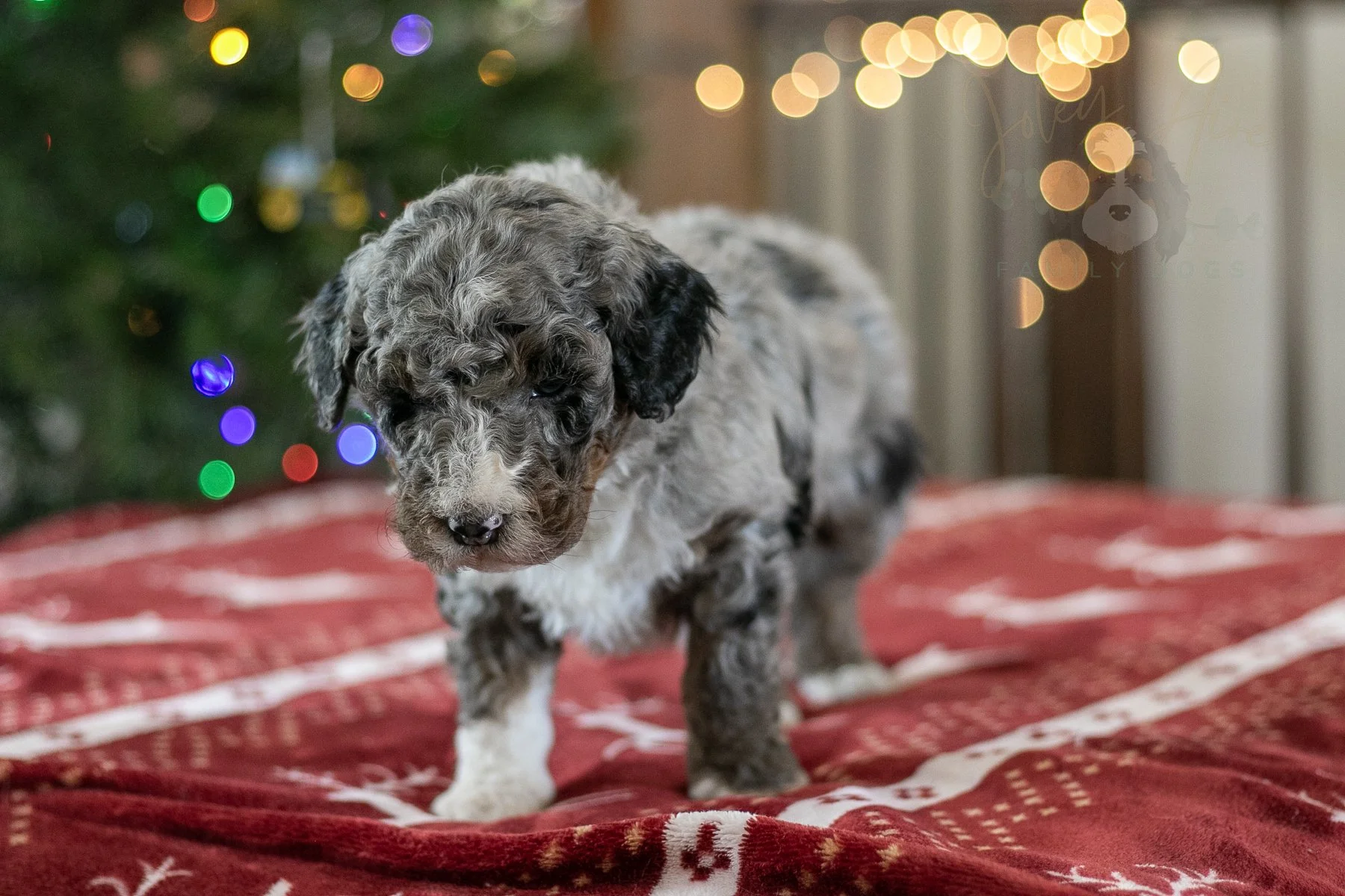 Hear now, kind friends, the tale of brave Samwise, a noble tri-color Bernedoodle pup. His coat shines with deep black, soft grey, warm brown, and bright white — like the strong armor of a loyal friend. Born from the graceful Poodle and mighty Bernese Mountain Dog, this rare F1b lad will grow to forty to fifty pounds: bold yet gentle, ready for all adventures.