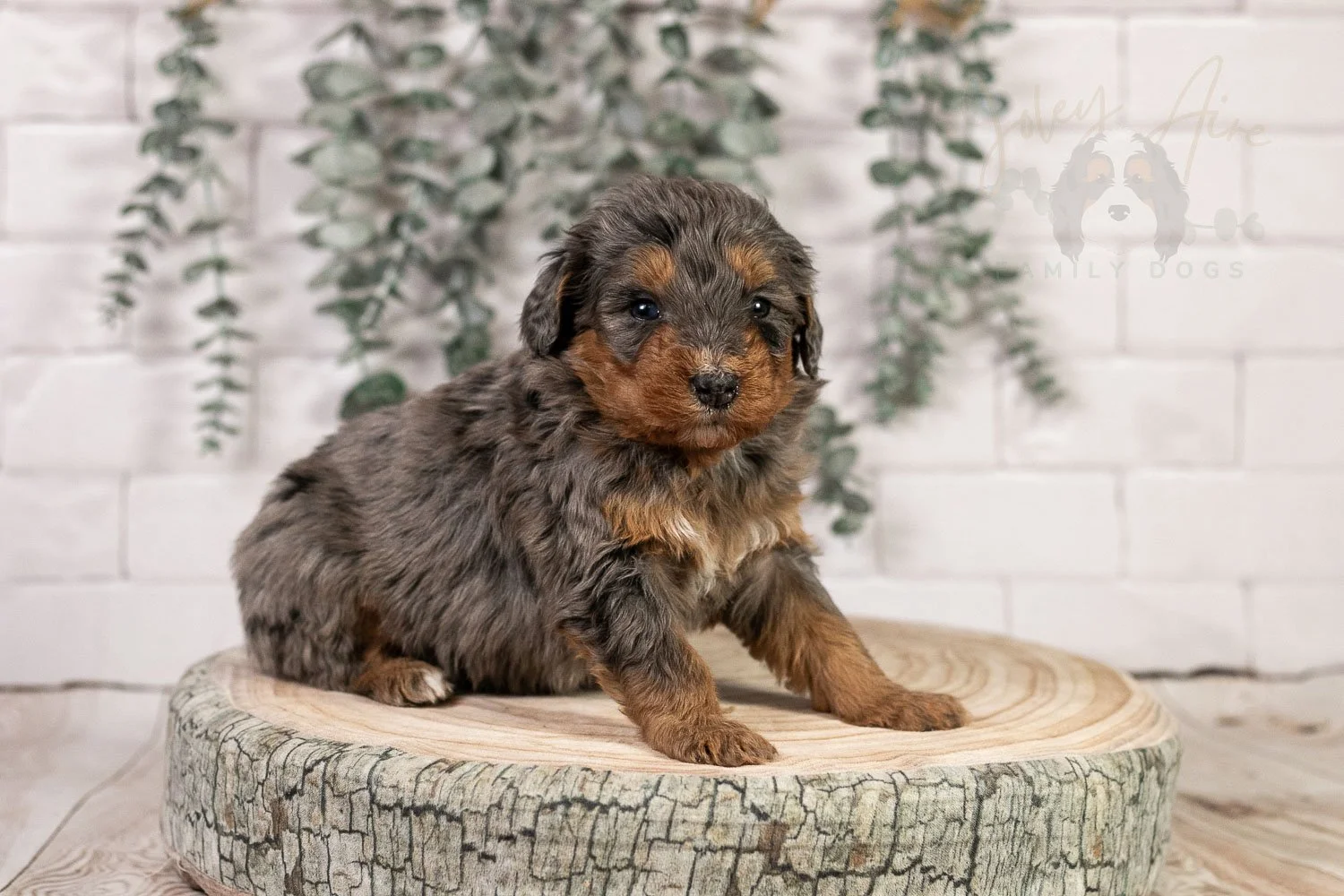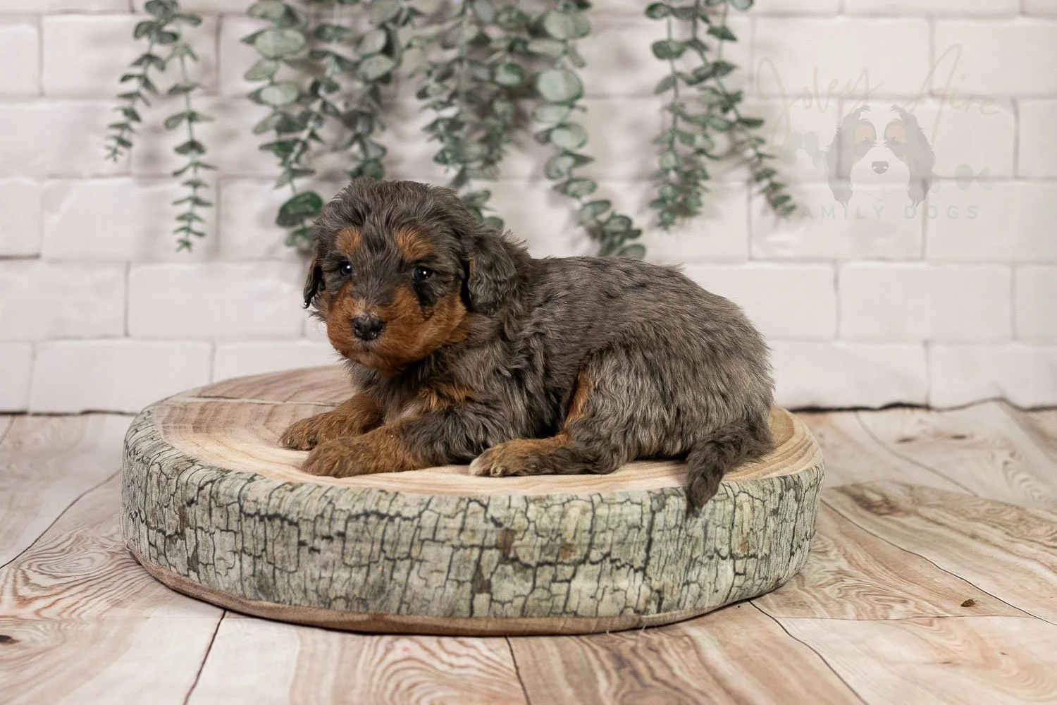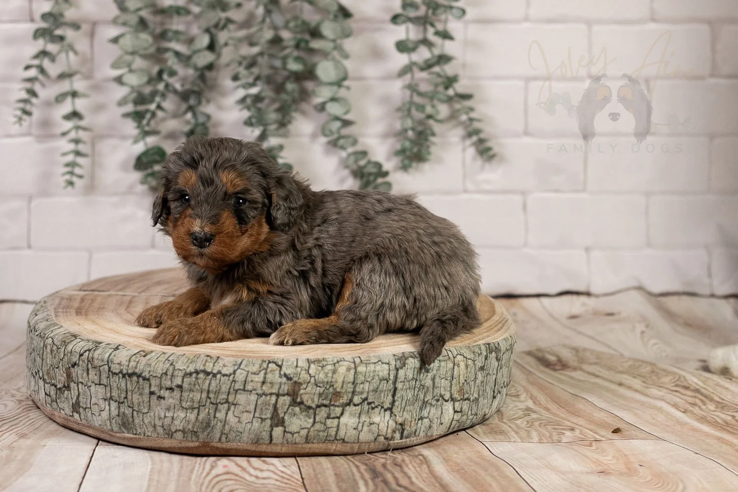 Summit is a beautiful female F1 Bernedoodle with a phantom merle coat featuring softer, more subtle black merle markings. Born on December 25, 2025, she comes from our calm, loving Lulu and our laid-back, intelligent Winston. Raised in our home with daily interaction from our children and other dogs, Summit is receiving intentional early socialization. We expect her to mature into a steady, affectionate family companion in the 70–90 lb range.
