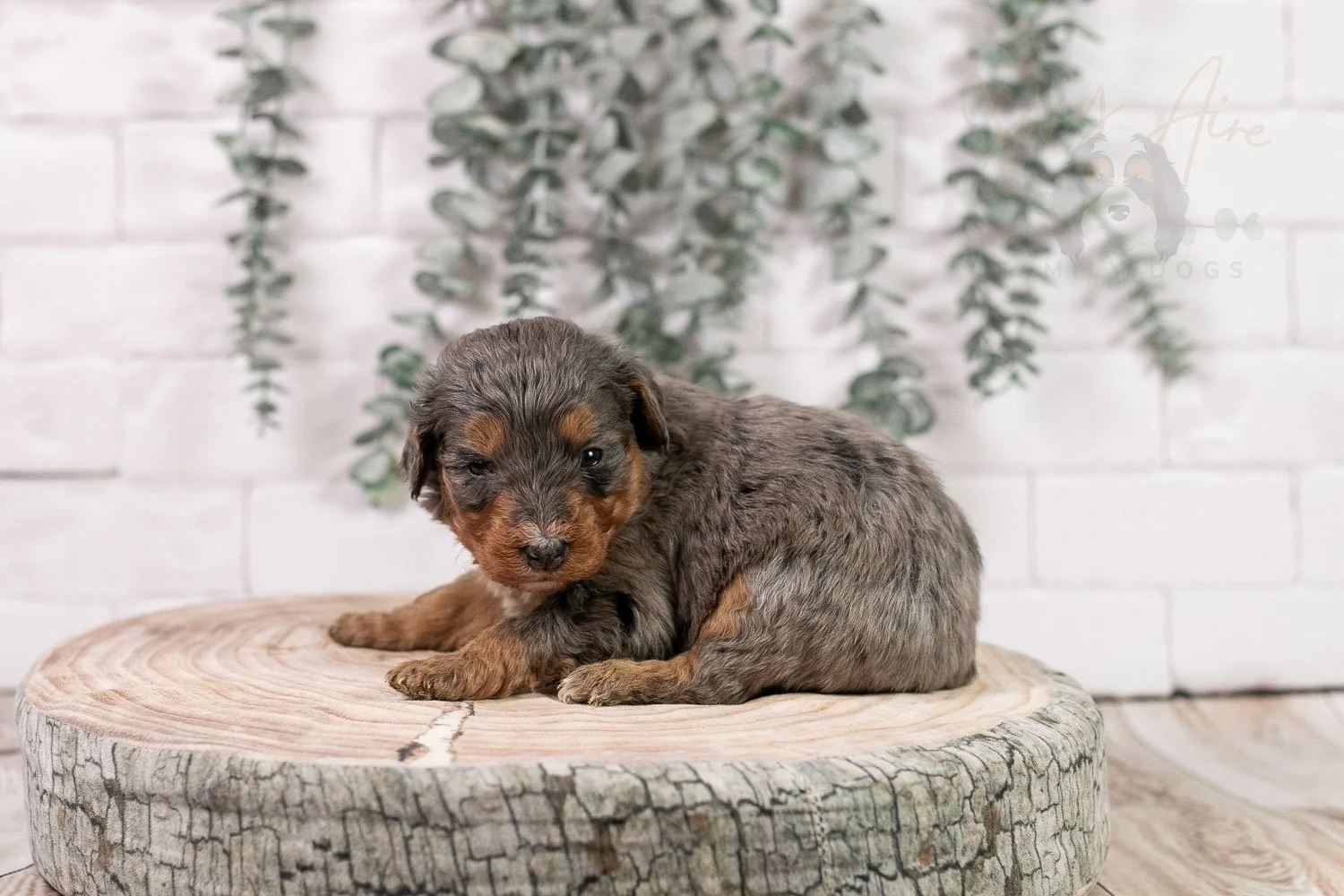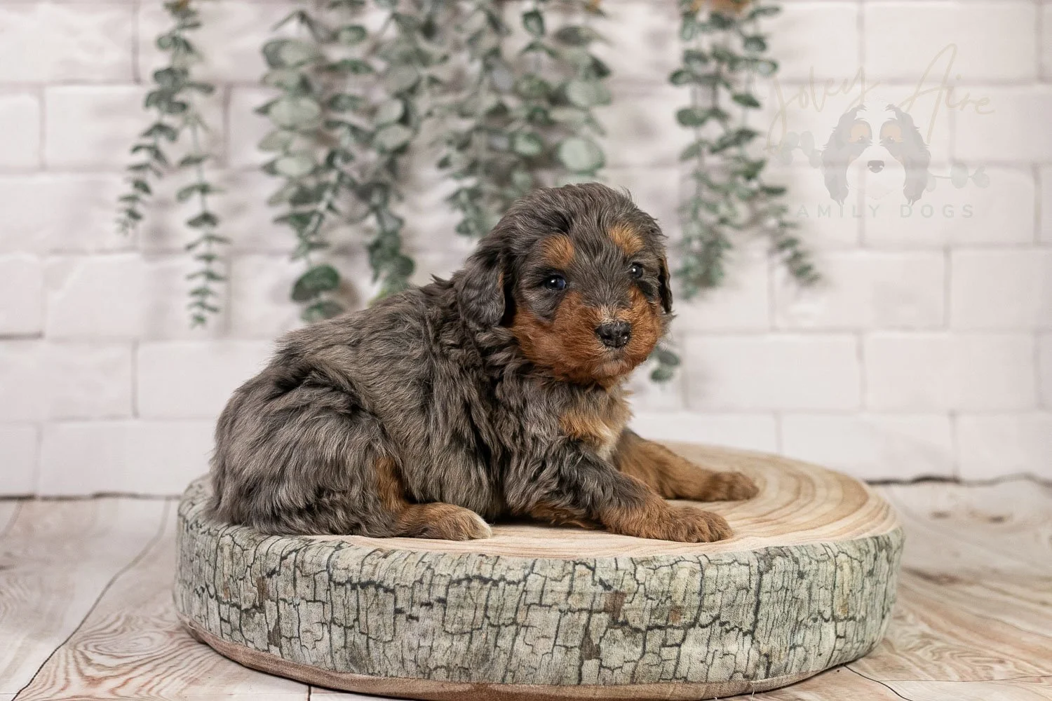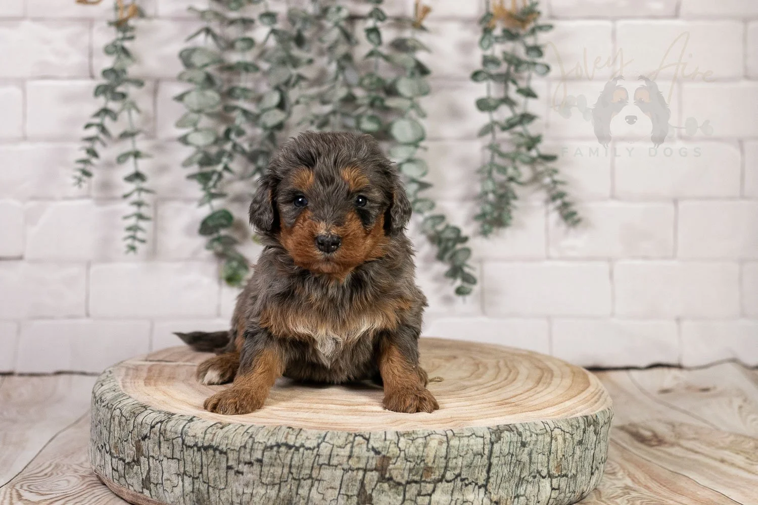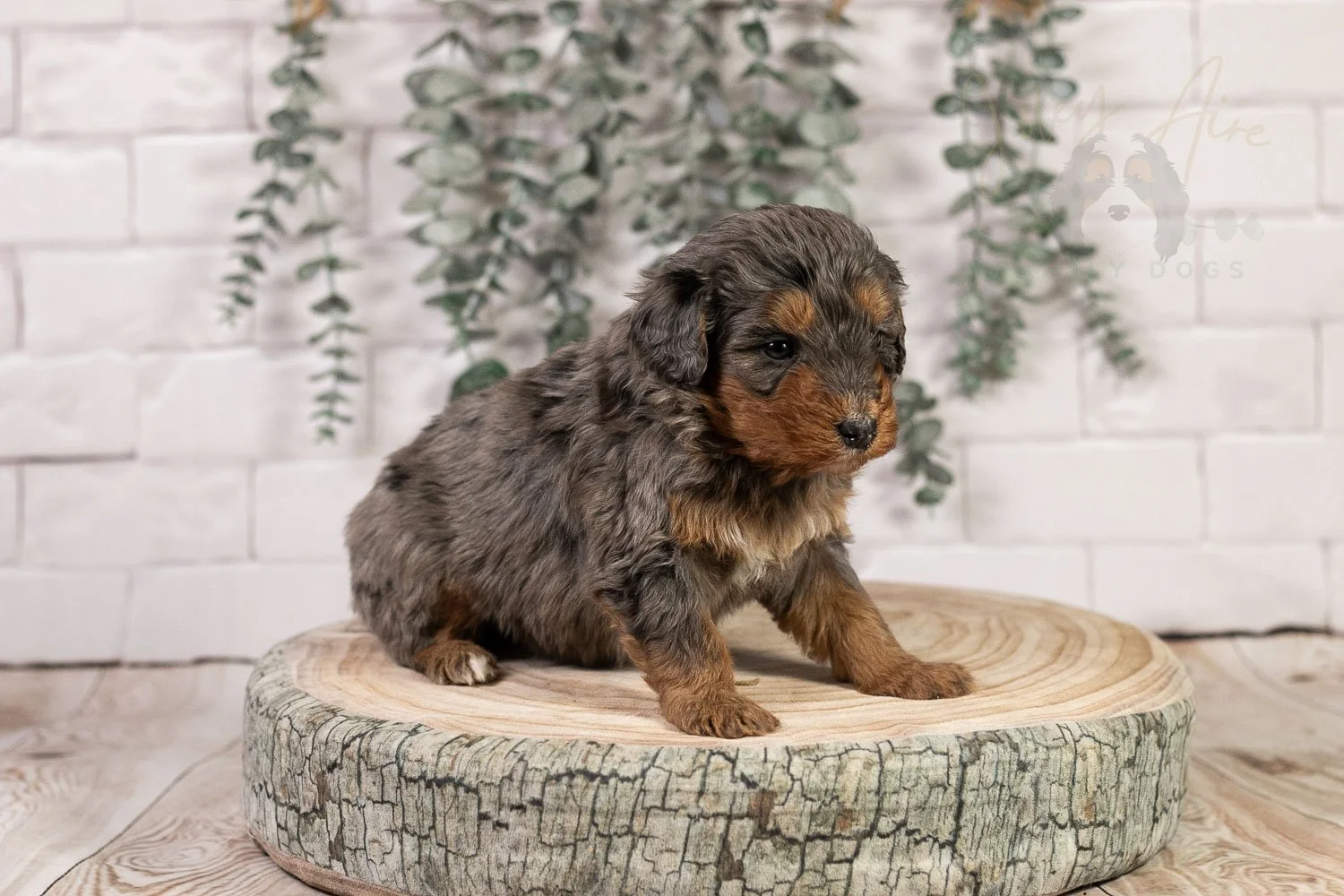 Summit is a beautiful female F1 Bernedoodle with a phantom merle coat featuring softer, more subtle black merle markings. Born on December 25, 2025, she comes from our calm, loving Lulu and our laid-back, intelligent Winston. Raised in our home with daily interaction from our children and other dogs, Summit is receiving intentional early socialization. We expect her to mature into a steady, affectionate family companion in the 70–90 lb range.