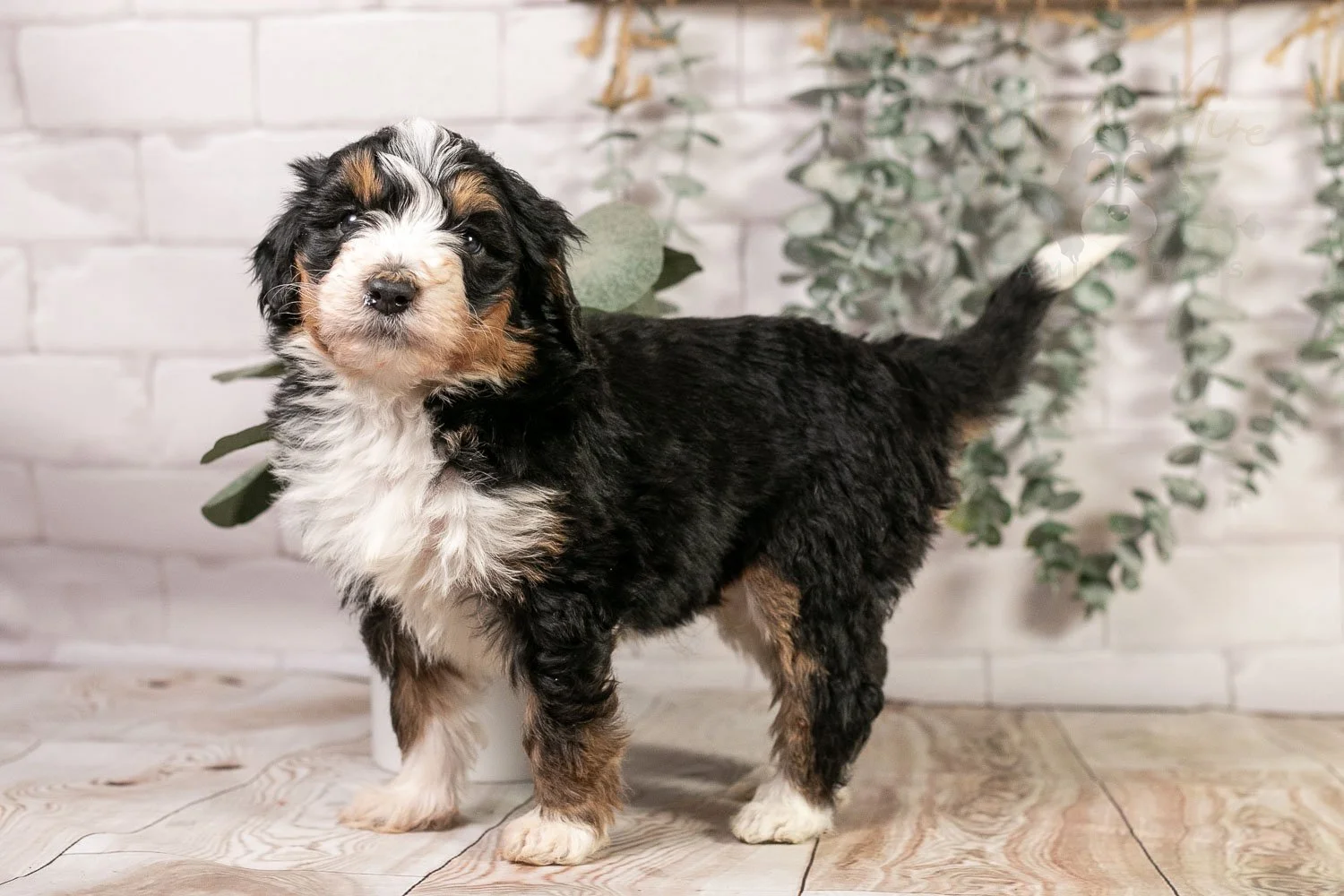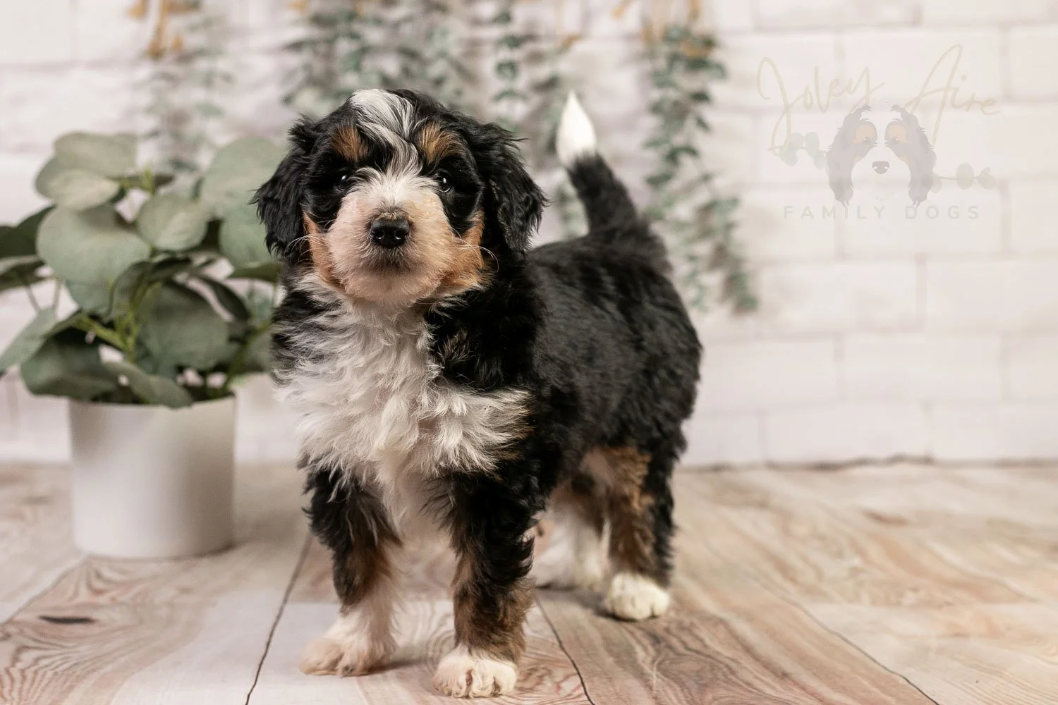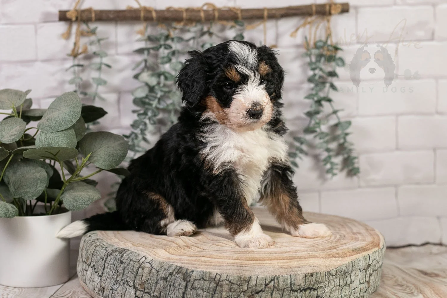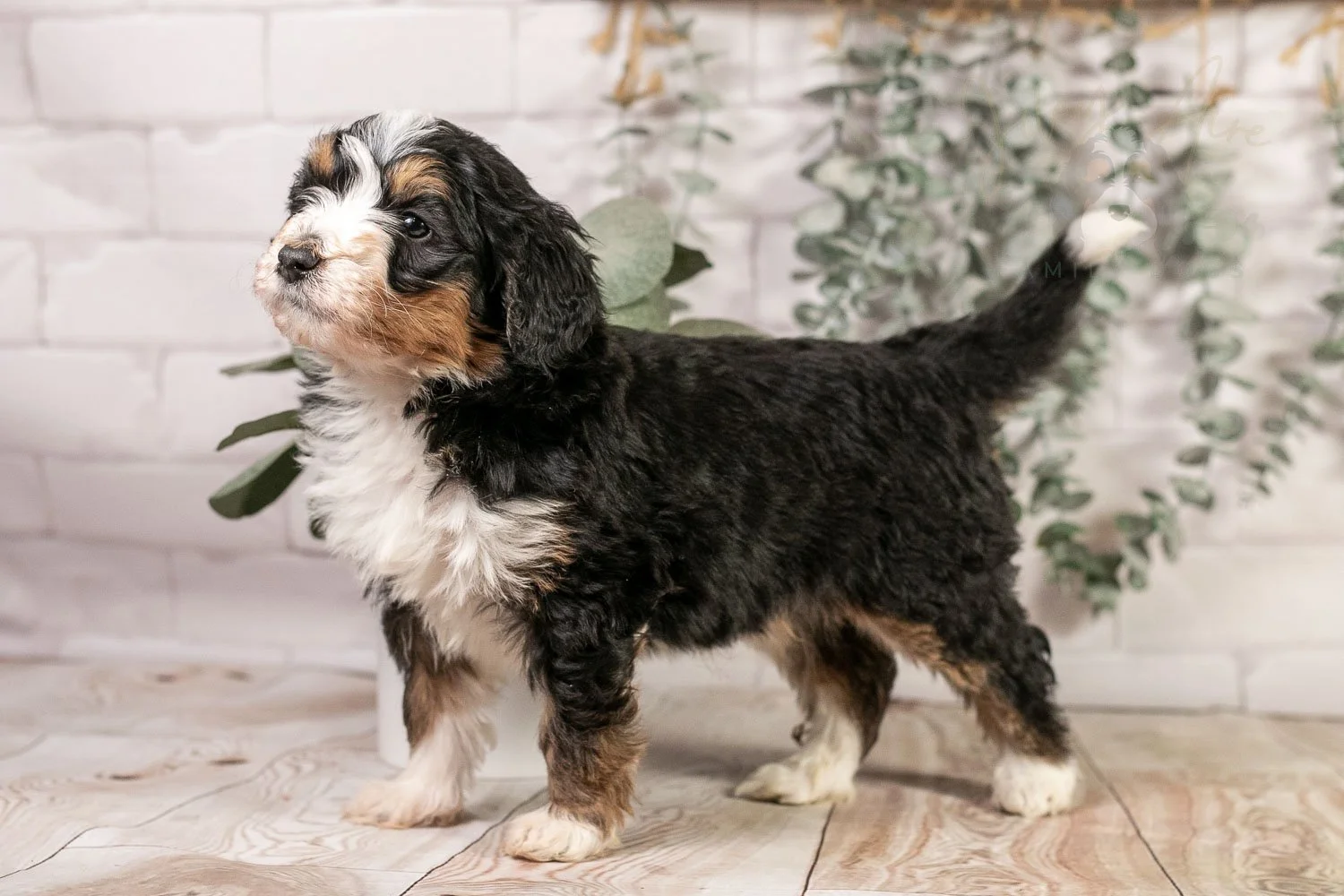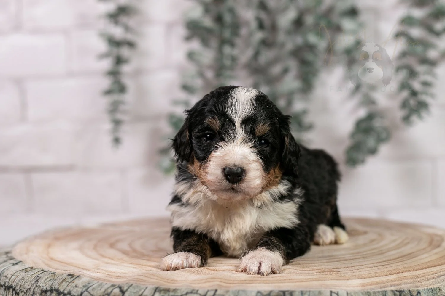 Torch is a striking tri-color male F1 Bernedoodle from our Winter Olympics litter, born on December 25, 2025. He is the result of our calm, loving Lulu and our laid-back, intelligent Winston. Raised in our home with daily interaction from our children and other dogs, Torch is receiving thoughtful early socialization. We expect him to mature into a steady, affectionate family companion in the 70–90 lb range.