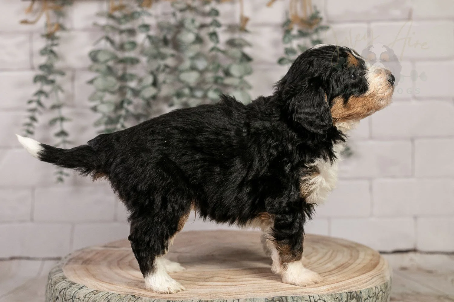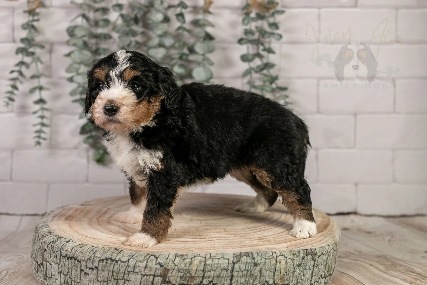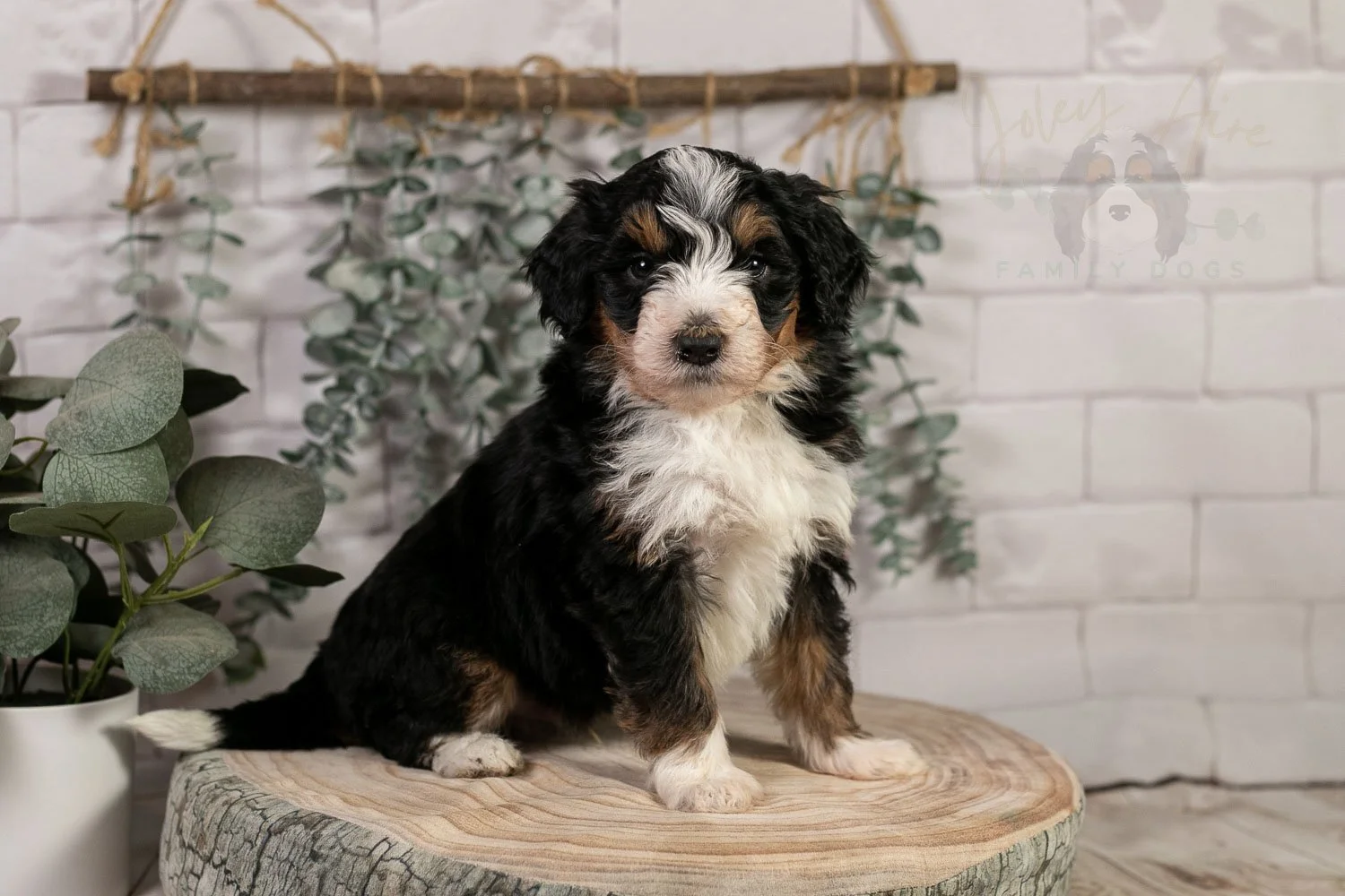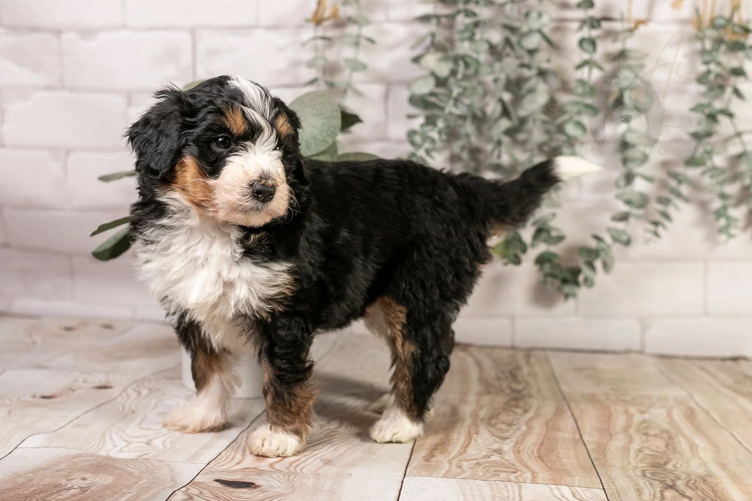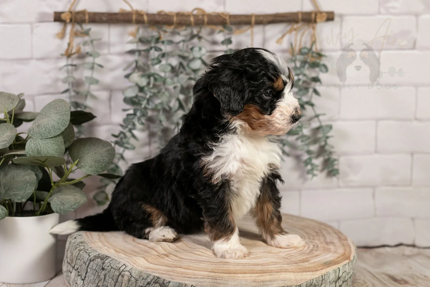 Torch is a striking tri-color male F1 Bernedoodle from our Winter Olympics litter, born on December 25, 2025. He is the result of our calm, loving Lulu and our laid-back, intelligent Winston. Raised in our home with daily interaction from our children and other dogs, Torch is receiving thoughtful early socialization. We expect him to mature into a steady, affectionate family companion in the 70–90 lb range.