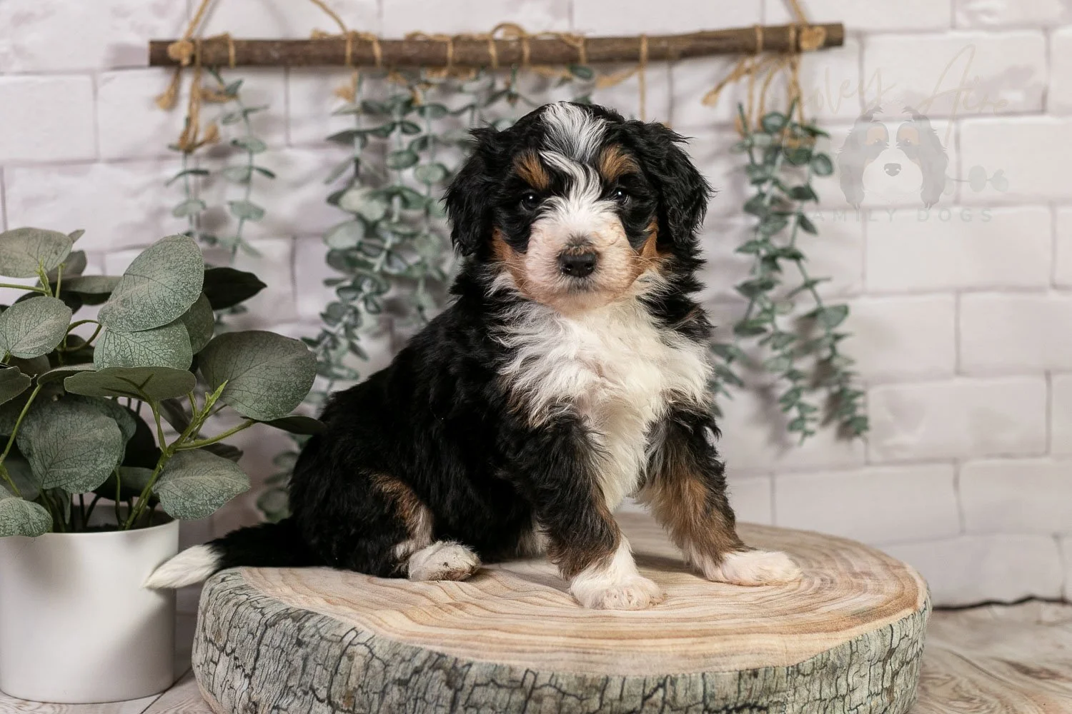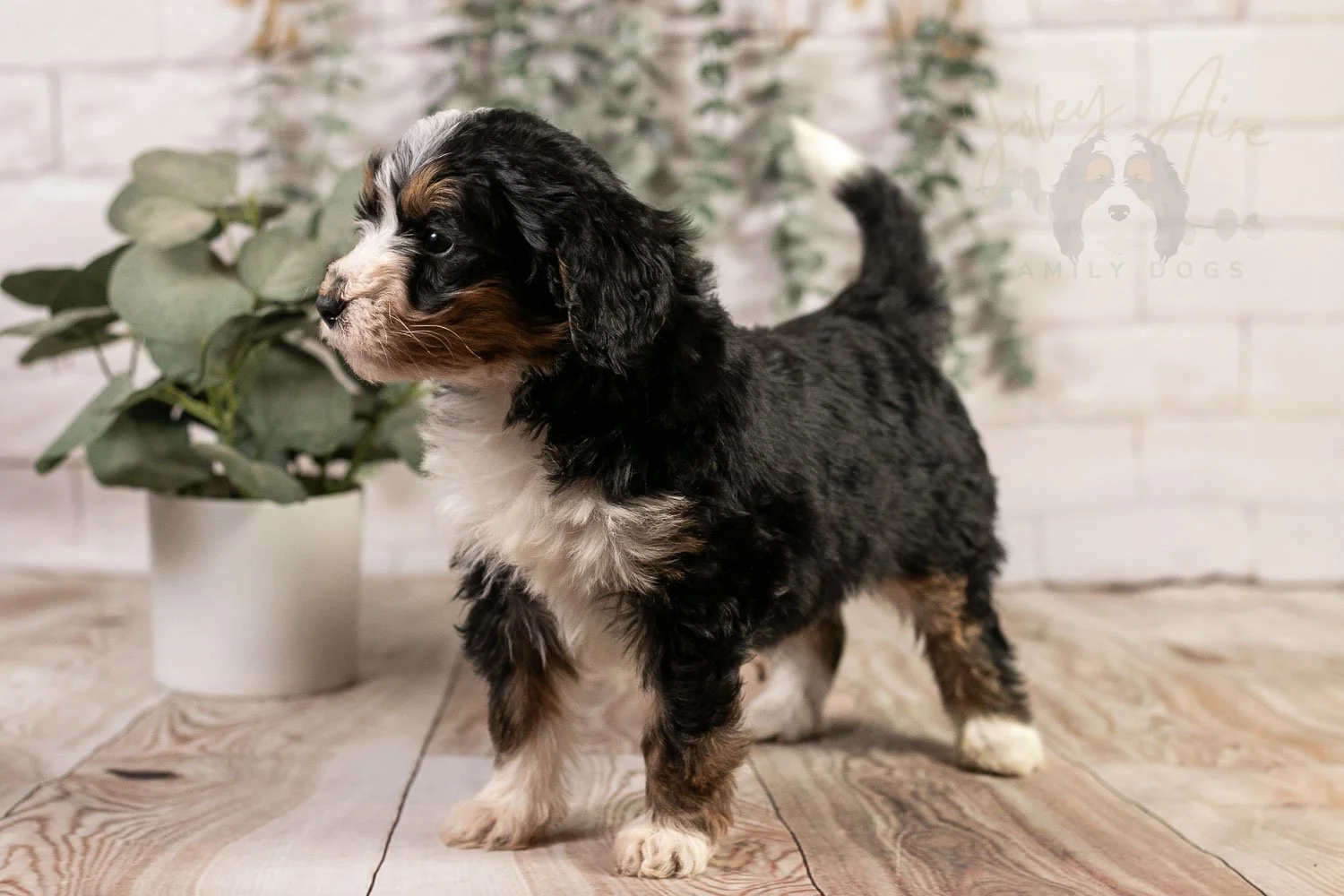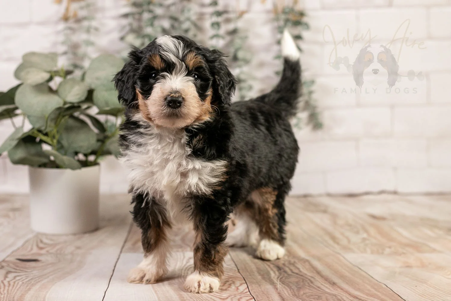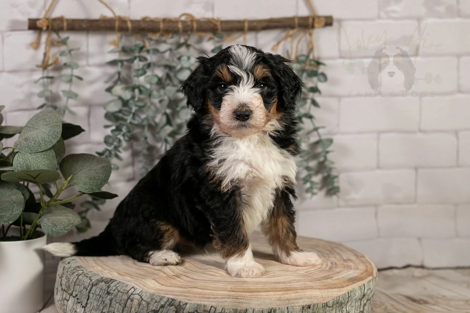 Torch is a striking tri-color male F1 Bernedoodle from our Winter Olympics litter, born on December 25, 2025. He is the result of our calm, loving Lulu and our laid-back, intelligent Winston. Raised in our home with daily interaction from our children and other dogs, Torch is receiving thoughtful early socialization. We expect him to mature into a steady, affectionate family companion in the 70–90 lb range.