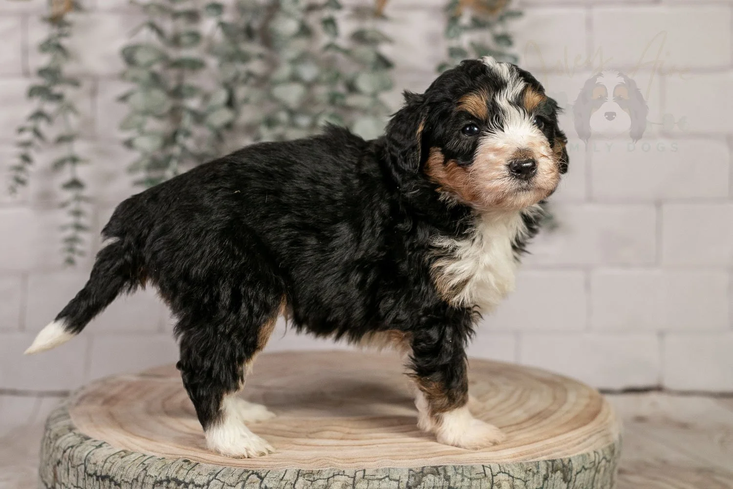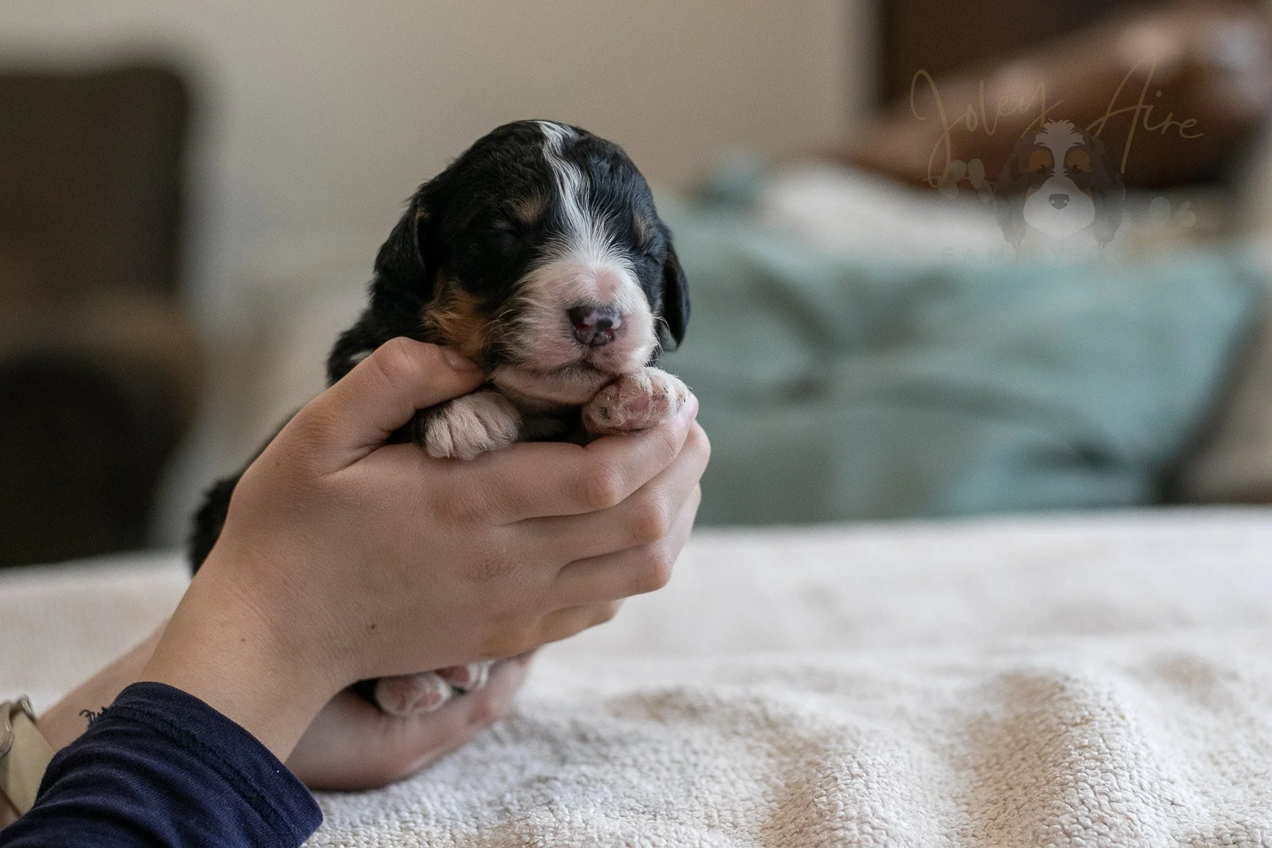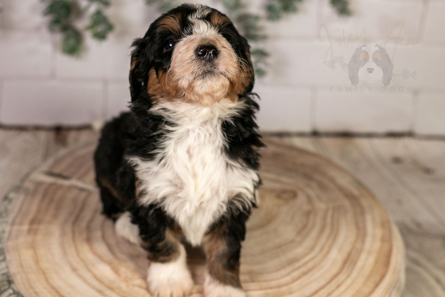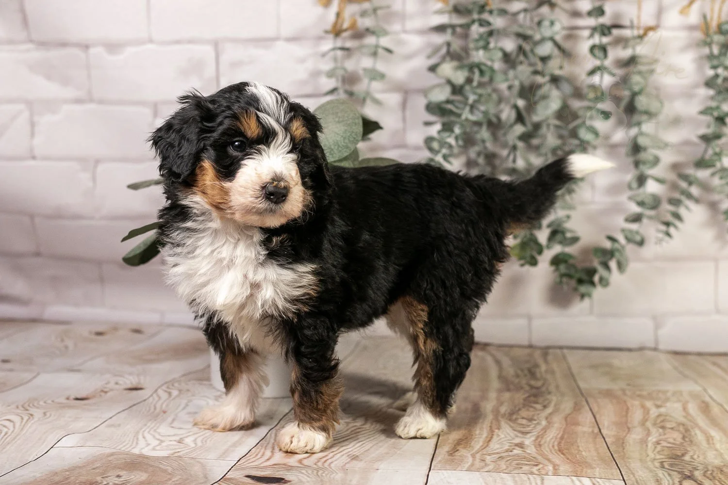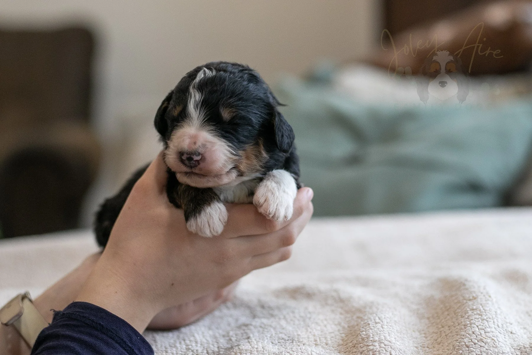Torch is a striking tri-color male F1 Bernedoodle from our Winter Olympics litter, born on December 25, 2025. He is the result of our calm, loving Lulu and our laid-back, intelligent Winston. Raised in our home with daily interaction from our children and other dogs, Torch is receiving thoughtful early socialization. We expect him to mature into a steady, affectionate family companion in the 70–90 lb range.