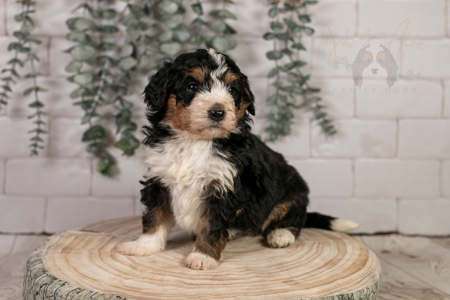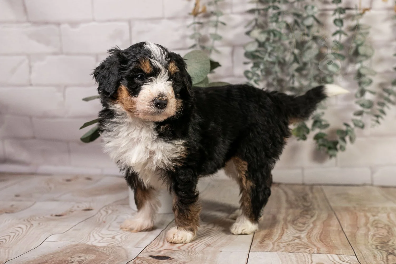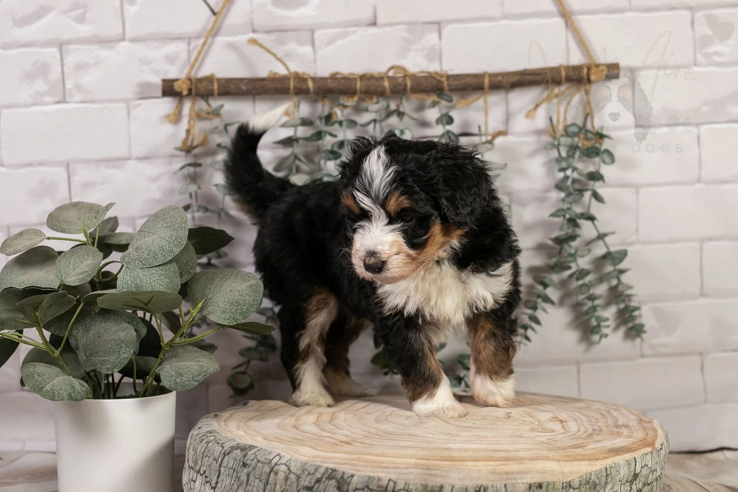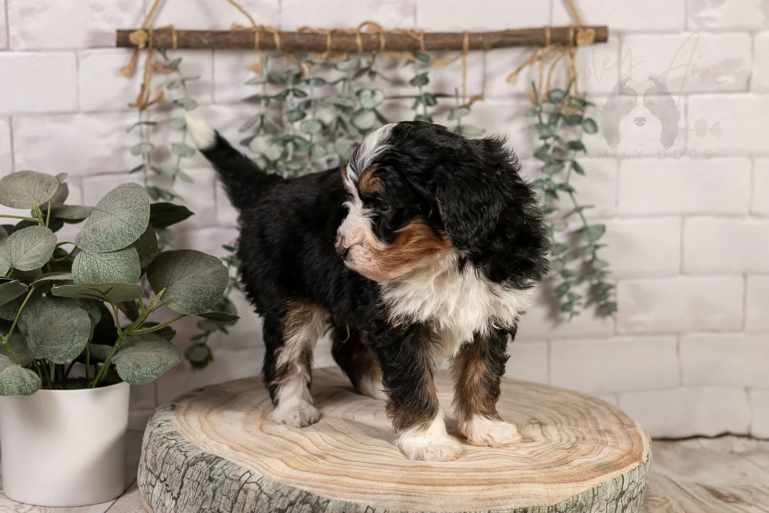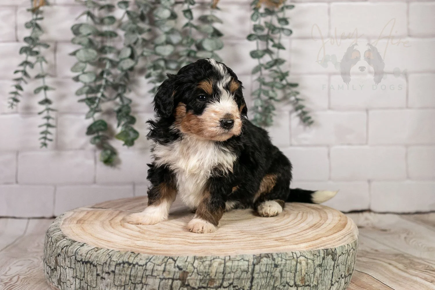 Torch is a striking tri-color male F1 Bernedoodle from our Winter Olympics litter, born on December 25, 2025. He is the result of our calm, loving Lulu and our laid-back, intelligent Winston. Raised in our home with daily interaction from our children and other dogs, Torch is receiving thoughtful early socialization. We expect him to mature into a steady, affectionate family companion in the 70–90 lb range.