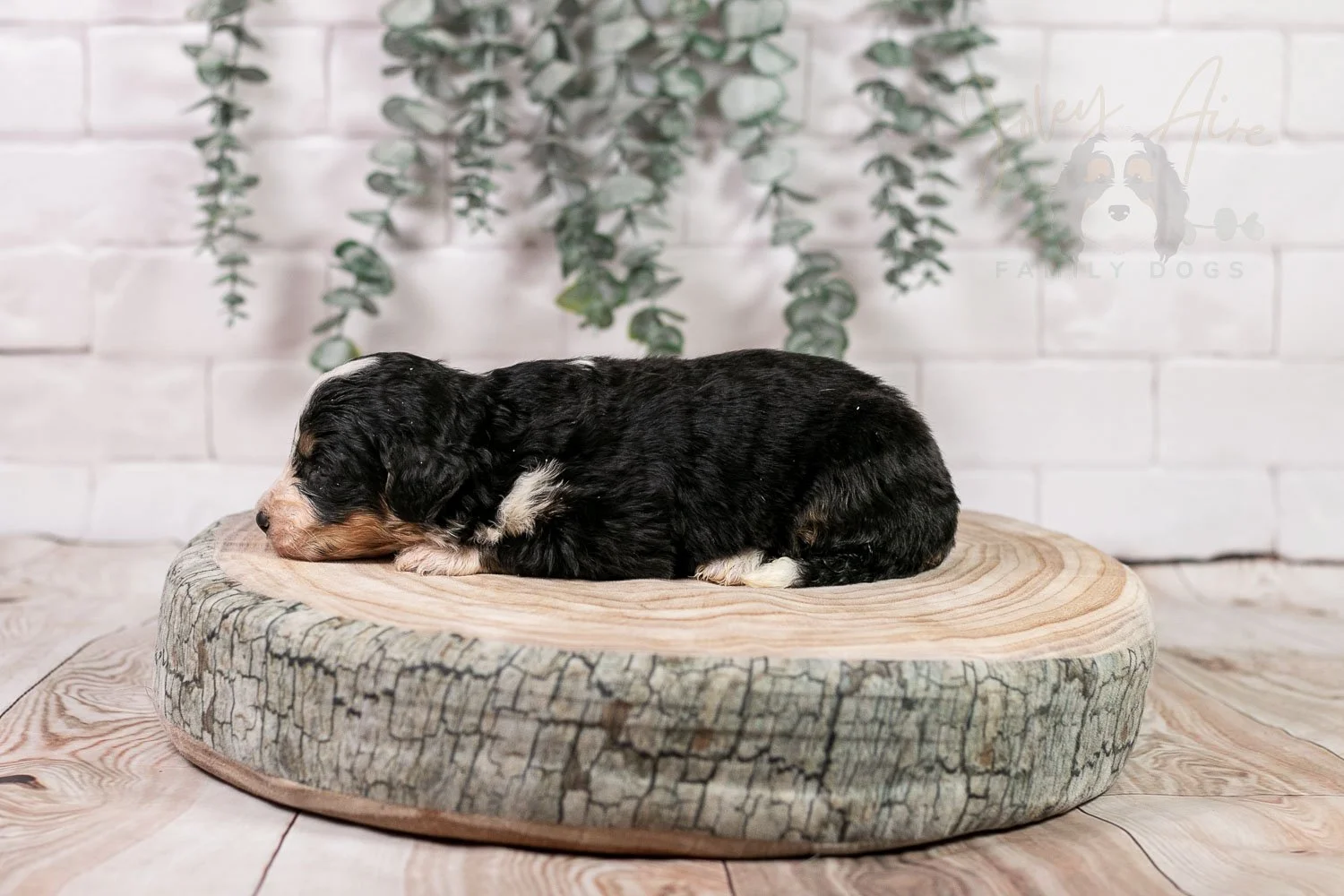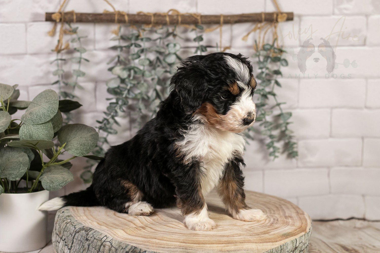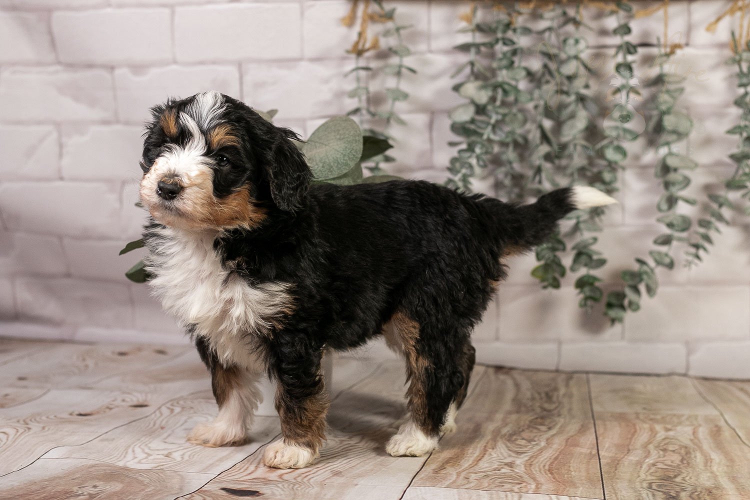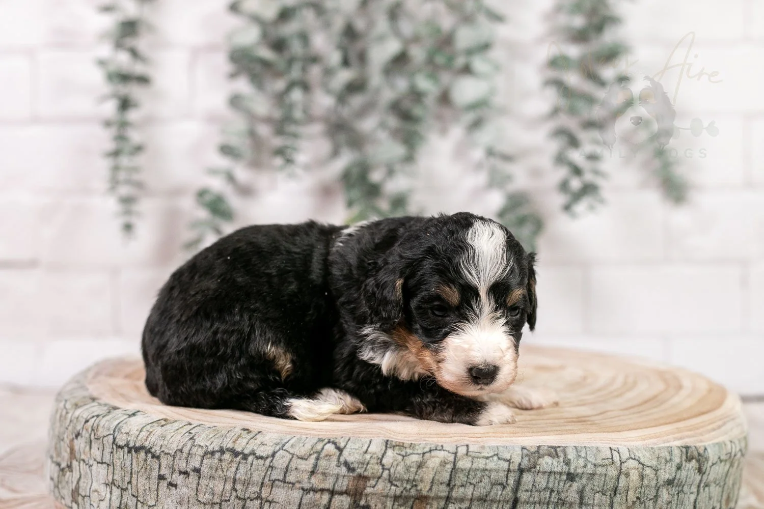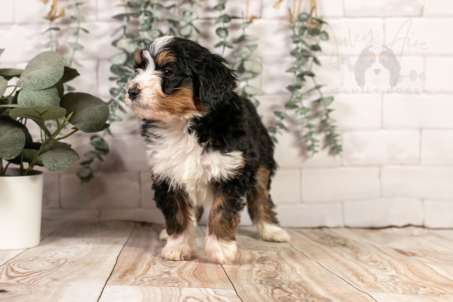 Torch is a striking tri-color male F1 Bernedoodle from our Winter Olympics litter, born on December 25, 2025. He is the result of our calm, loving Lulu and our laid-back, intelligent Winston. Raised in our home with daily interaction from our children and other dogs, Torch is receiving thoughtful early socialization. We expect him to mature into a steady, affectionate family companion in the 70–90 lb range.