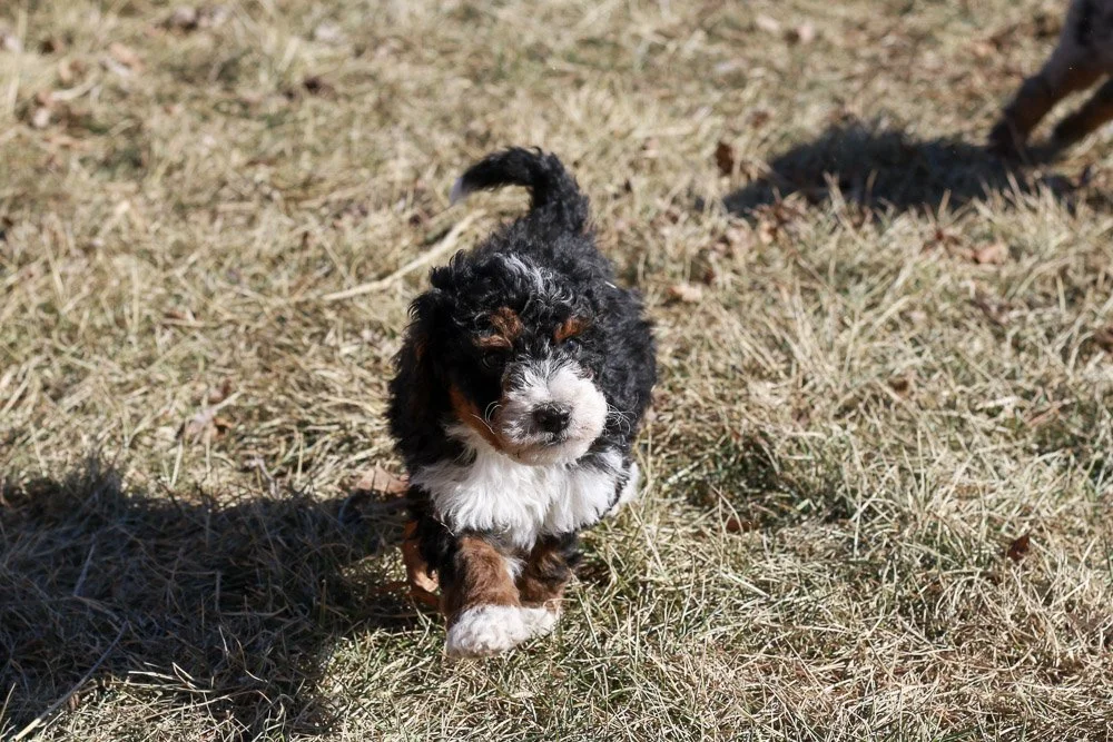 Cedar, the stunning tri-color Bernedoodle puppy, is an eye-catching blend of beautiful black, white, and rust tones that truly make him shine. With an expected adult weight of 40-60 lbs, he’s perfectly sized for family outings and cozy cuddles on the couch. Known for their friendly and affectionate nature, Cedar is an exceptional family pet, eager to bring joy and companionship to his forever home. His playful spirit and intelligence ensure he's not only a delightful addition to any family but also a wonderful friend for both children and adults alike.